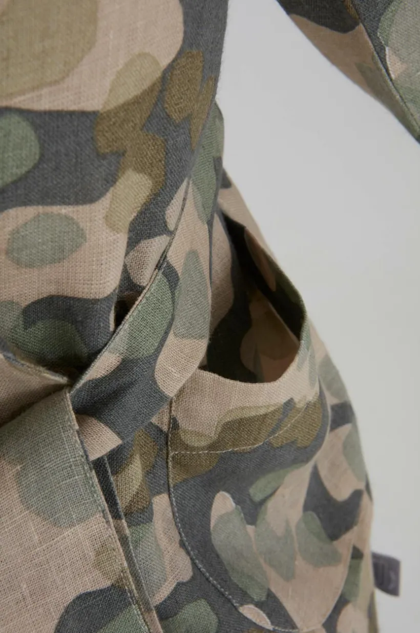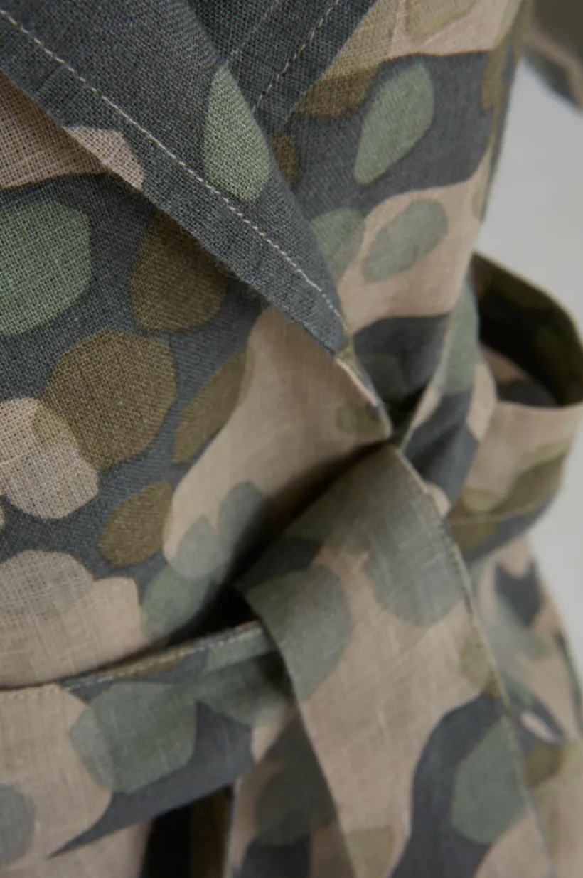 Badrock av naturligt och behagligt linne med tryckt mönster som designats av Maria Carlberg. Den sköna linnekvalitén har tvättats för att bli härligt mjuk och skön. Mysig modell knytskärp i midjan och två framfickor. Vikt 160 g/m². Trådtäthet på 94 tc. (Trådtätheten talar om antalet trådar, thread counts, per kvadrattum i ett tyg. Ju högre trådtäthet desto högre kvalité. Med undantag för linne som ofta vävs glesare för att få den rätta känslan.)