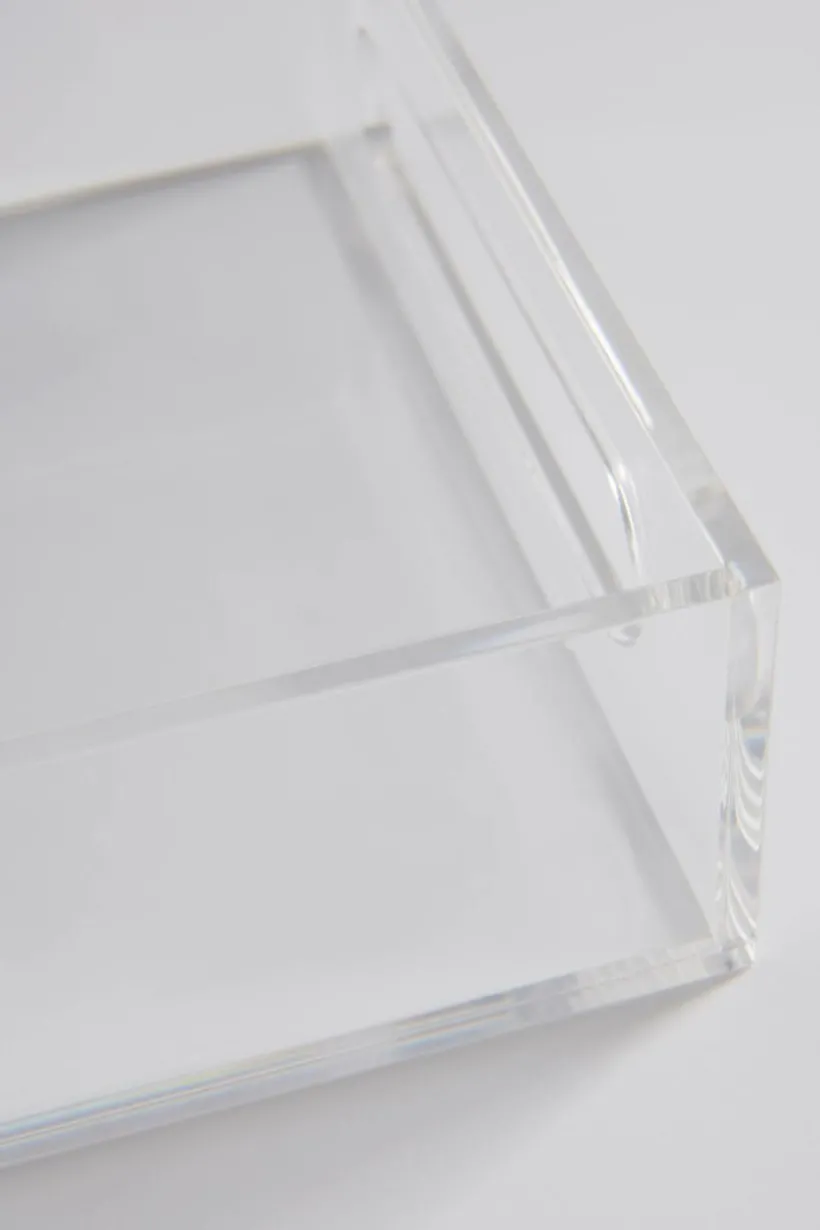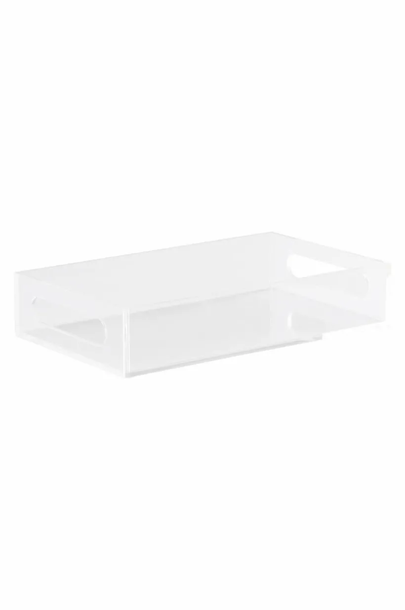 Transparent bricka av akrylglas. Rak och stilren modell med två praktiska handtag, ett på varje kortsida.