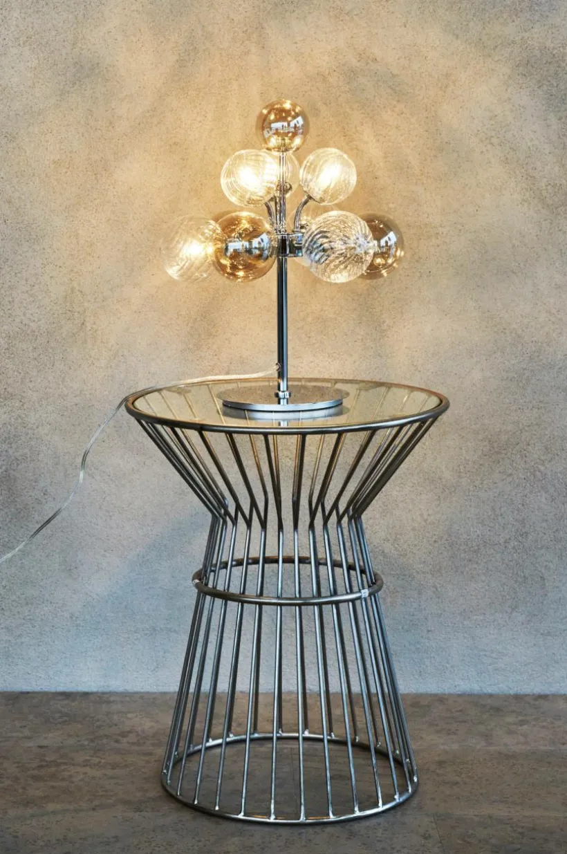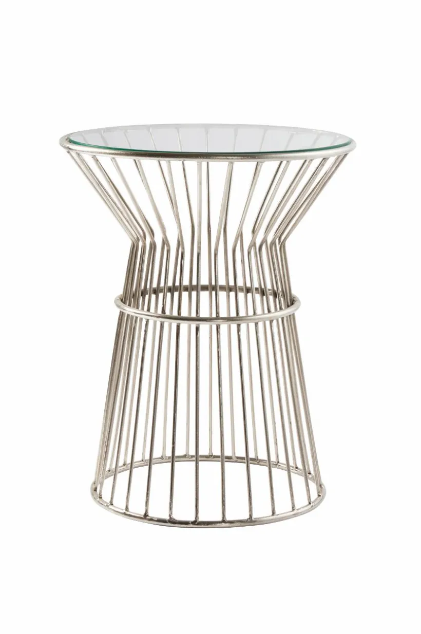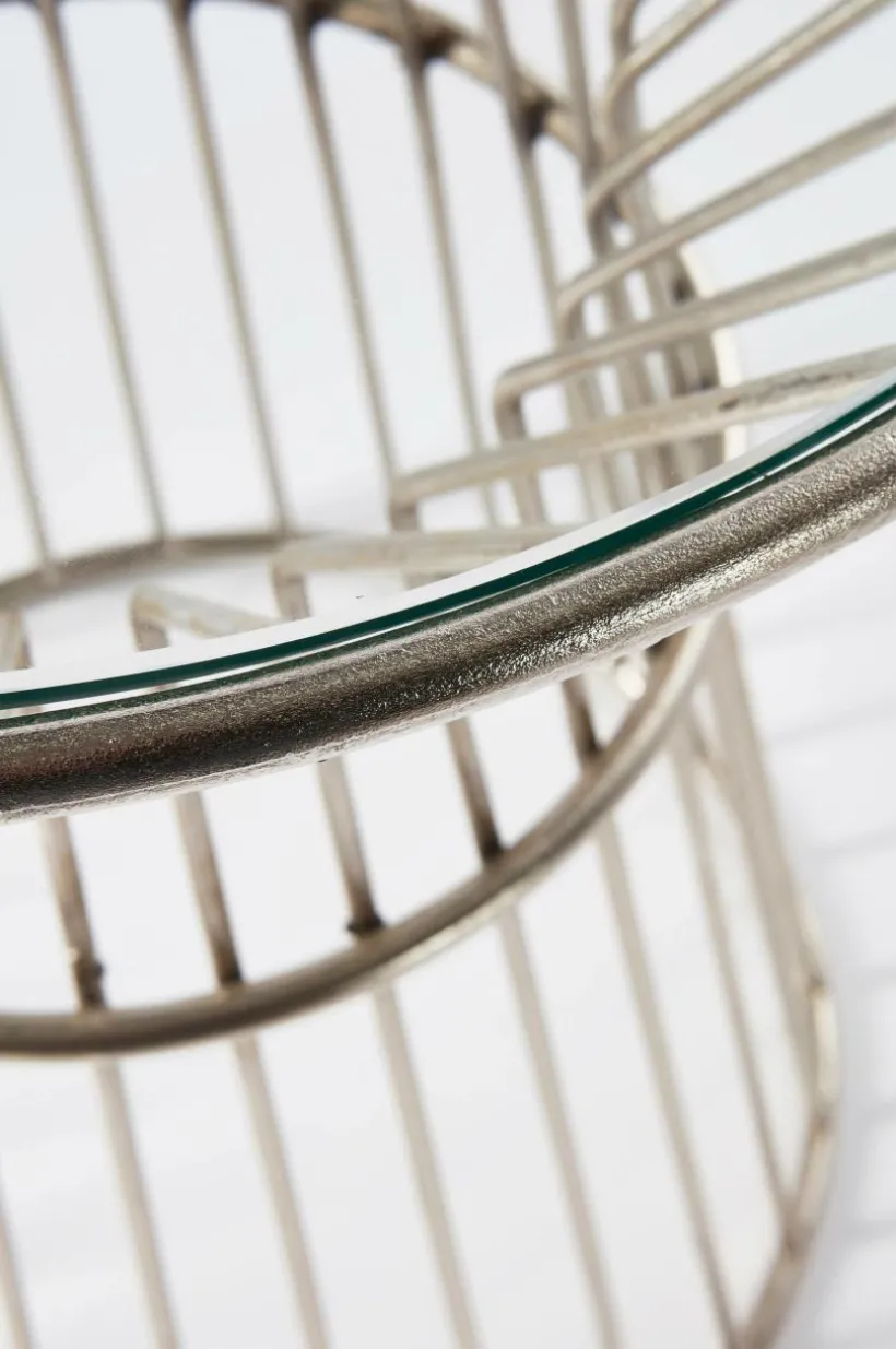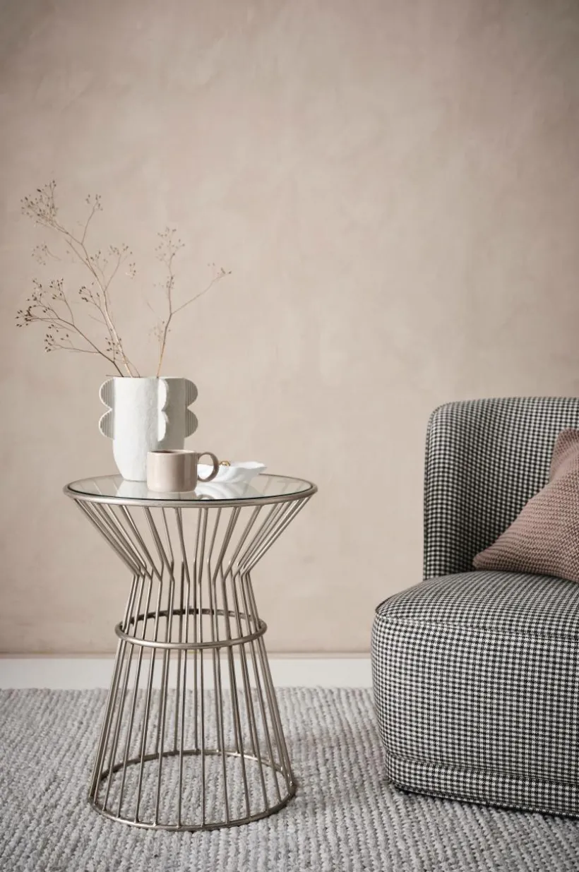 Ett runt sidobord bredvid soffan fulländar ditt vardagsrum. LARINO ger en luftig känsla med bordsskiva av glas och ett trendigt underrede av kromad metall som syns genom bordsskivan.
