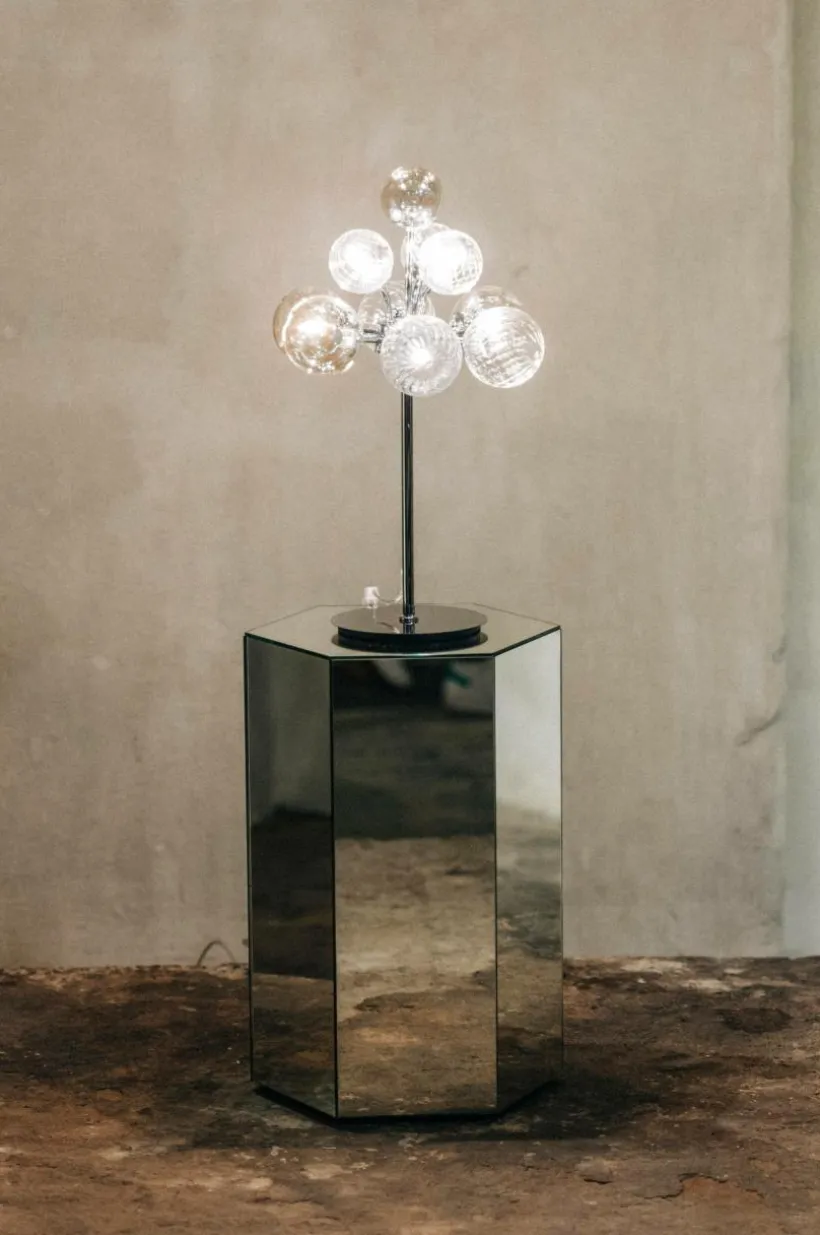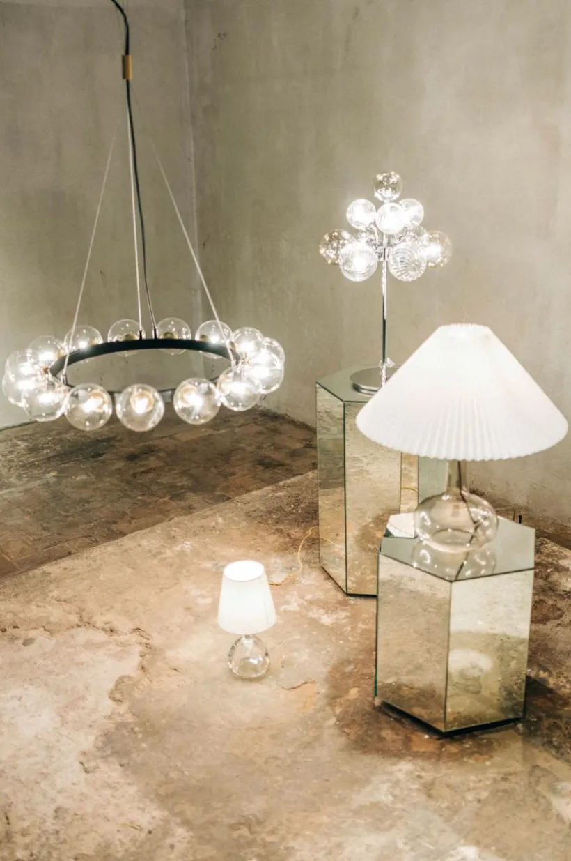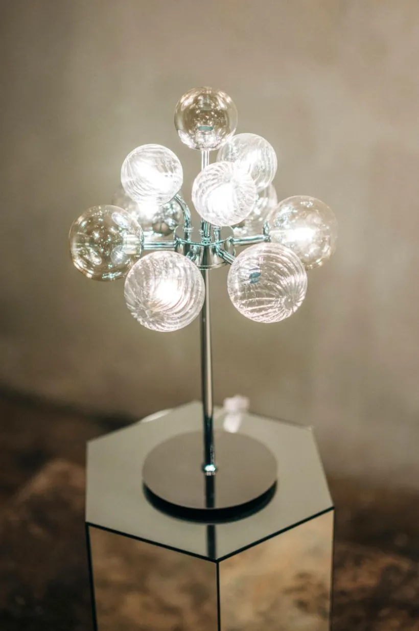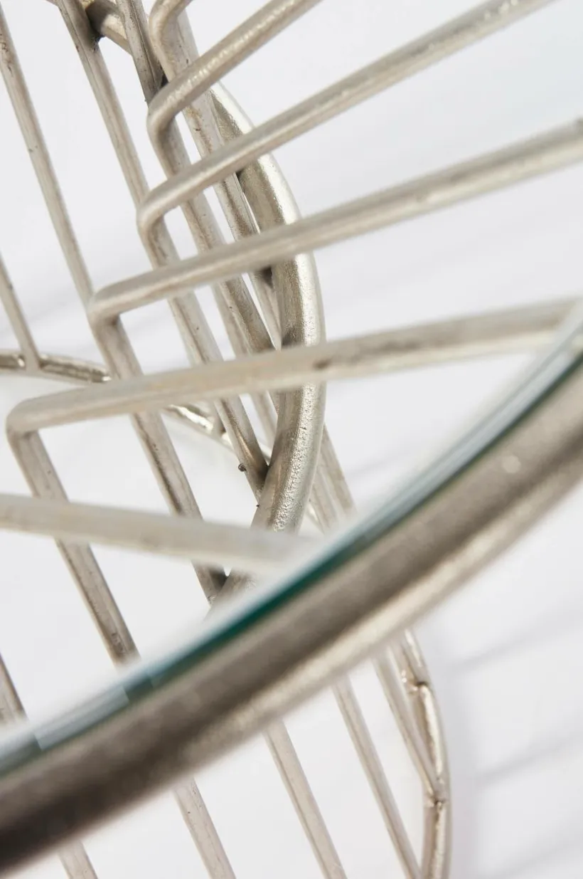Ett runt sidobord bredvid soffan fulländar ditt vardagsrum. LARINO ger en luftig känsla med bordsskiva av glas och ett trendigt underrede av kromad metall som syns genom bordsskivan.