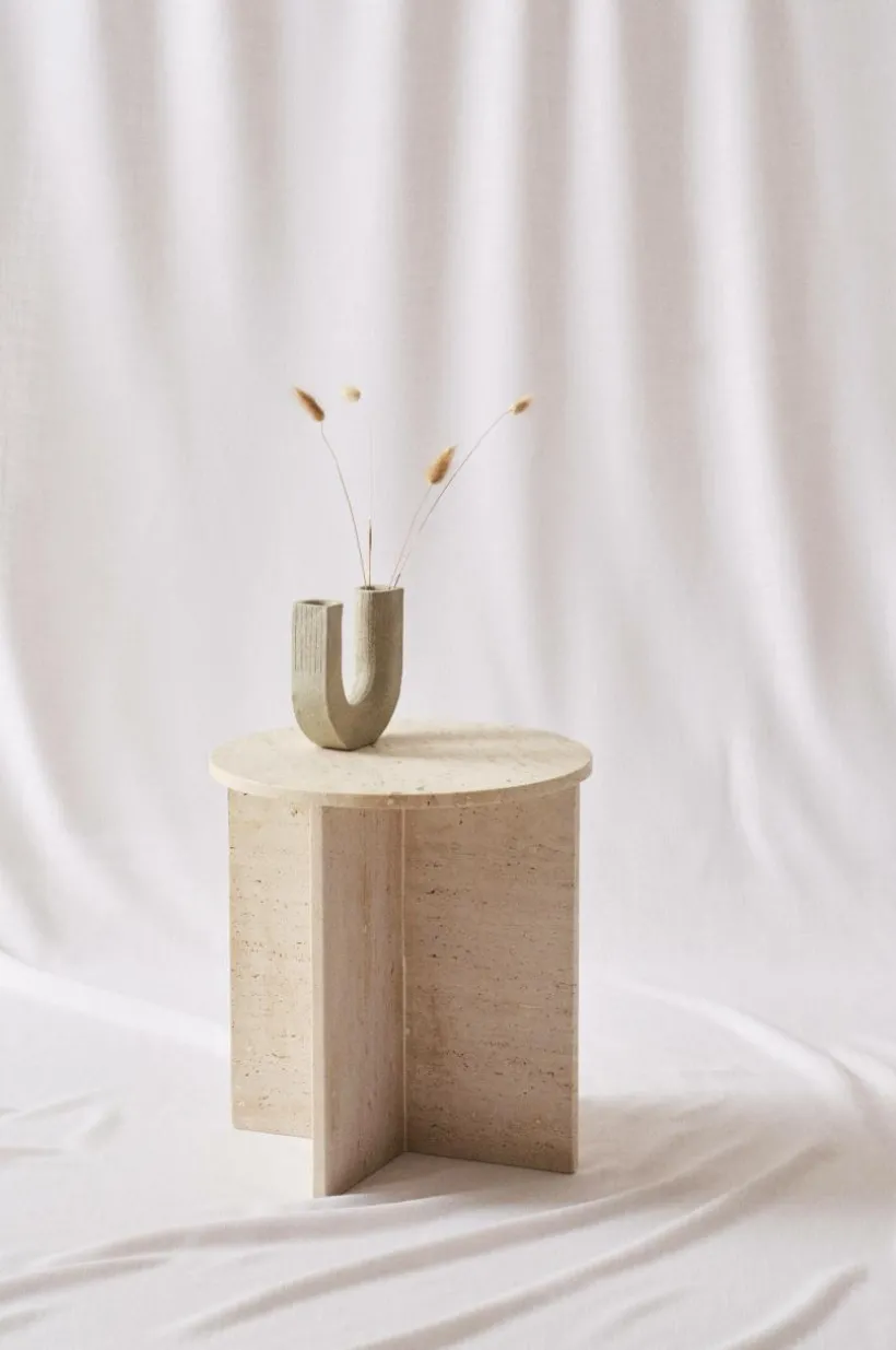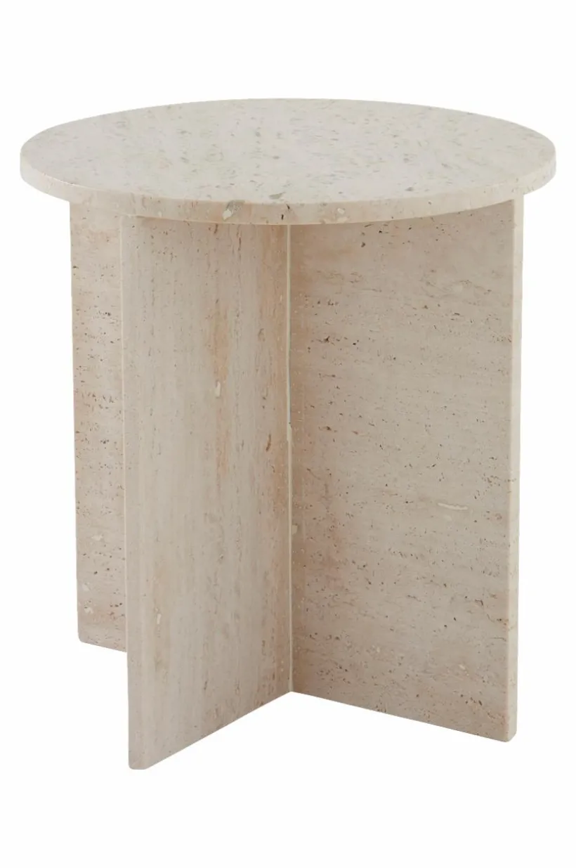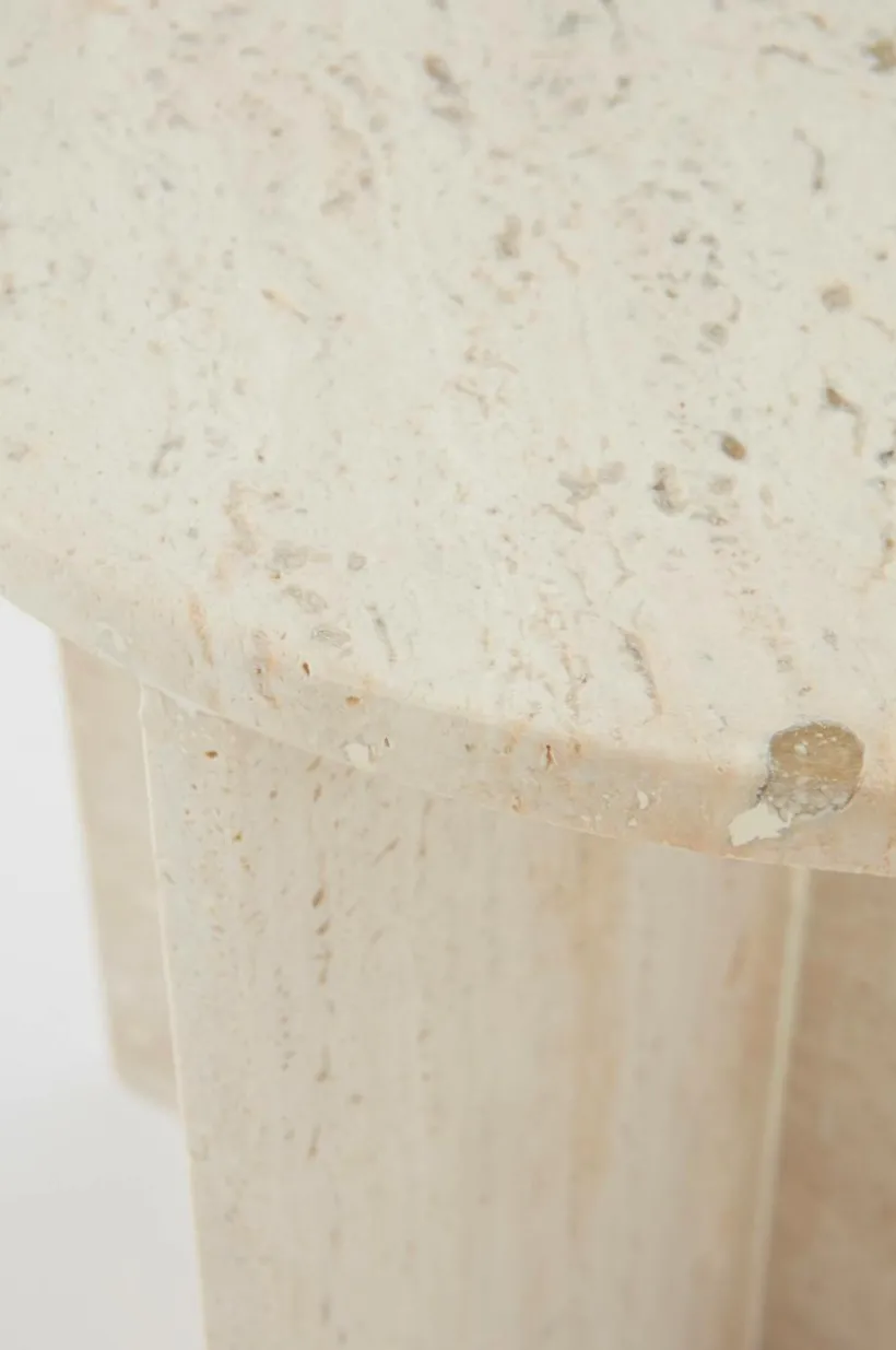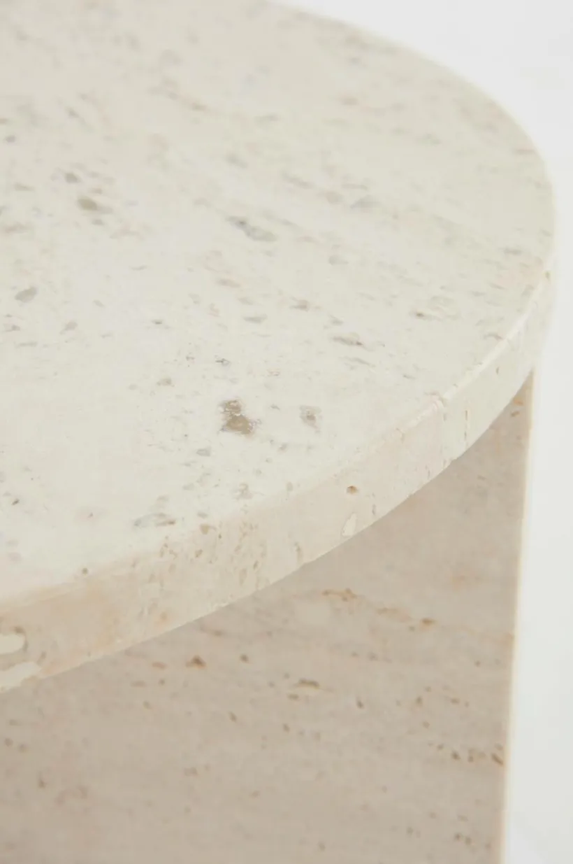 MELFORT är ett runt sidobord av kalksten, underredet är korsformat. Hela bordet är av Travertin vilket är ett naturligt material där små håligheter kan uppstå, den är vackert marmorerad i färgen. Det lilla bordet har både tyngd och stabilitet.