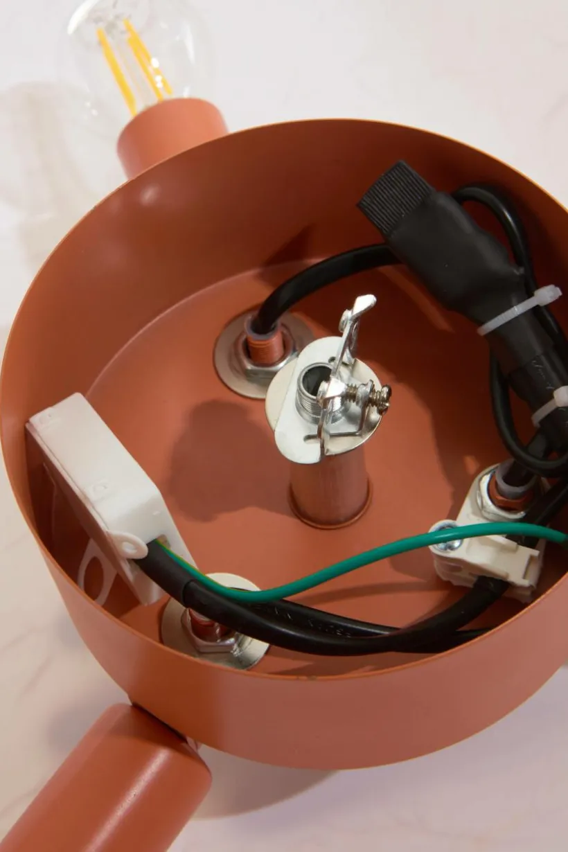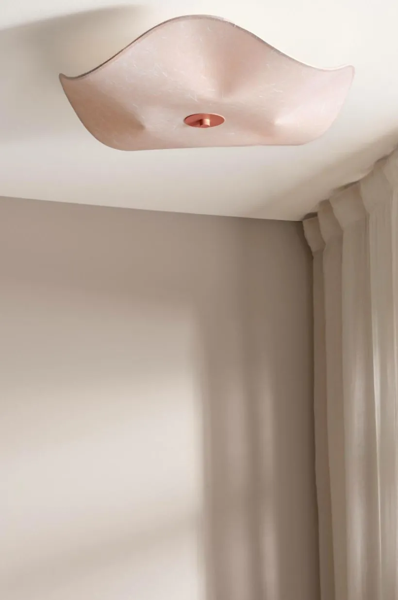 Takplafond med mjukt böljande lampskärm av papper med marmorerad struktur. Lampfästet är av mattsvart metall. Lampan är ojordad, klass 2. På grund av EU-regler behövs en separat takkontakt i vissa länder. Takkontakten ska vara ojordad (klass 2) och köps separat.
