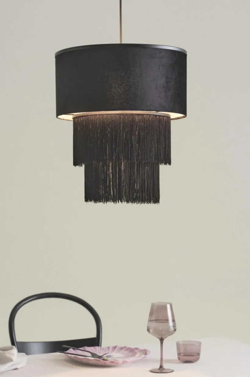 REGENCY VELVET är en oerhört läcker taklampa som väcker uppmärksamhet. Lampan är klädd med sammet och har två etage med lång franskant under skärmen. Stommen är av svart metall och den svarta takkoppen är av plast. Lampan får exklusiv känsla med textilsladd som matchar fransen. Lampan är ojordad, klass 2. På grund av EU-regler behövs en separat takkontakt i vissa länder. Takkontakten ska vara ojordad (klass 2) och köps separat.