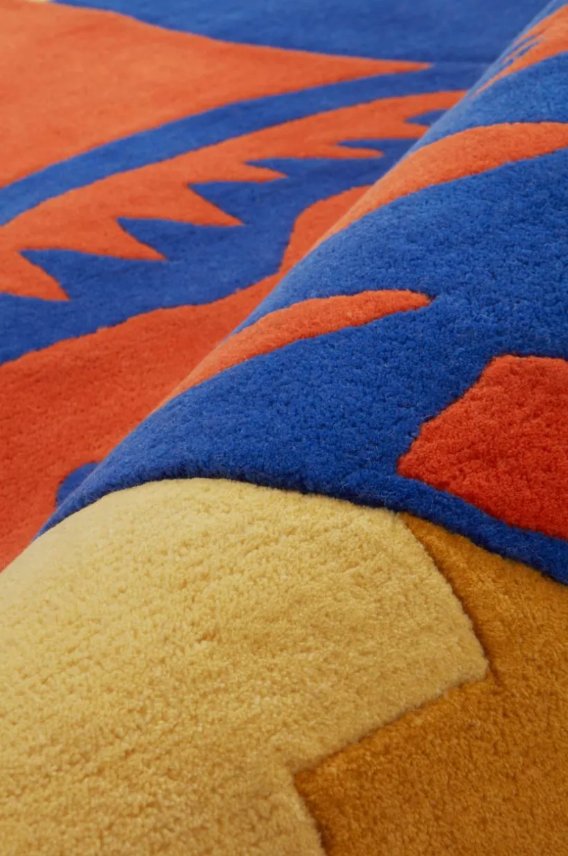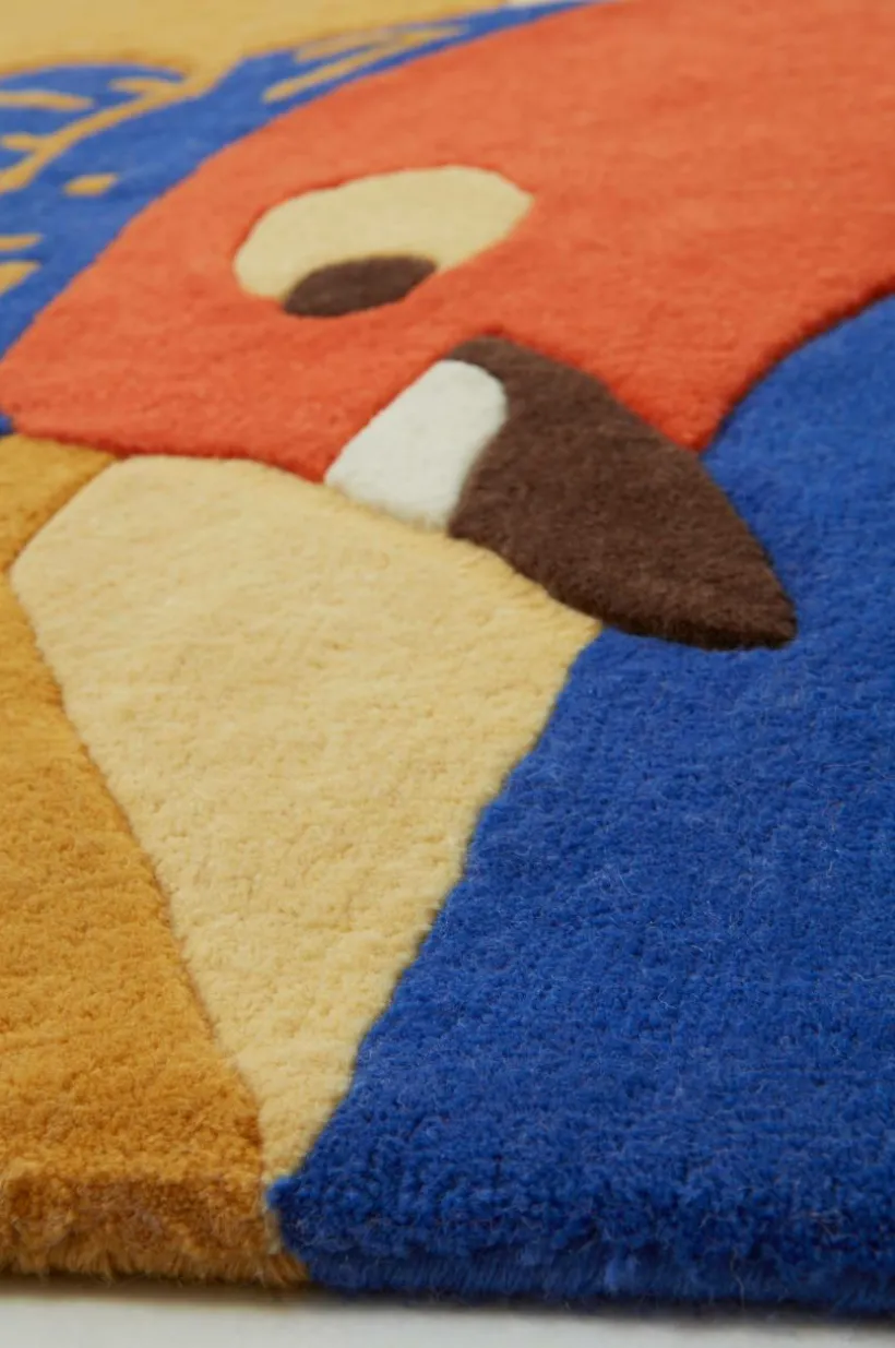 ROOF PIGEON är en ullmatta i unik design av Mikael Selin. Ullmattan är handtuftad och motivet är en stor, färgstark torgduva. Inramningen har inspiration från torget med höghus och trappor. Mönsterbilden är lika abstrakt som den är konkret och kontraster möts. Mjuka, organiska former blandas med kantiga mönster.