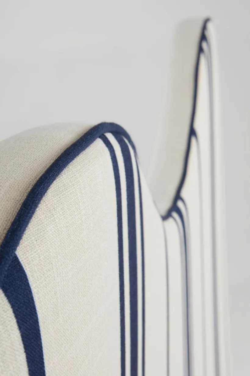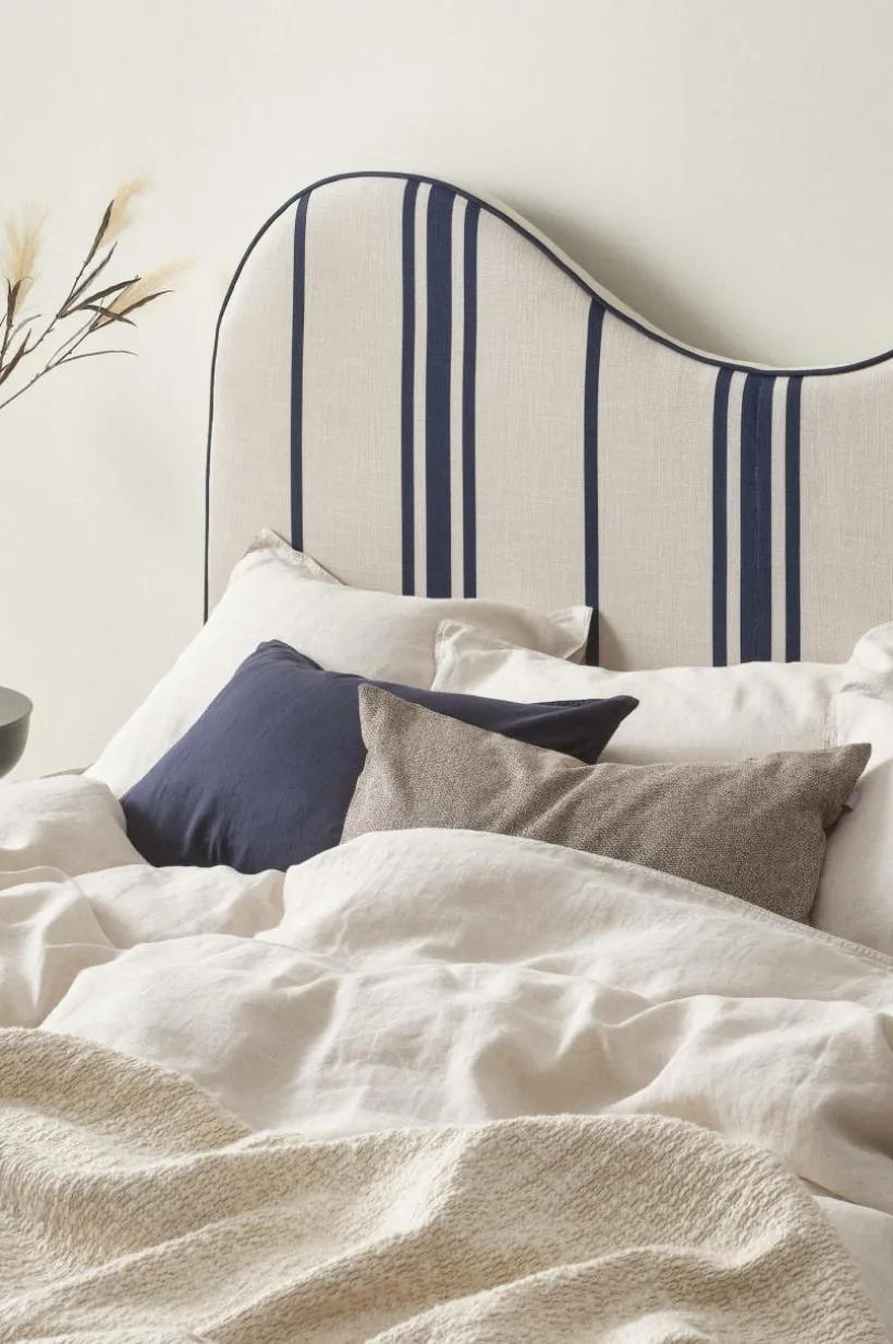 STRÅHOLMEN är en vadderad sänggavel. Formen är mjukt böljande och klädd med randigt tyg av polyester som vävts med snygg slubeffekt. Stommen är av FSC-märkt furu och plywood som kompletterats med mjuk skumfyllning. Tyget är slitstarkt med Martindale på 20000. Överdraget är ej avtagbart. Den vadderade gaveln är behaglig att sitta och luta sig mot samtidigt som den skyddar väggen bakom sängen. Sänggaveln monteras mot väggen bakom din säng eller resårmadrass. Väggfäste medföljer.