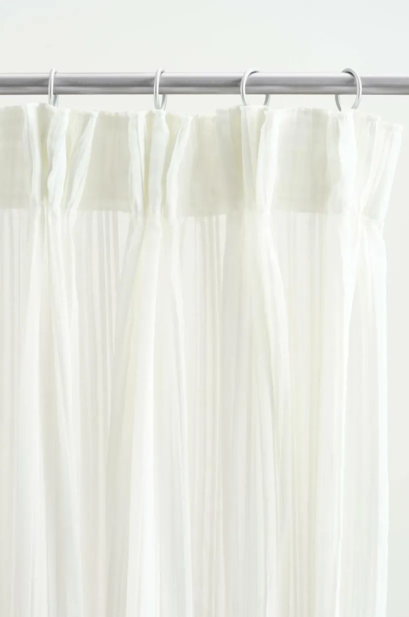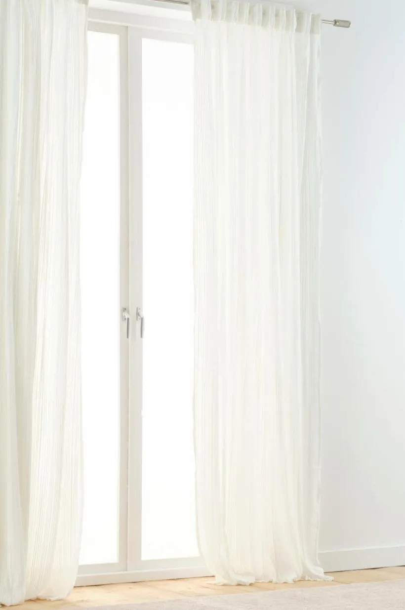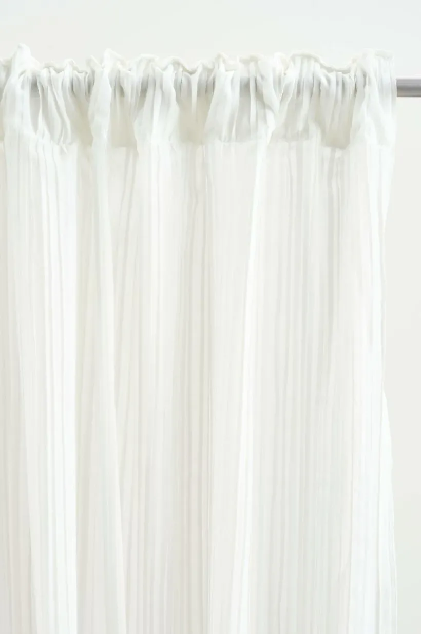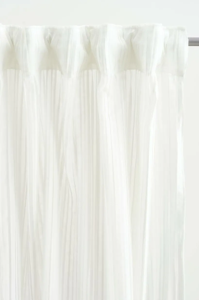 Två gardinlängder i plisserad polyester och med påsytt multifunktionsband. Det skira tyget har små lagda veck som gör längderna speciella. Nederkanten har en tät overlocksöm så att plisseringen får ett smidigt avslut och vecken faller fint. Gardinen kan hängas upp med fingerkrokar, kanal samt dold hälla.