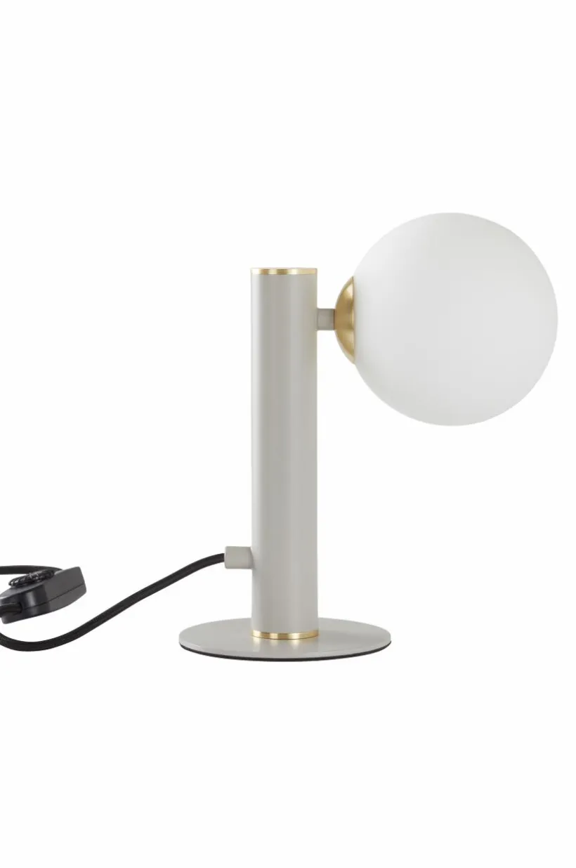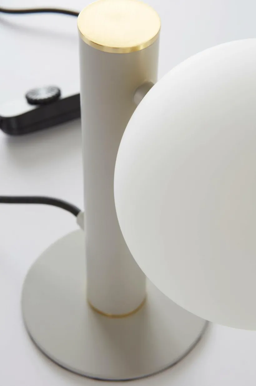 Elegant bordslampa med fot av järn och rund kupa av vitt glas. ABBEY är en spännande mix av modernt och retro. De guldfärgade detaljerna ger en lyxig känsla. Lampan har en dimbar strömbrytare på sladden.