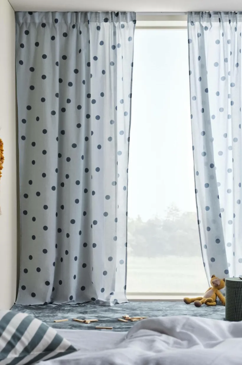 Två gardinlängder i bomull med tryckt prickmönster ton i ton. Prickigt är mönsterbilden som aldrig går ur tiden, en äkta klassiker. Längderna har påsytt multifunktionsband och kan hängas upp med fingerkrokar, kanal samt dold hälla.