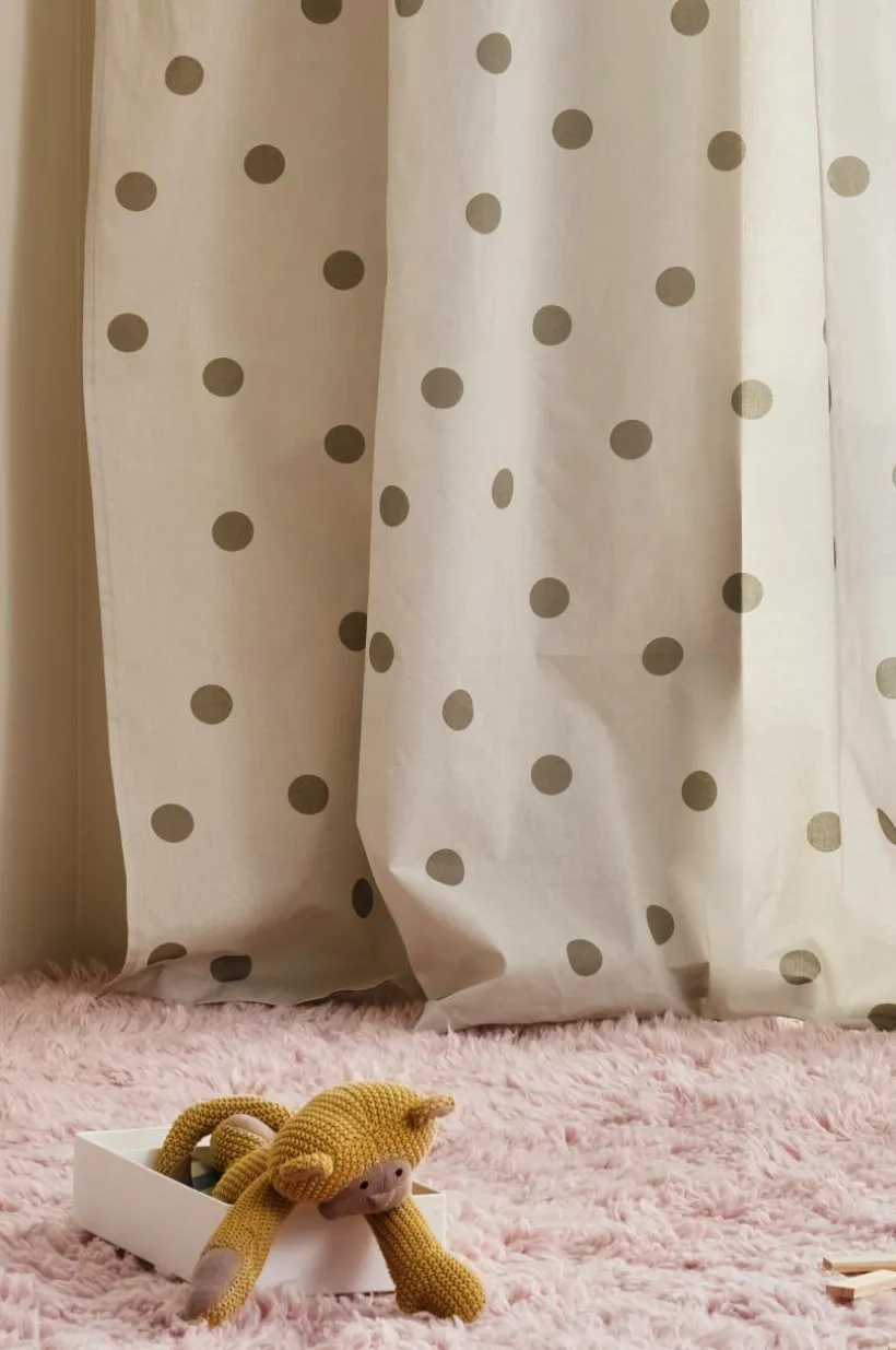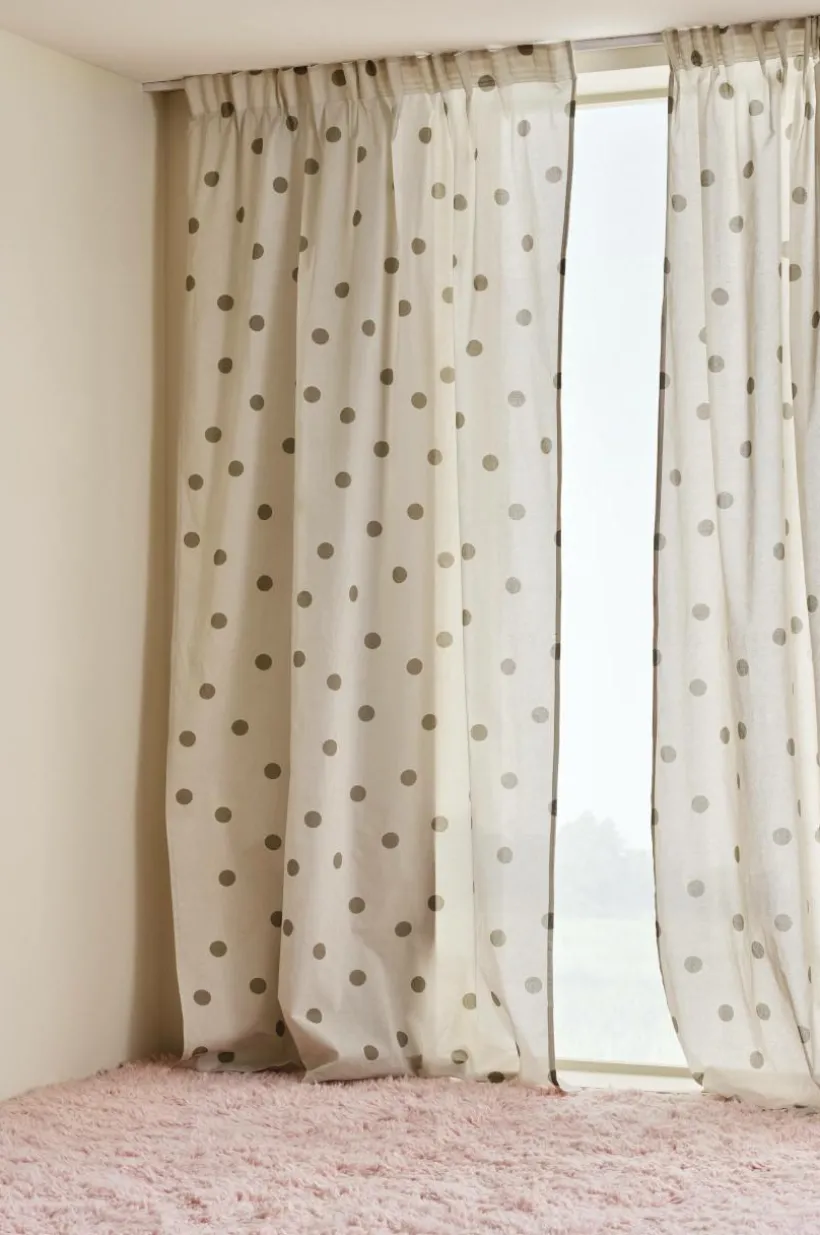 Två gardinlängder i bomull med tryckt prickmönster ton i ton. Prickigt är mönsterbilden som aldrig går ur tiden, en äkta klassiker. Längderna har påsytt multifunktionsband och kan hängas upp med fingerkrokar, kanal samt dold hälla.