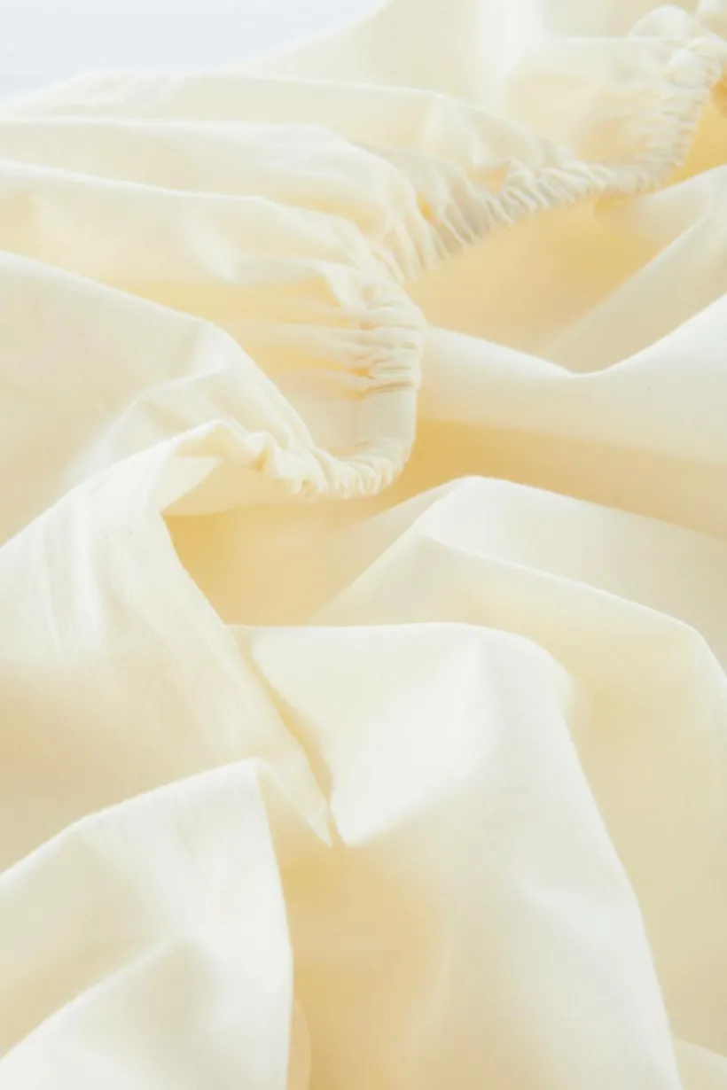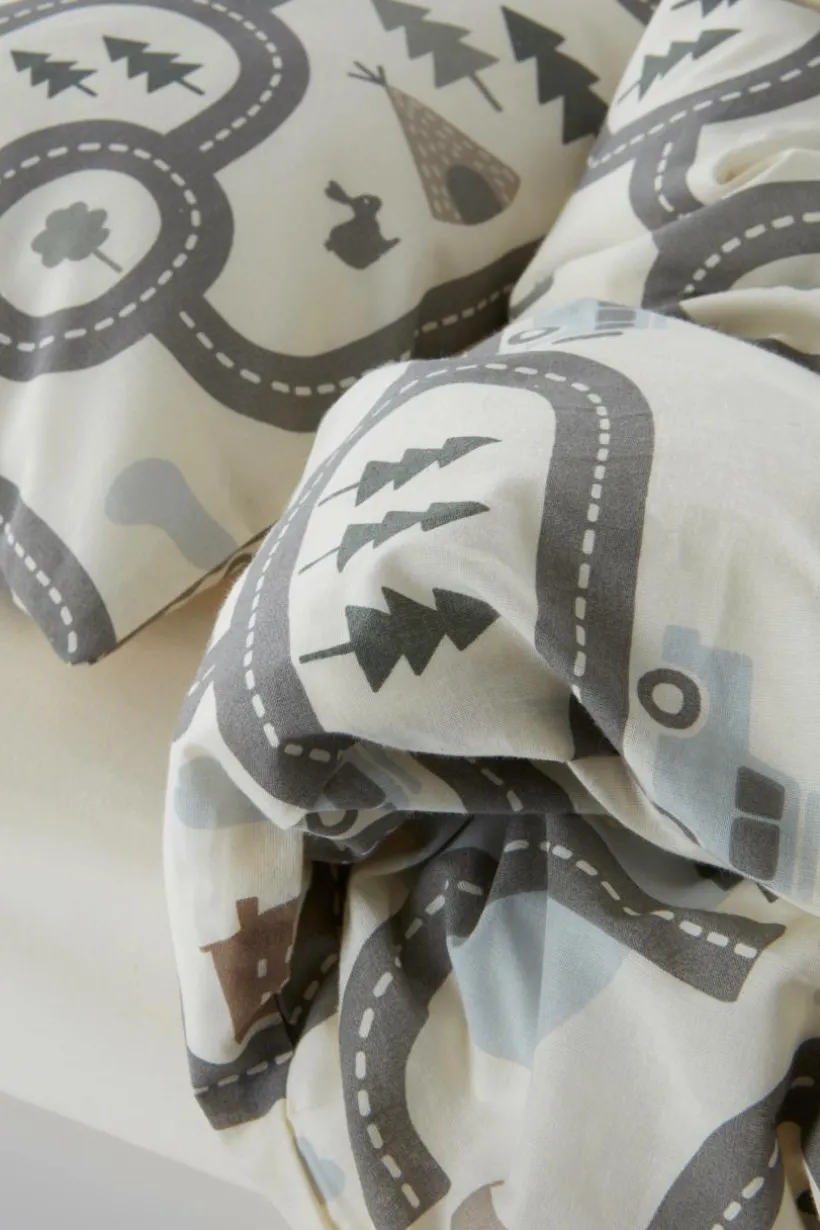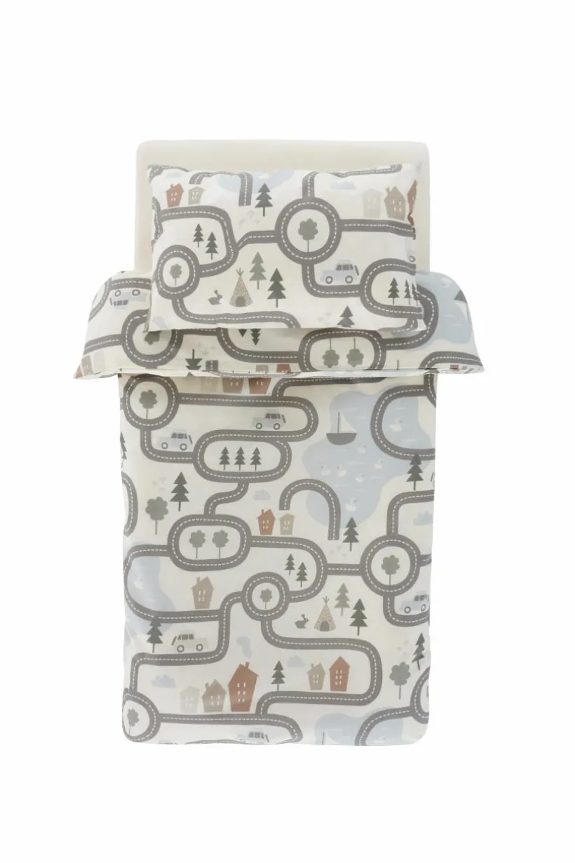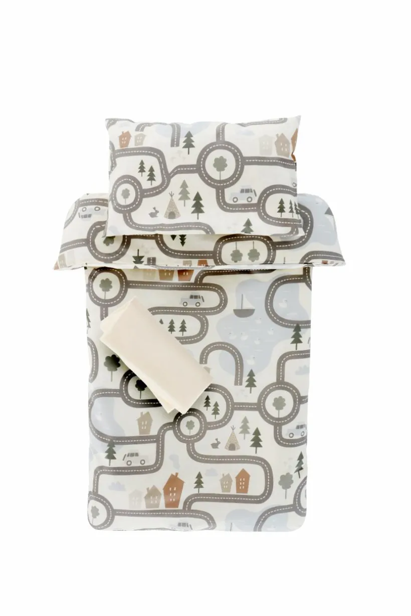 Set med påslakan, örngott och dra-på-lakan i ekologisk bomull. Påslakan och örngott har mönstertryck i milda, harmoniska färger. Motivet är en myllrande stad med vägar, hus, djur och natur. Dra-på-lakanet är enfärgat i en matchande krämvit färg. Resår i hörnen gör att dra-på-lakanet sitter bra på madrassen. Bäddsetet passar till spjälsäng. Ekologisk bomull är skönt att sova i, svalt och mjukt mot huden. Trådtäthet på 144 tc. (Trådtätheten talar om antalet trådar, thread counts, per kvadrattum i ett tyg. Ju högre trådtäthet desto högre kvalité.)