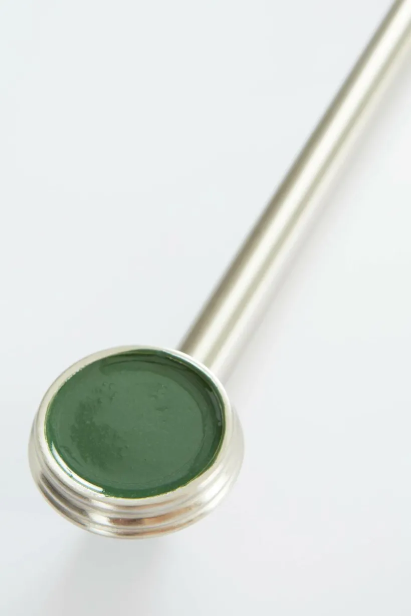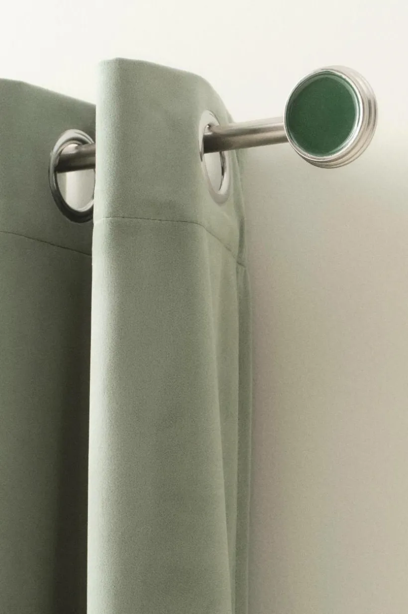 Gardinstång med stång och hållare av järn som är nickelpläterad, änddekorerna är av aluminium med emaljerad mitt. AMI är ett komplett gardinstångsset med runda färgstarka knoppar, emaljen är vackert grön. Gardinstången har justerbar längd så att du inte behöver ha exakt standardmått på ditt fönster. Reglerbara väggfästen gör att du själv kan ställa in väggavståndet 10-12 cm. Ändknopparna skruvas på gardinstången. Tre väggfästen, skruvar och plugg ingår. Observera att det alltid är underlaget som bestämmer vilken typ av infästning som är bäst lämpad för montering.