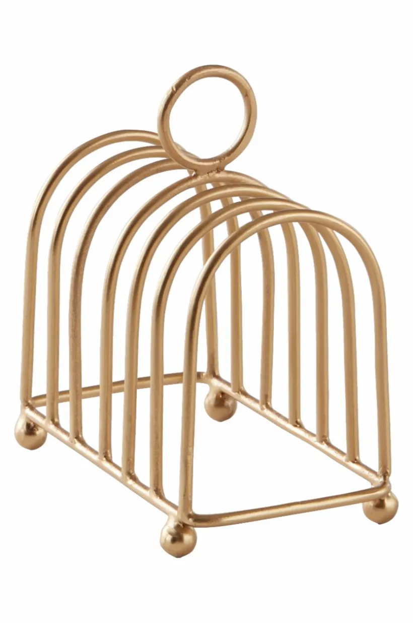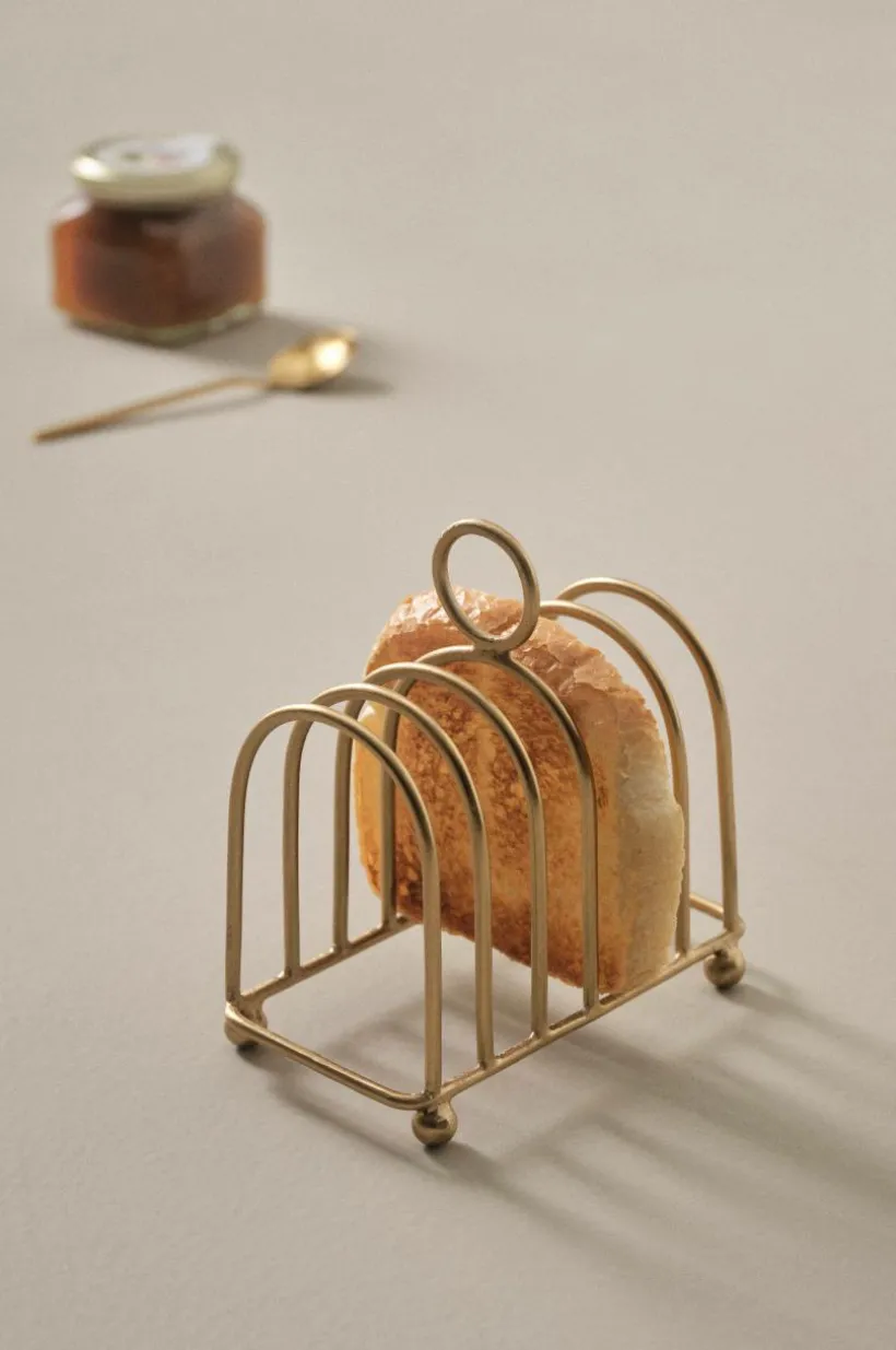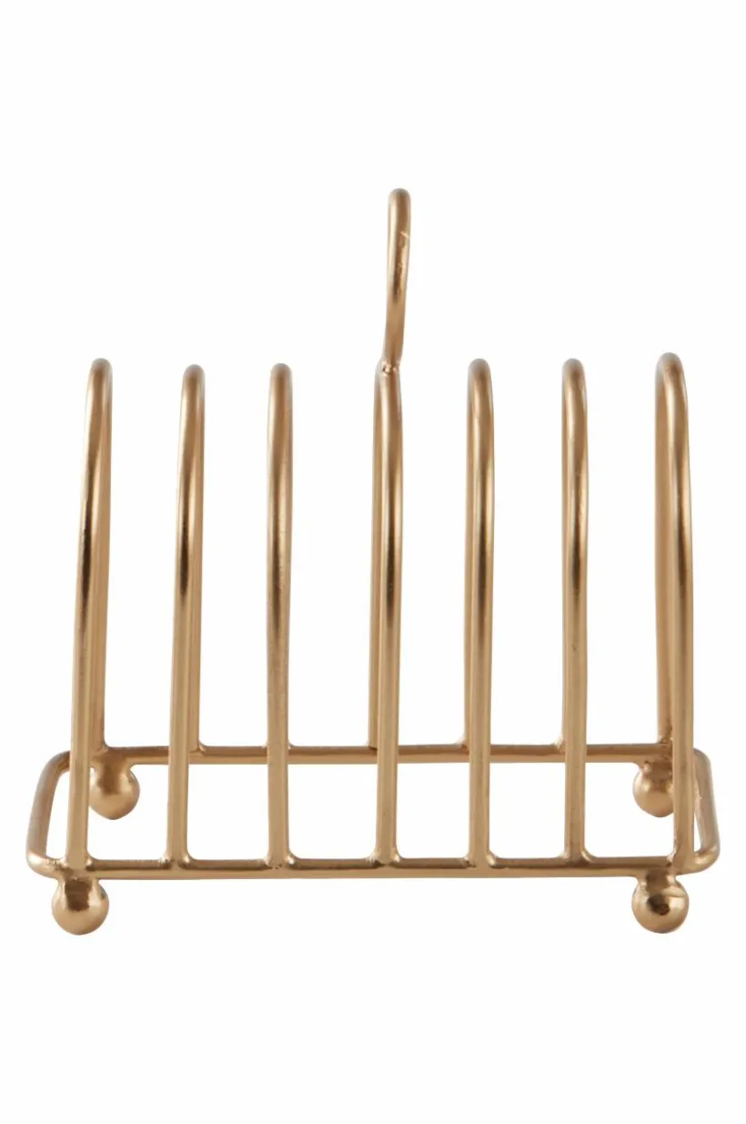 Brödställ av järn som ger härlig tyngd och känsla. Brödstället gör frukostdukningen underbart klassisk och det rymmer sex rostade skivor. Runda små tassar gör att brödet kommer upp lite från bordet. Med ringen på toppen lyfter du lätt brödskivorna för att bjuda övriga runt bordet. Metallen har guldfärgad plätering.