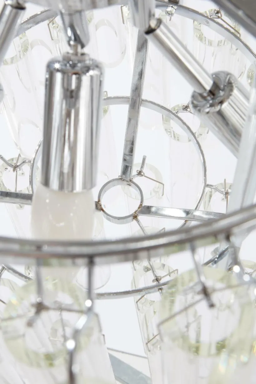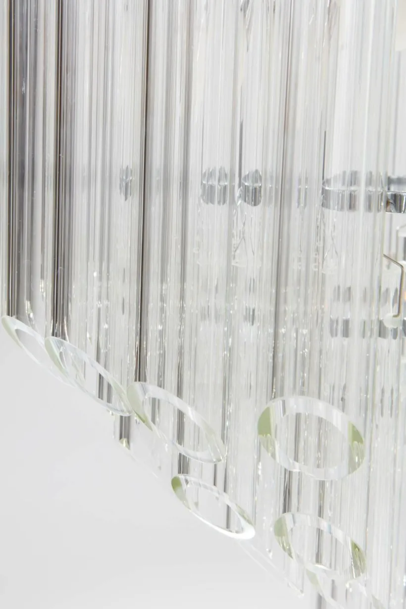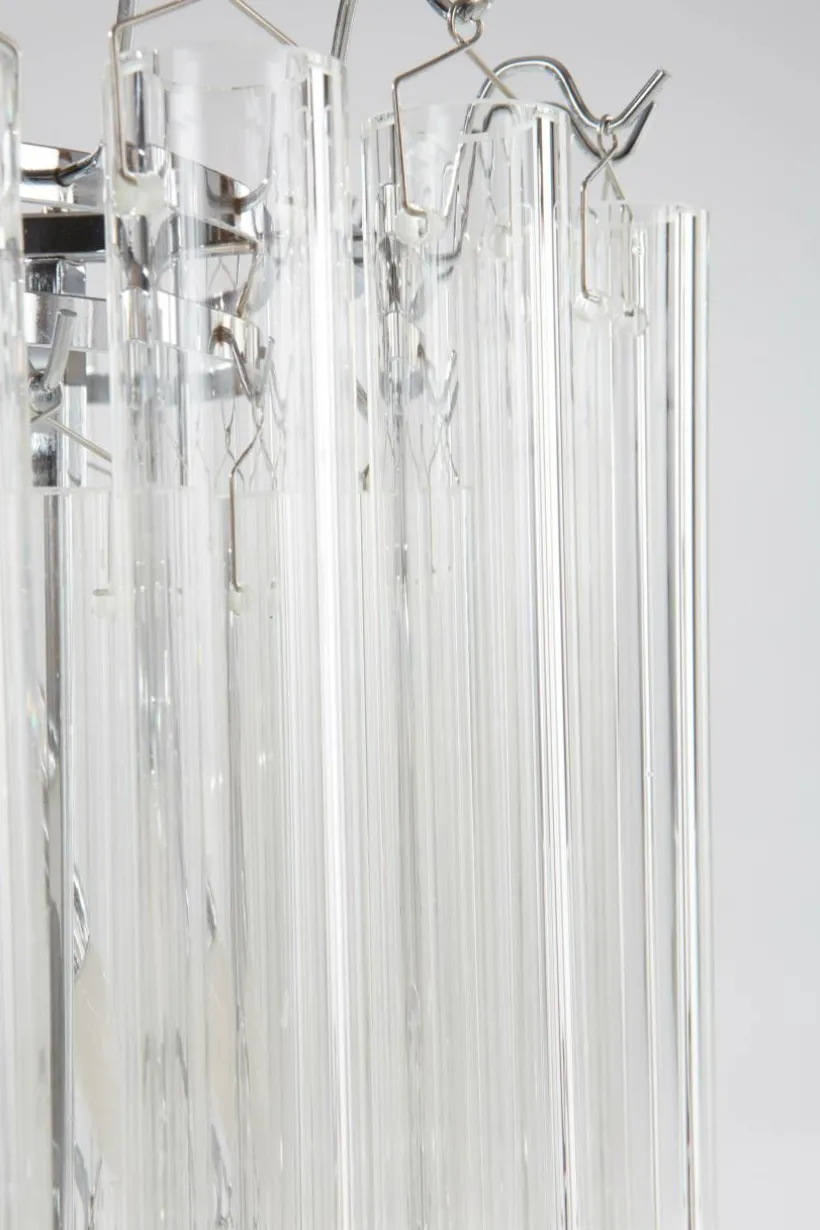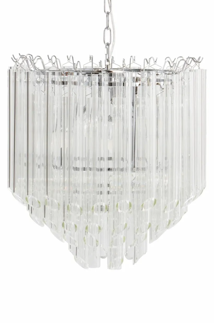 Taklampa som består av glasstavar i flera våningar, stommen är av kromfärgad järn. Stavarna av glas ger lampan fint sken. Lampan hänger i en kedja med justerbar längd.