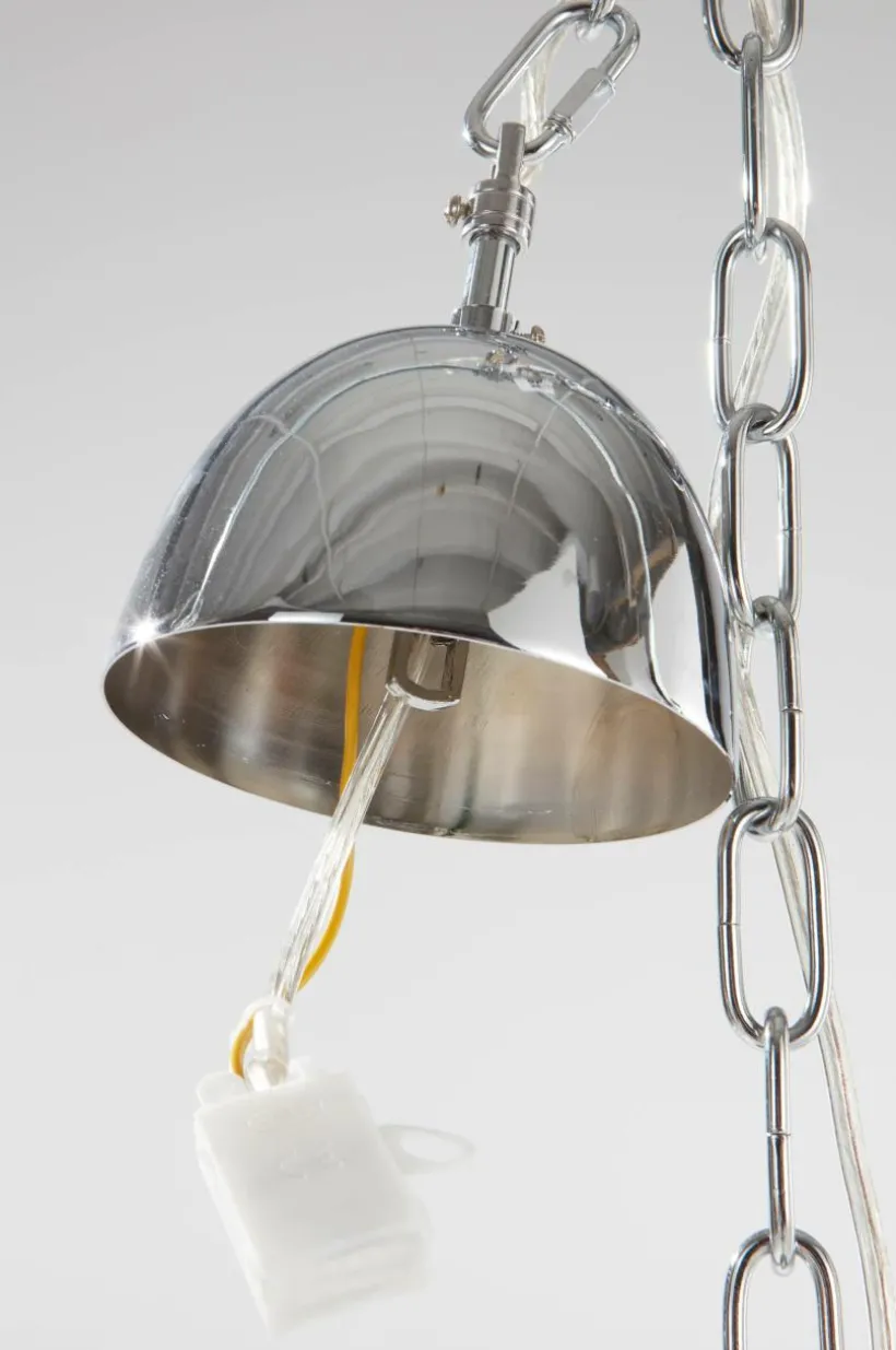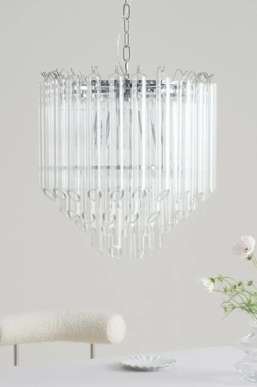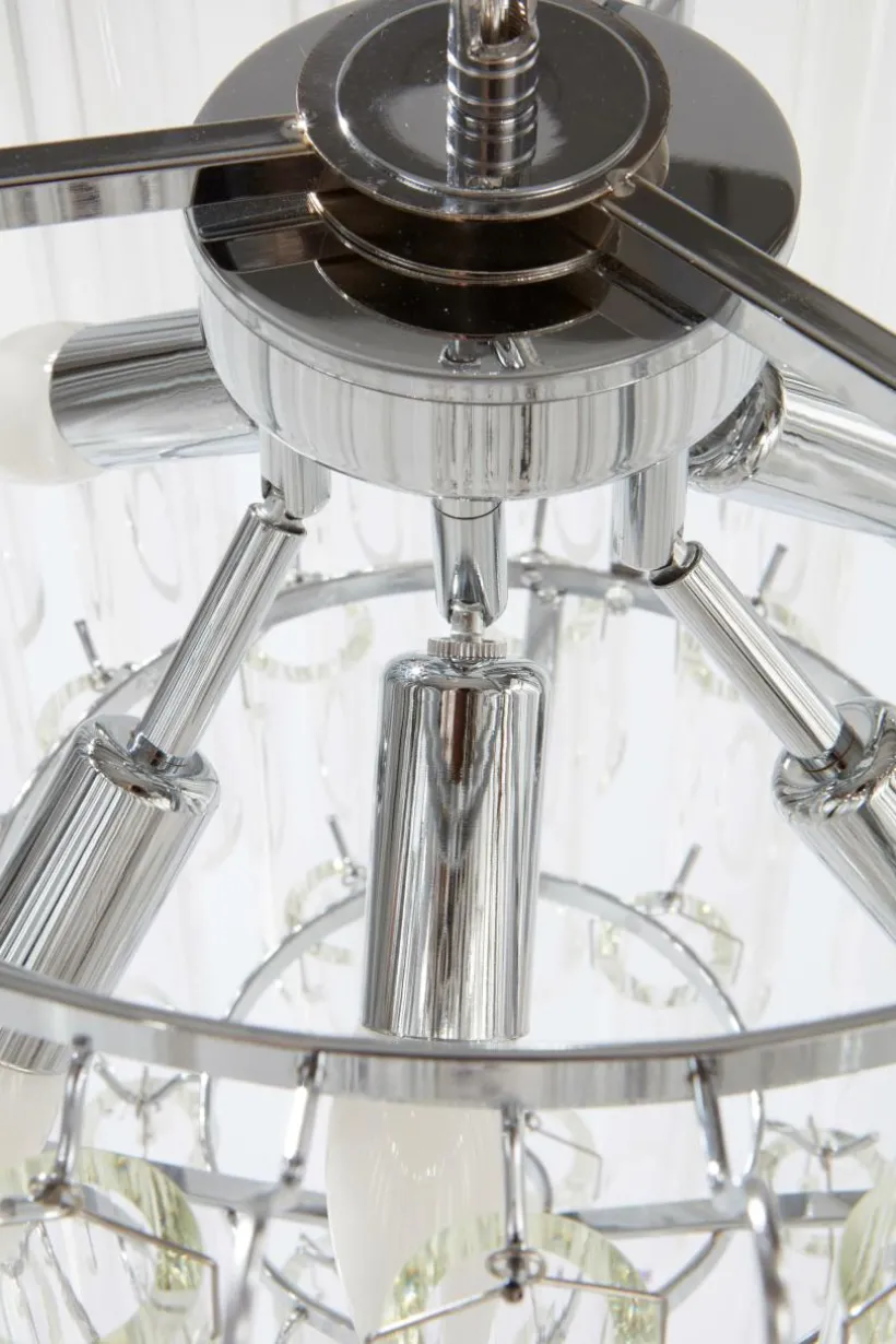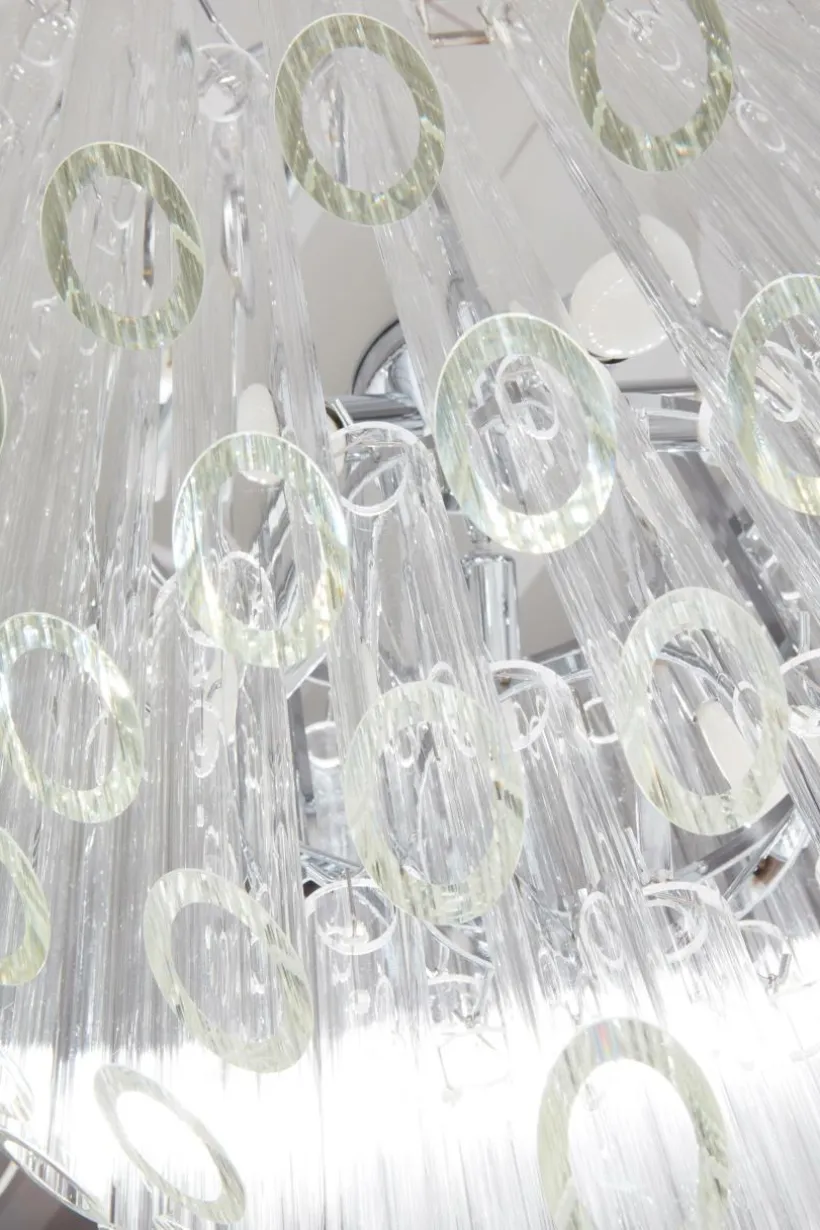 Taklampa som består av glasstavar i flera våningar, stommen är av kromfärgad järn. Stavarna av glas ger lampan fint sken. Lampan hänger i en kedja med justerbar längd.