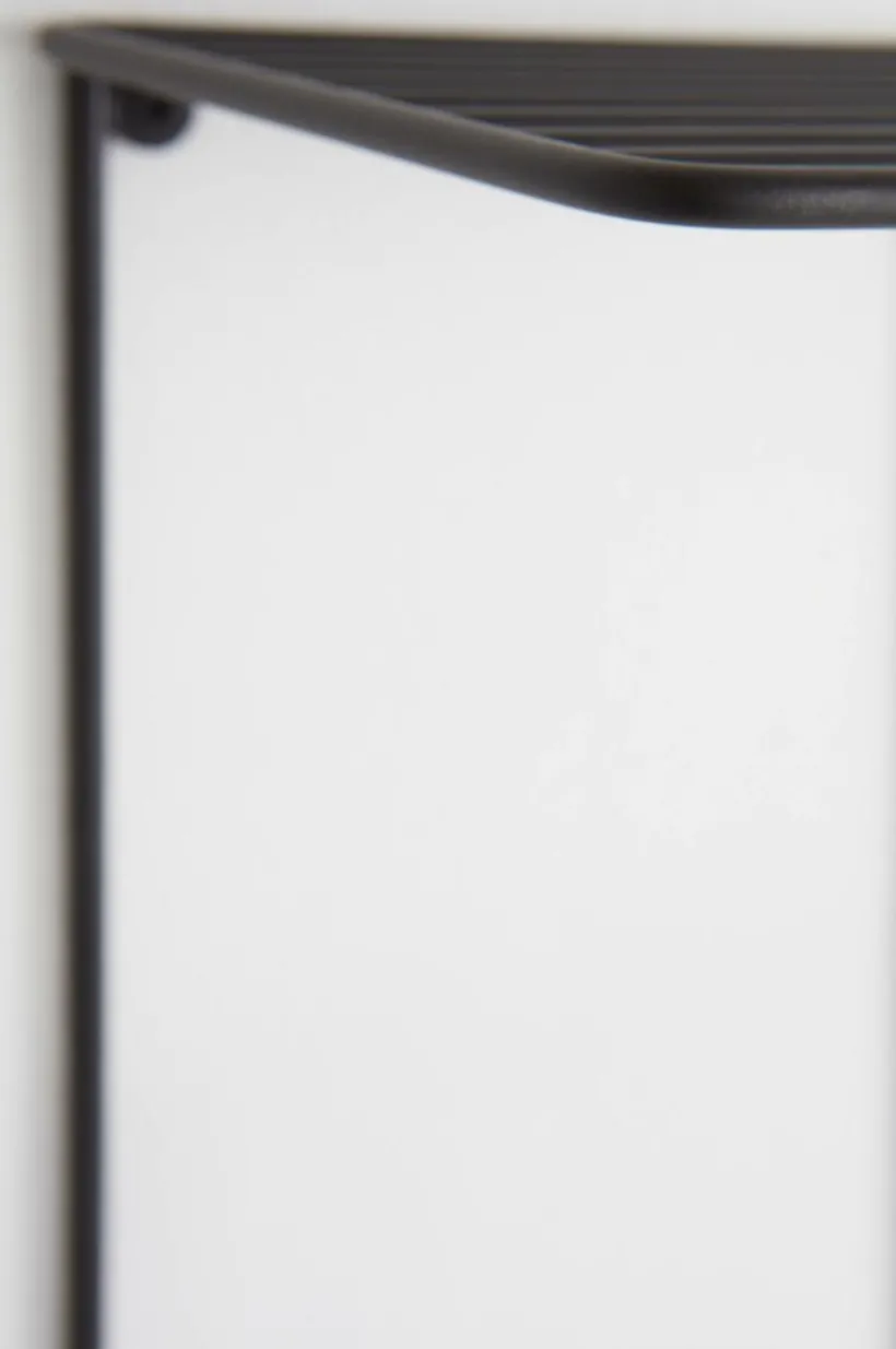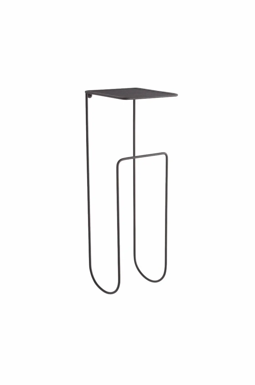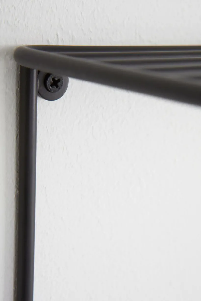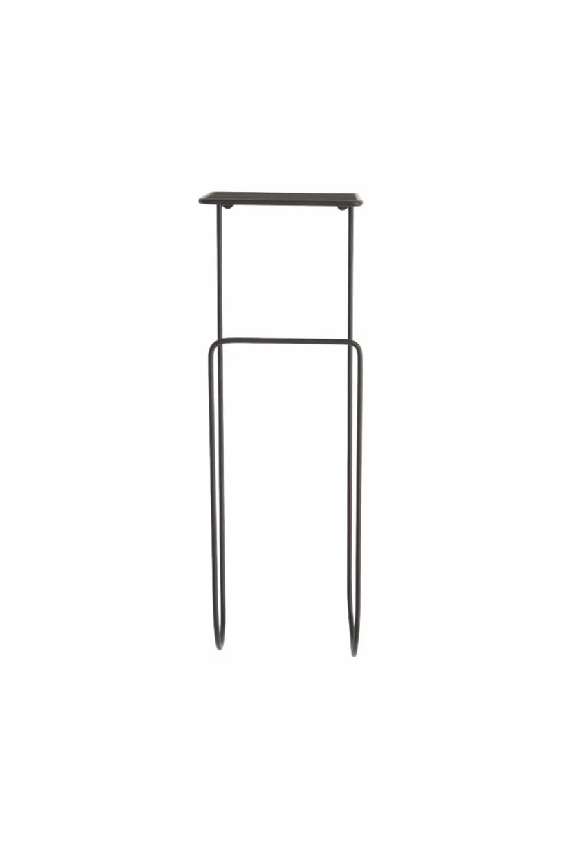 Handdukshängare av metall med gallerhylla upptill.