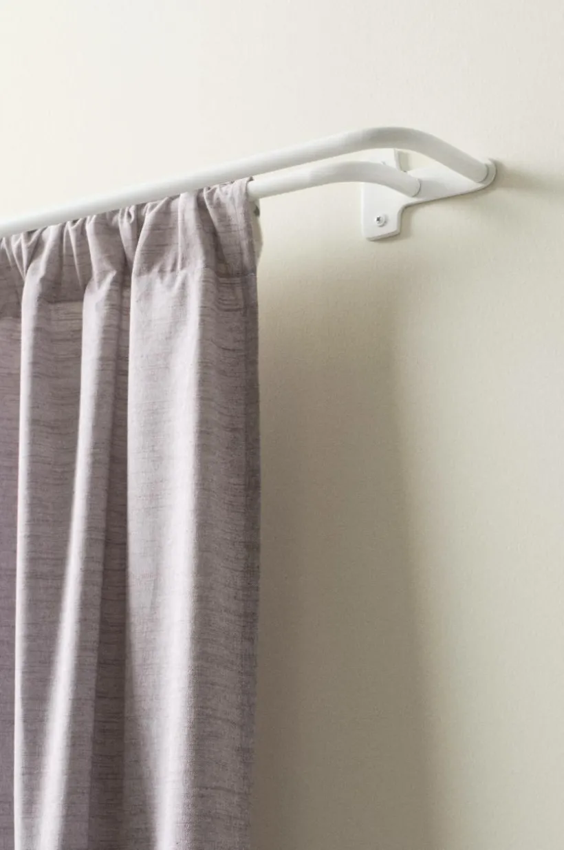 Gardinstången har justerbar längd. Två väggfästen och ett mittenfäste. Mittenfästet måste sättas upp för att hålla stången stabilt på plats. Mittenfästet är av järn.