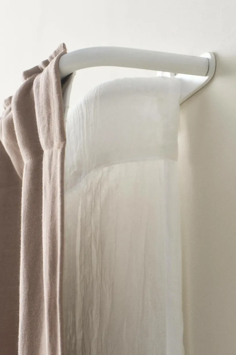 Gardinstång av aluminium. Gardinstången har rundade hörn och fäster mot väggen vilket gör att den passar extra bra tillsammans med mörkläggningsgardiner då ljuset stängs ute även vid sidorna. Gardinstången har således inga ändknoppar utan gardinen får ett mjukt avslut in mot väggen. BAY är dubbel vilket innebär att du kan ha en längd framför och en längd bakom. Det kan vara praktiskt om du vill få in mer ljus dagtid. Det kan också vara snyggt om du vill ha en skirare gardin framför mörkläggningsgardinen.