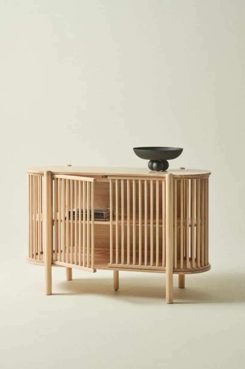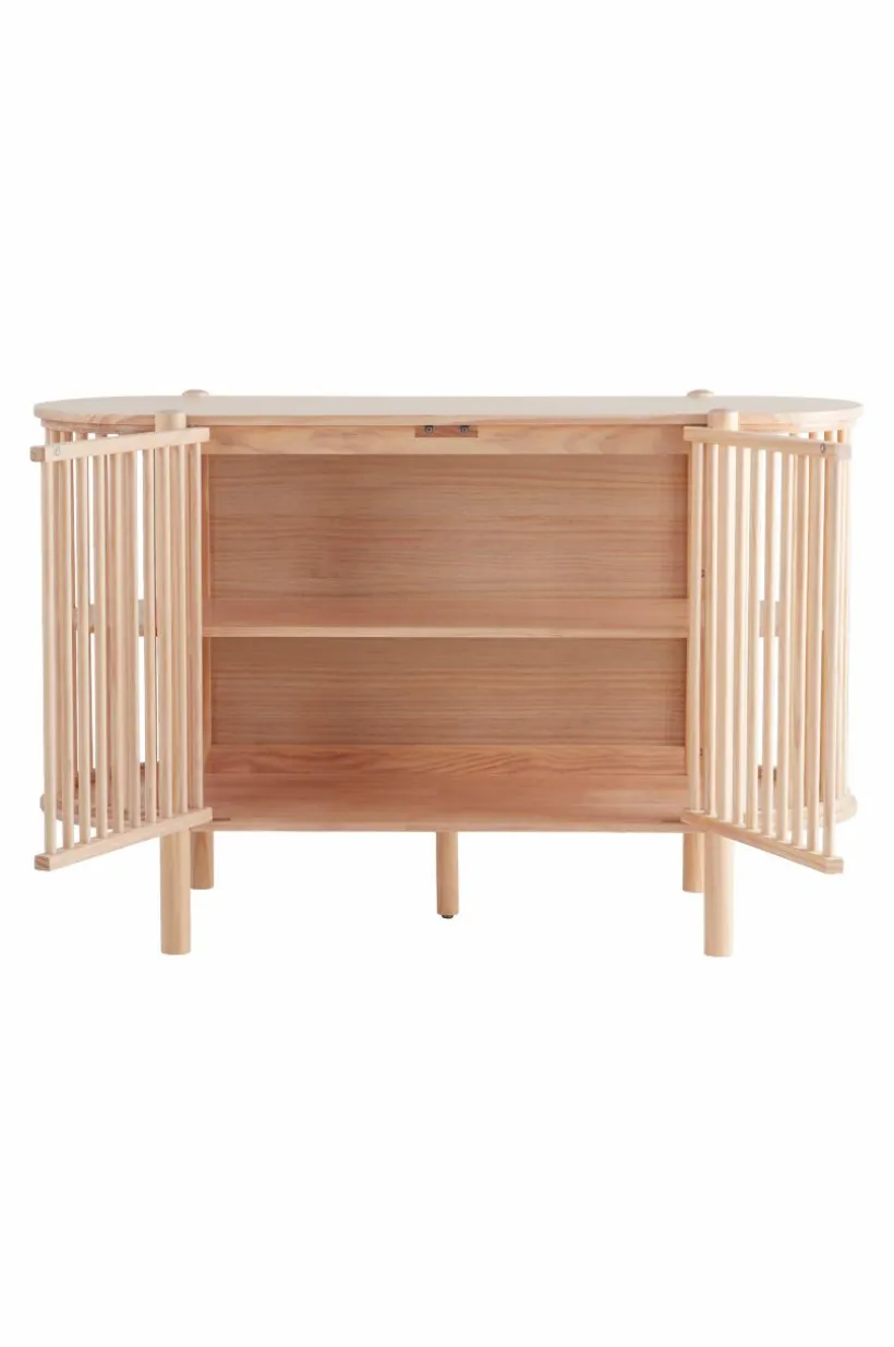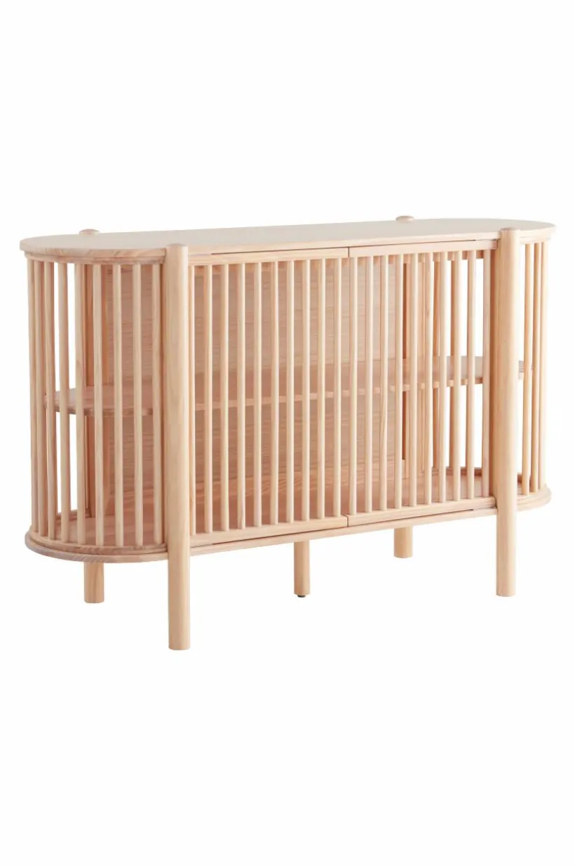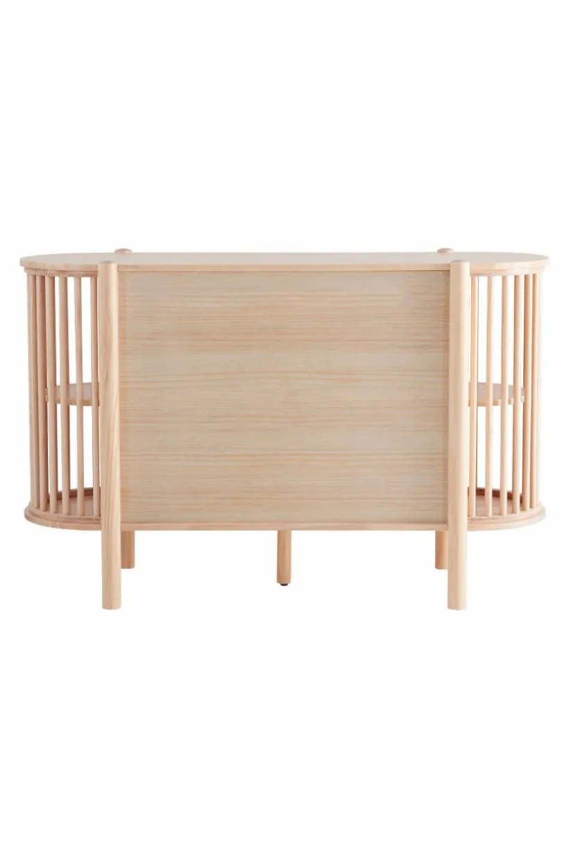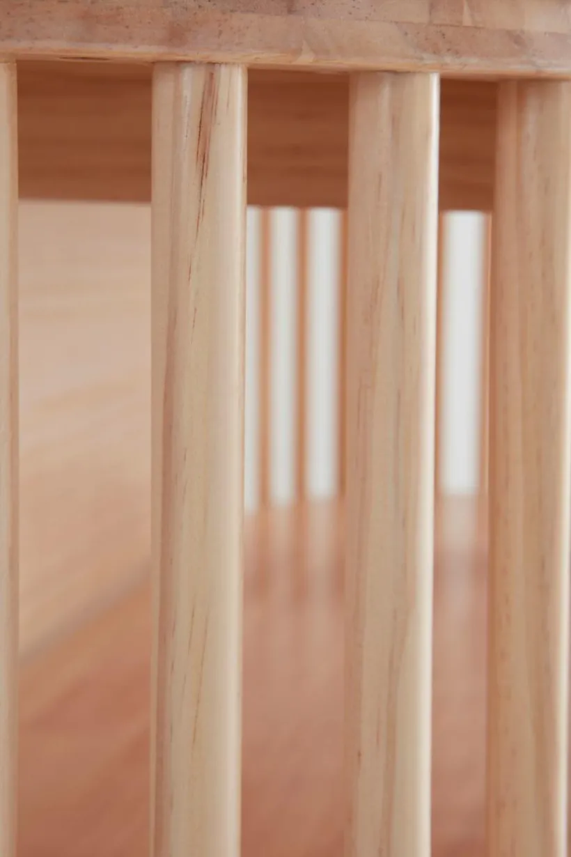 Storlek: Höjd 90 cm, bredd 140 cm, djup 50 cm. Frihöjd under möbel: 19 cm. Ribbor ø 9 cm.