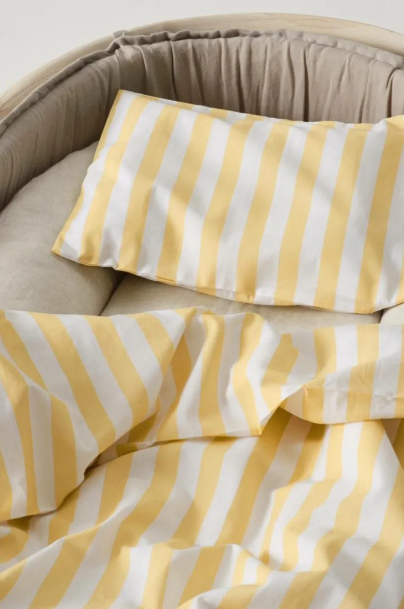 Smalrandigt påslakanset med ett påslakan och ett örngott i ekologisk bomull. Setet passar till barnvagn och vagga. Tyget har ett behagligt tryck, bomull är svalt och skönt mot huden. Randmönstret är tryckt i klara, glada färger mixat med varannan rand vit. De klassiska ränderna fungerar lika bra till liten som stor. Trådtäthet på 144 tc. (Trådtätheten talar om antalet trådar, thread counts, per kvadrattum i ett tyg. Ju högre trådtäthet desto högre kvalité.)