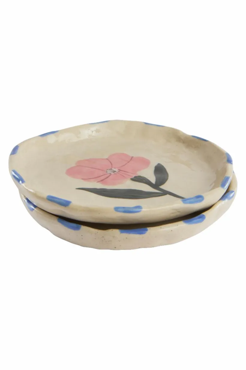 BOTANIC assietter är tillverkade av vit keramiklera med delikat handmålning. Varje tallrik har en förtrollande blommig design med en livlig rosa blomma och gröna blad, vilket ger en naturlig skönhet till din dukning. De blå accenterna längs kanterna ger en touch av färg och charm. Denna sidotallrik är en del av BOTANIC-familjen och passar vackert ihop med andra matchande föremål för att skapa en sammanhängande och inbjudande matupplevelse.