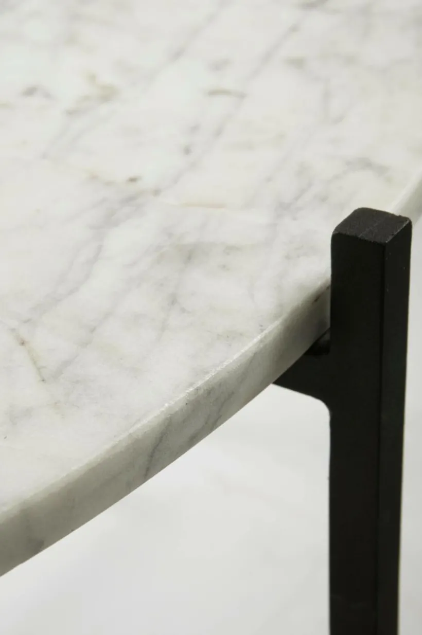 Runt soffbord med fin bordsskiva av marmor eller terrazzo (Terrazzo är en stenskiva med en bas av cement som blandas upp med krossad naturstesten av olika slag. Blandningen av natursten gör varje stenskiva unik och gör att den varierar i utseende från produkt till produkt. Materialet är slitstarkt och har en slät yta). Underredet är snyggt format av järn som står i fin kontrast till bordsskivan. Bordet kommer att lyfta hela ditt rum. Viss montering krävs.