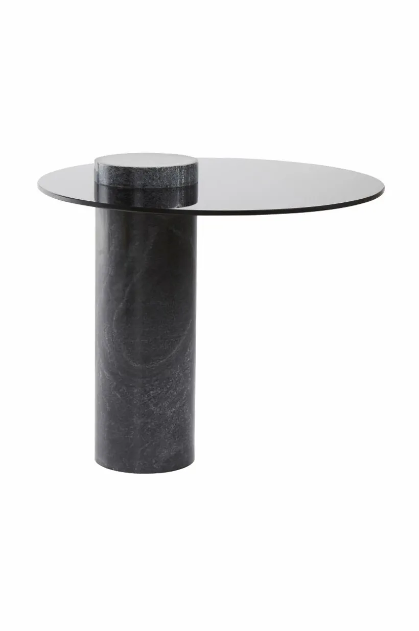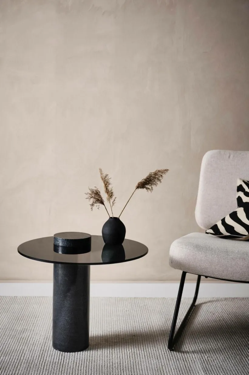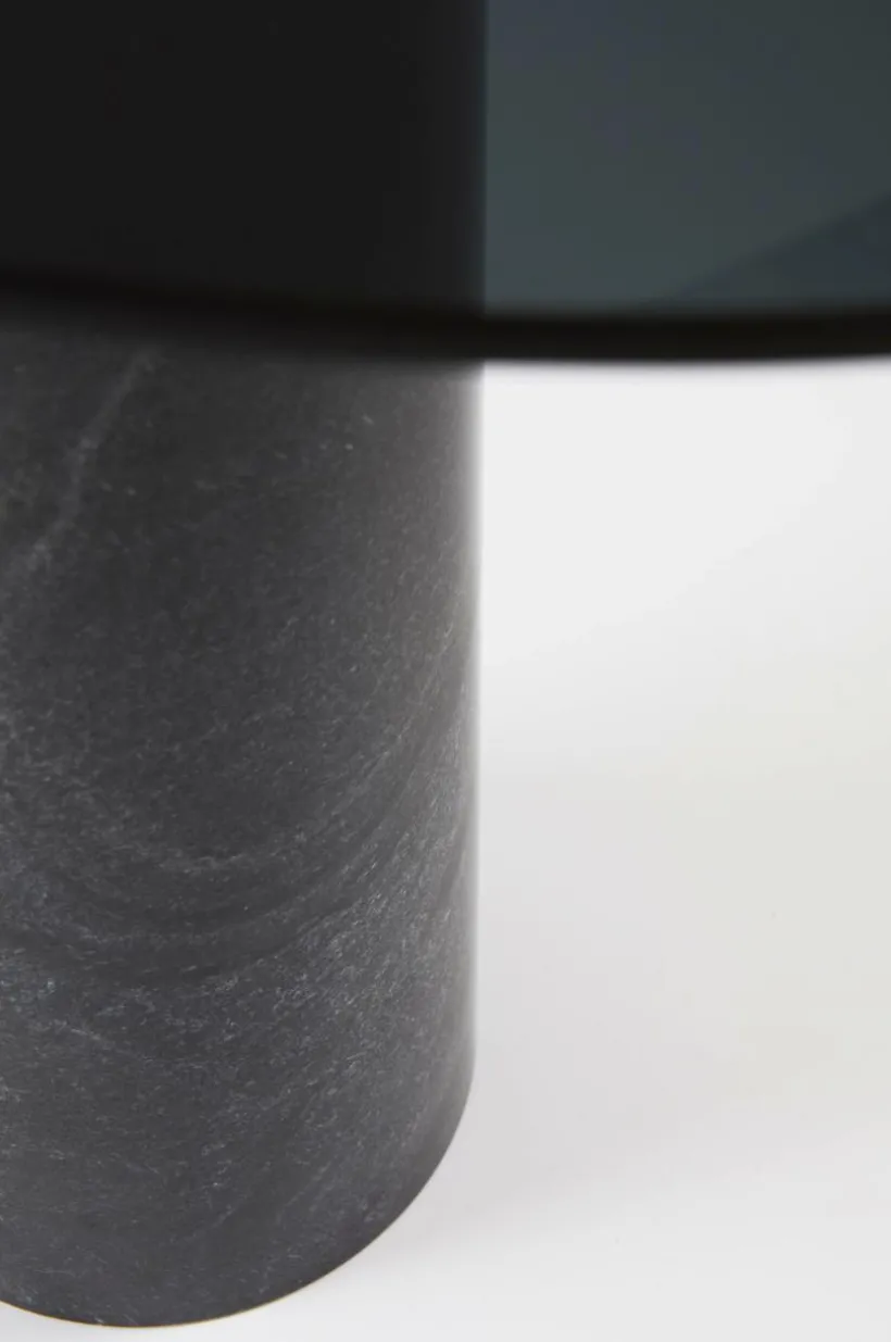 Runt sidobord med bordsskiva av sotat glas och bordsben av svart marmor. Bordsskivan av glas får en svävande känsla med det kraftiga bordsbenet av marmor som har en asymmetrisk placering. CALVIN är ett stilrent bord som ger en morden och sofistikerad känsla till ditt rum. Marmor är en natursten och mönstret varierar alltid lite beroende på bergartens sammansättning, vilket gör varje möbel unik. Viss montering krävs.