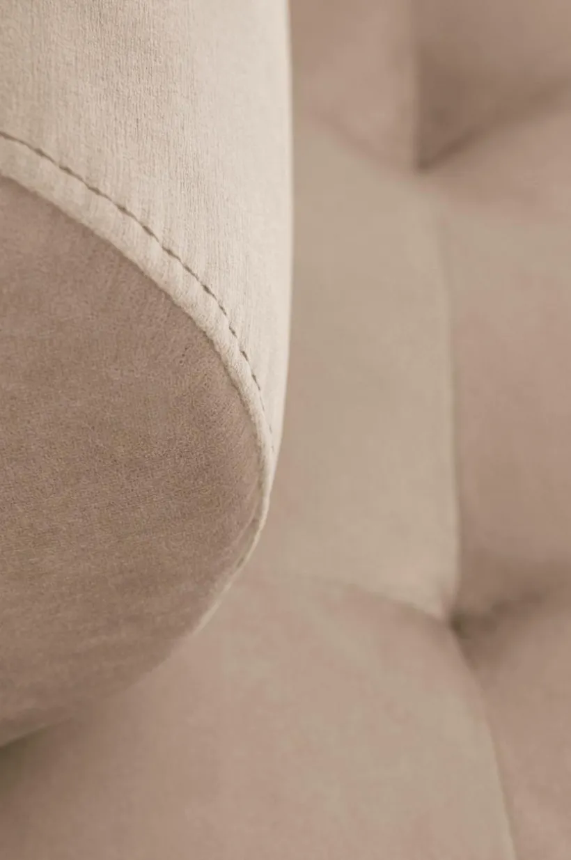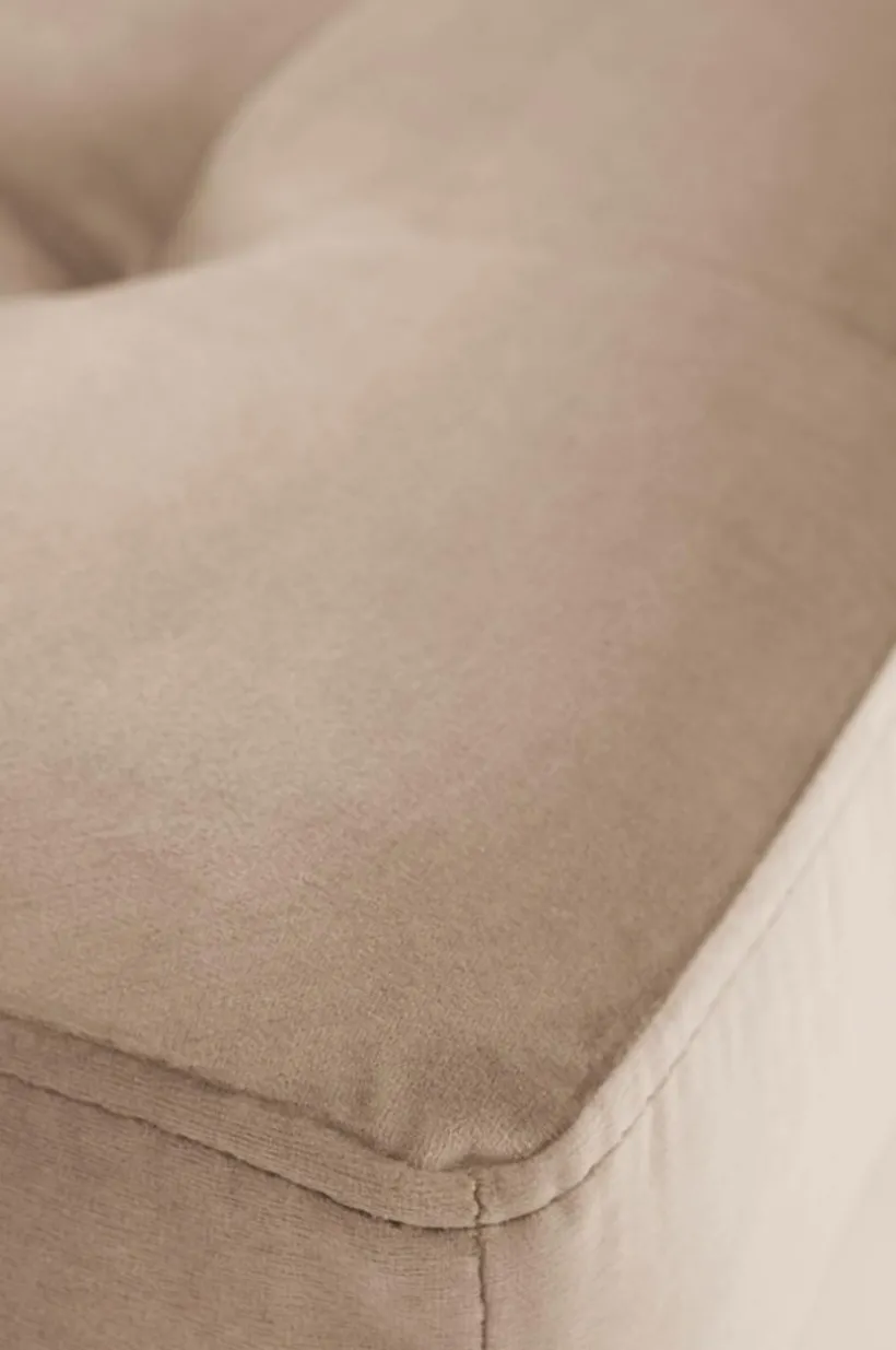 CARMEL dagbädd i sammet har ett stilrent underrede, en stomme av furuträ och plywood. Dynan är stoppad med kallskum för bästa sittkomfort och är klädd med ett slitstarkt sammetstyg, samt ben av metall. Tygets slitstyrka är på 28000 Martindale.