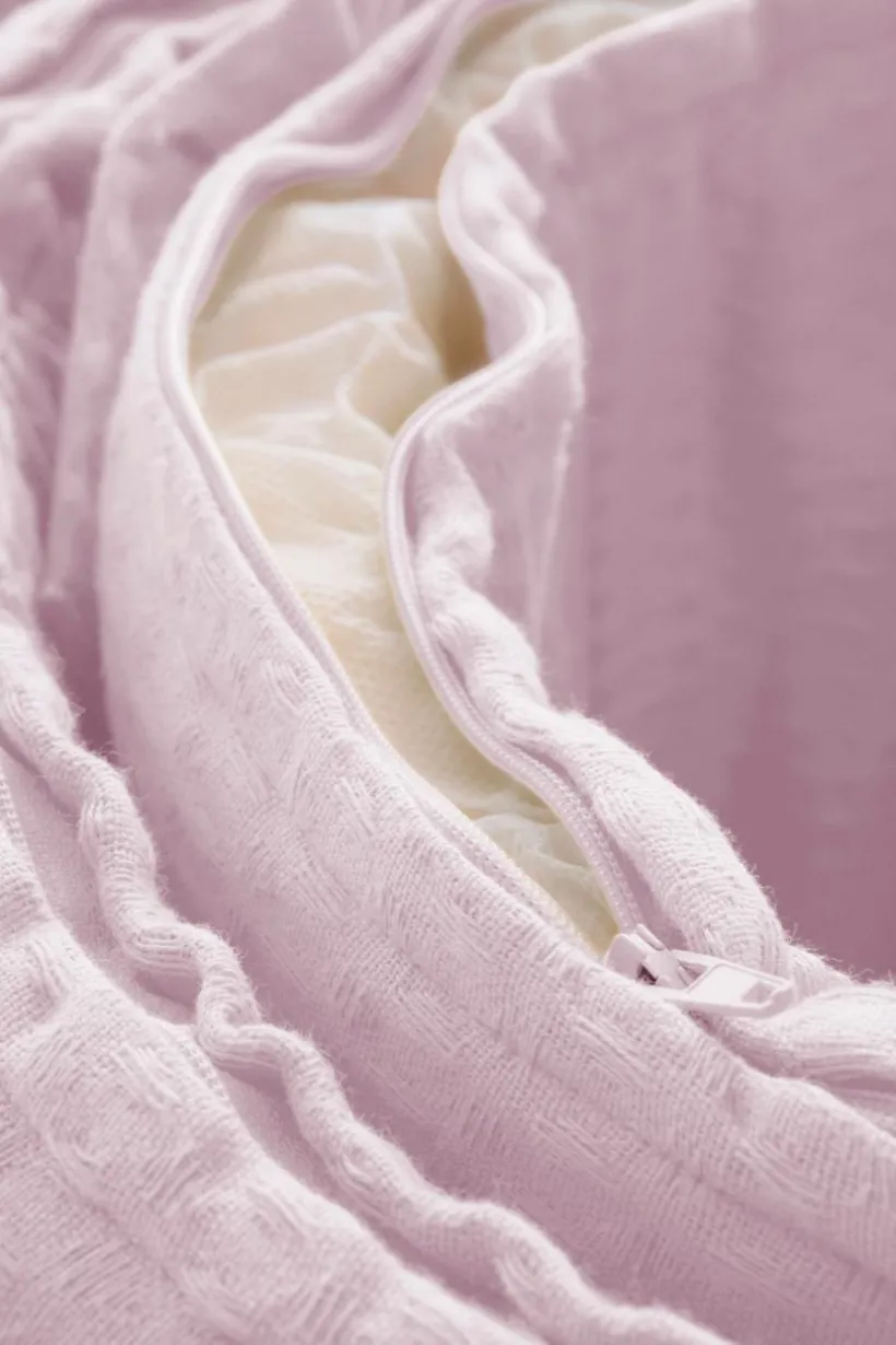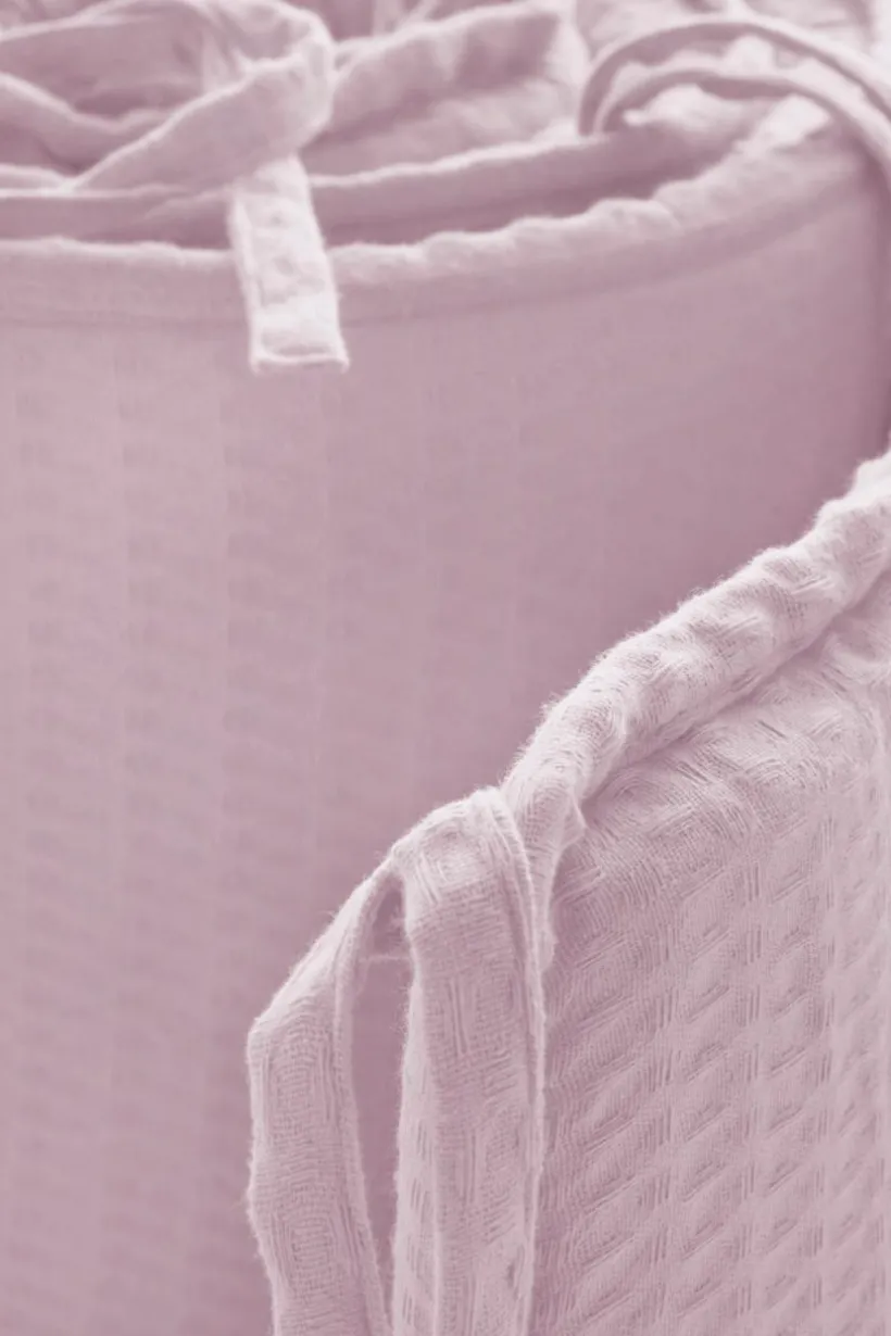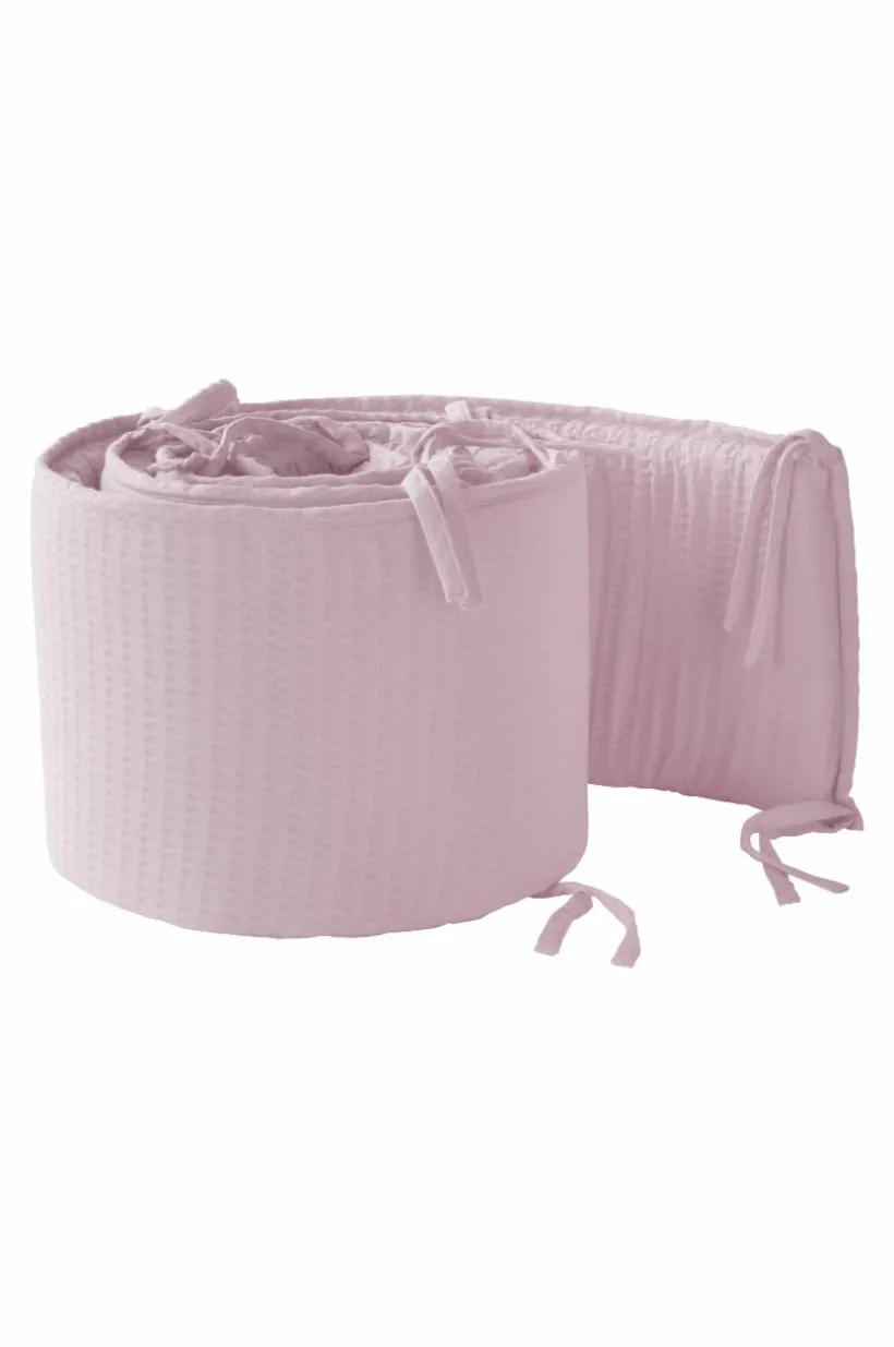 Spjälsängsskydd med yttertyg av ekologisk bomull i en mjuk och skön, våfflad kvalité. Tyget är plaggtvättat vilket innebär att det tvättats innan sömnad, och den våfflade kvalitén är extra mjuk och skön. Fyllning av polyester med mjuk skumgummikärna. Spjälskyddet gör spjälsängen mer ombonad och mysig, samtidigt som det hindrar barnet från att slå emot spjälorna i sömnen. Spjälsängsskyddet knyts fast med knytband. Yttertyget är avtagbart med dragkedja i öppningen och tvättbart. Spjälskyddet passar en spjälsäng med måtten 60×120 cm. Tygets gramvikt 230 g/m².