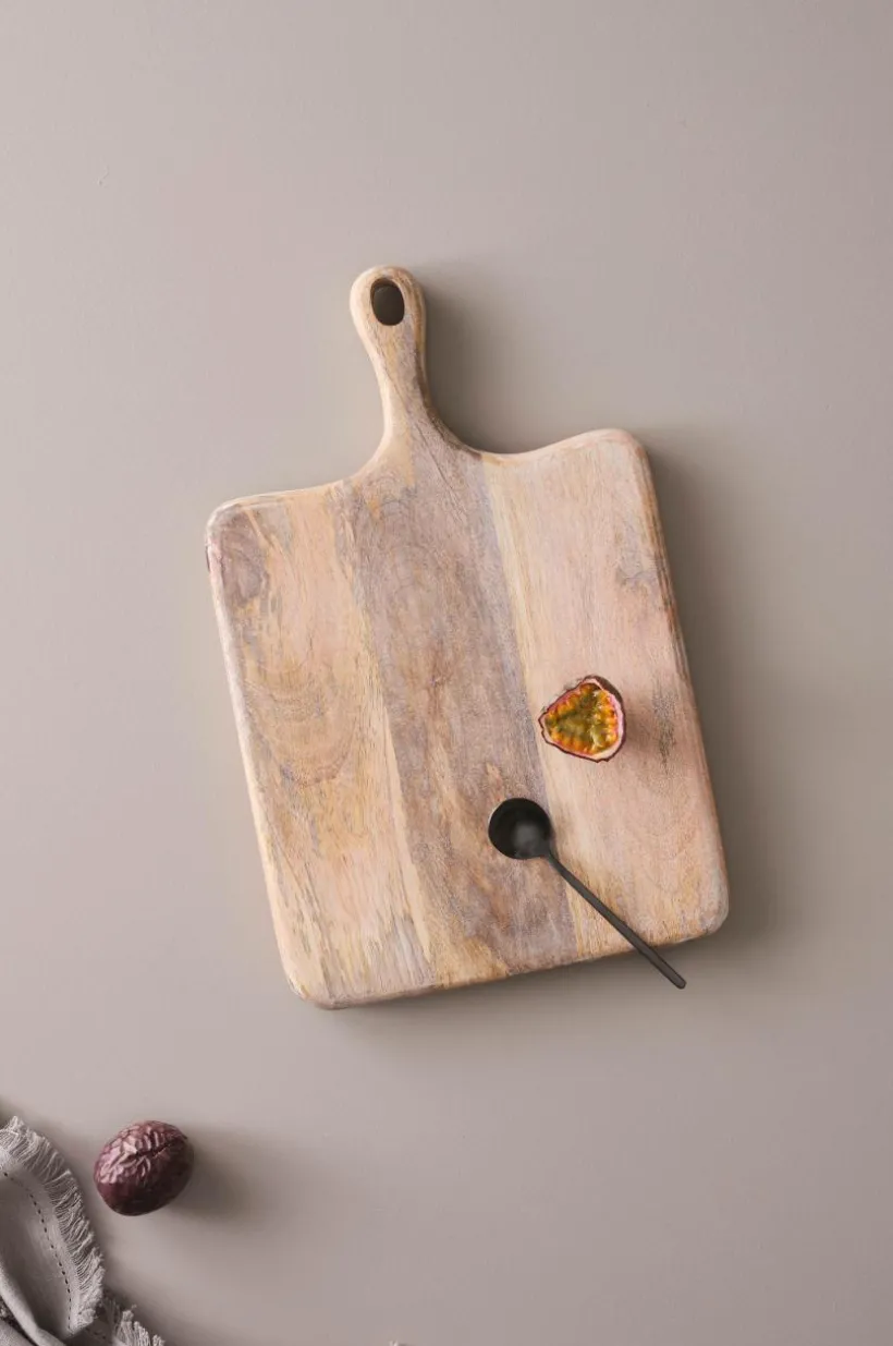 Skärbräda av FSC-certifierat mangoträ med vacker ådring. Den mjuka ytan är obehandlad och varje skärbräda är unik då träet har naturliga variationer. Skärbrädan har behagligt rundade kanter och ett handtag med hål.