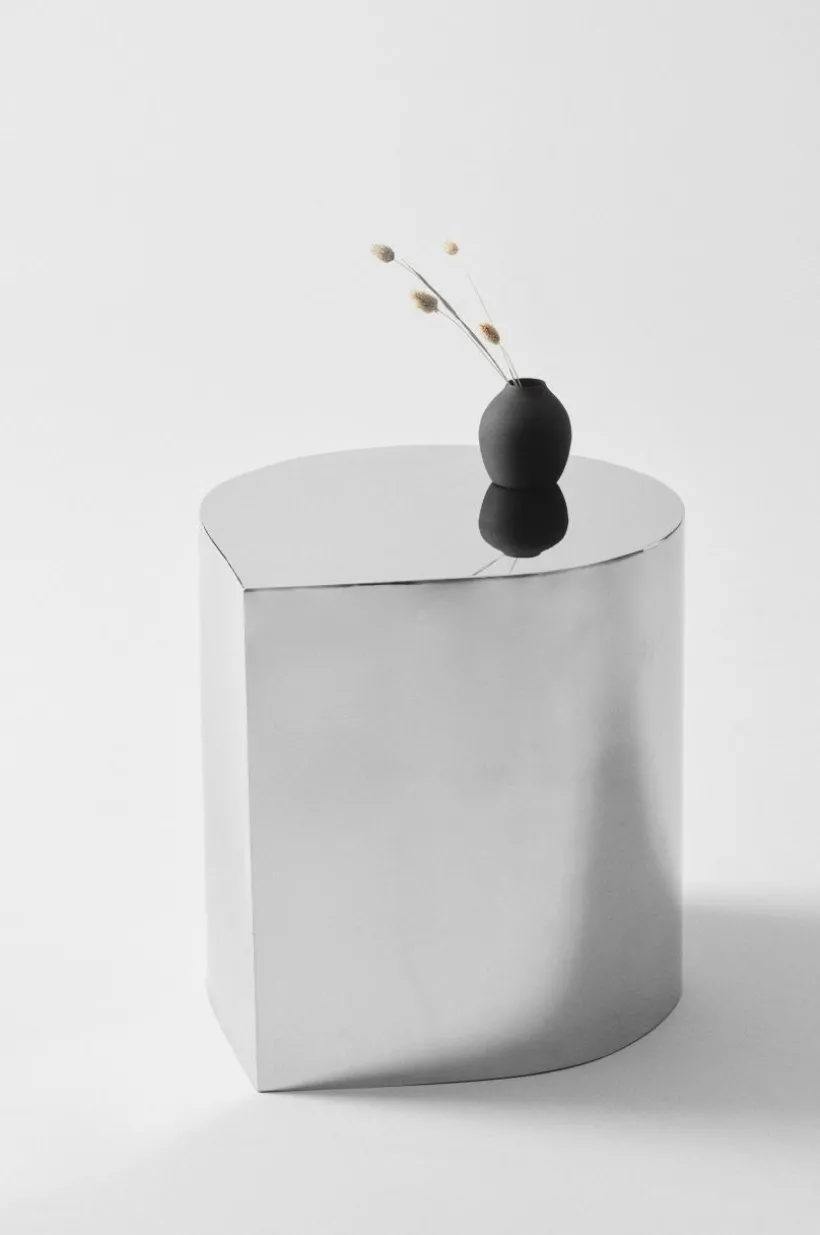 Droppformat sidobord i rostfritt stål med högblank finish. Bordet har en finurlig form där spetsen på droppen är 90 grader vilket innebär att sätter du fyra bord tillsammans så får du en fin fyrklöver och du kan variera dig efter tycke och smak. Sidobordet gör sig också fint i ett hörn av rummet eller mellan två soffor som står i ett L. Bordet är ihåligt vilket gör det hanterbart. CUBE är ett lyxigt litet bord i snygg form och med läcker metallic-finish som får hela rummet att andas elegans.