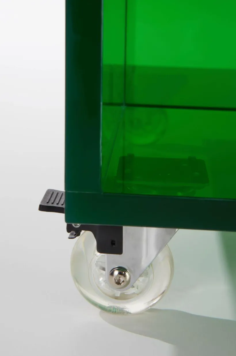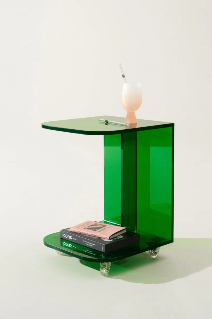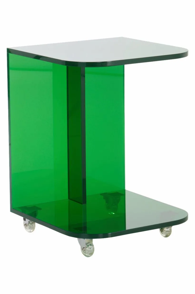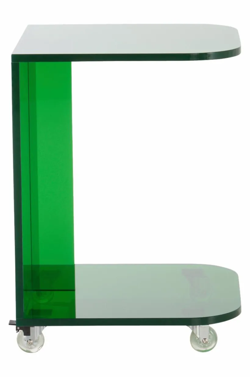 Sidobord av akrylglas. Sidobordet har enkel och ren form med med futuristiska känsla. Kanterna framtill är mjukt rundade och nedtill finns en hylla för förvaring av till exempel tidningar och böcker. De små hjulen under gör bordet enkelt att flytta. CLYDE har flexibel användning och passar som sidobord vid soffan eller varför inte som sängbord. Färgvalen är härligt uppfriskande.