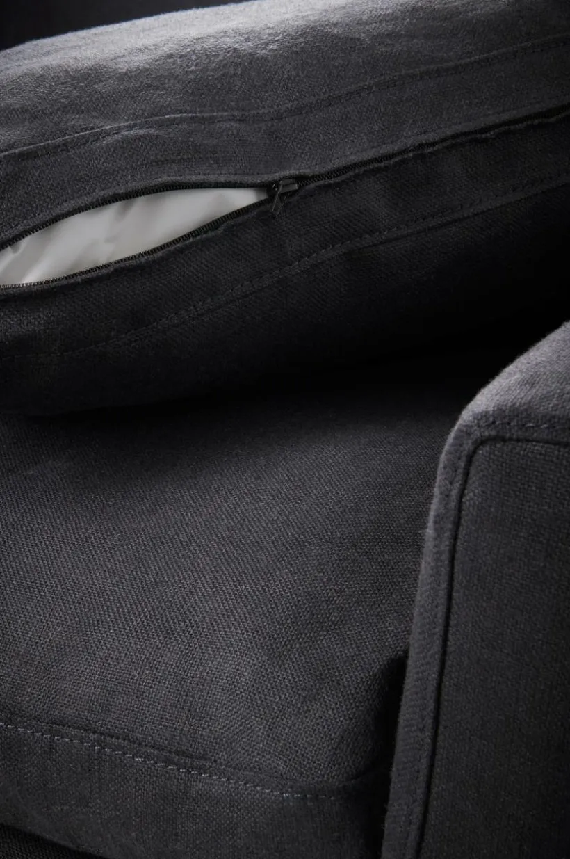 Material: Klädsel 100% lin. Stomme: furu och plywood. Fyllning: 50% dacron, 50% dun och skum.