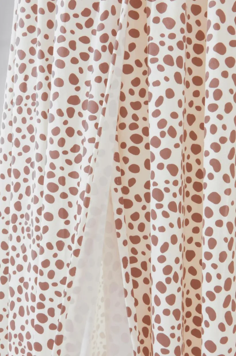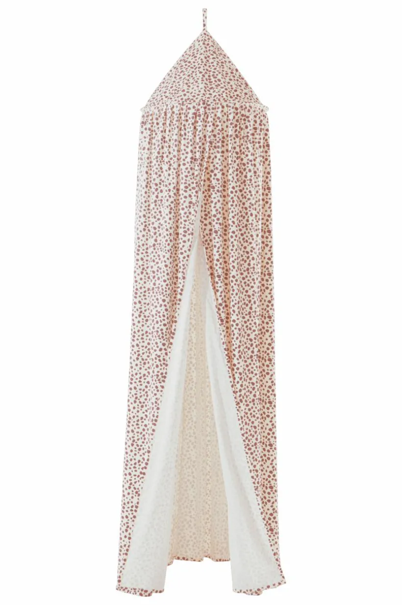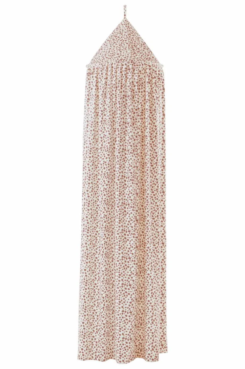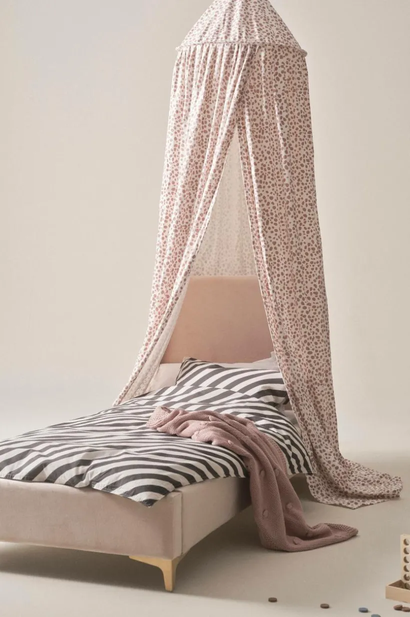 Sänghimmel i mjuk och följsam sammet av polyester med mysigt dalmatinerinspirerat tryck. Denna sänghimmel är rund upptill och öppen i framkant. En sänghimmel över barnsängen skapar ombonad atmosfär, det kan bli lite extra mysigt att gå och lägga sig.