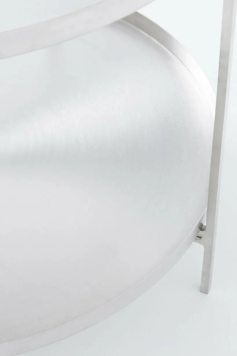Runt sidobord eller brickbord av metall. Det praktiska brickbordet har stort användningsområde och är mycket flexibelt. Båda brickorna kan lyftas av och du kan välja att ha dem på bordet med kanten vänd uppåt eller vänd nedåt. Stativet är hopfällbart. Viss montering krävs.