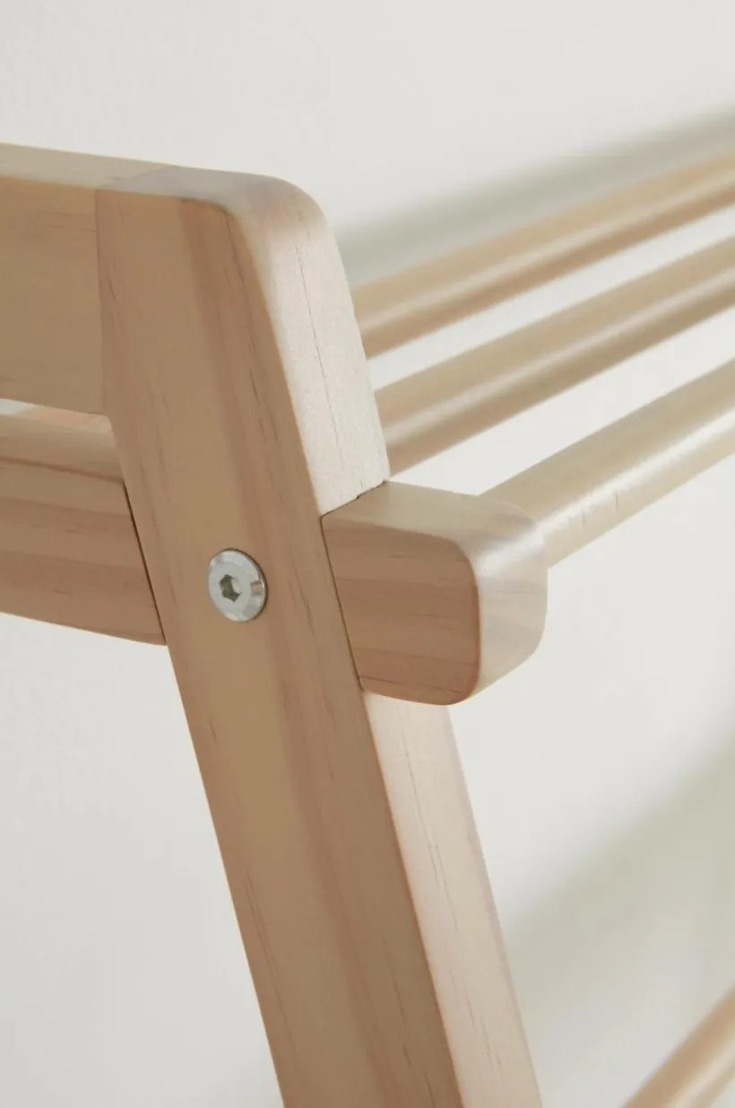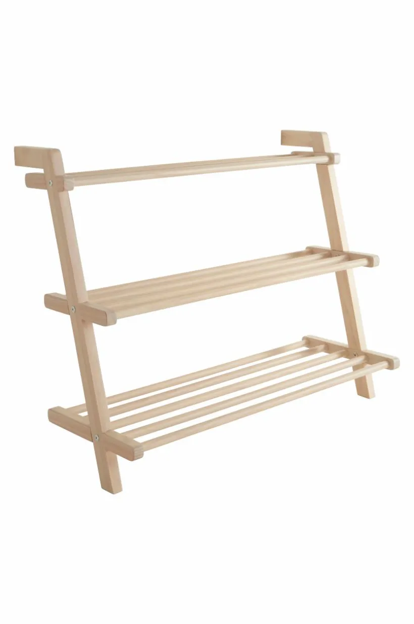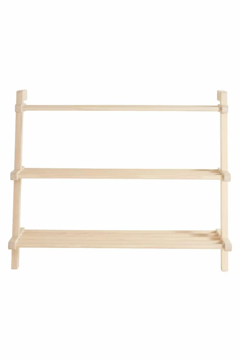 Skohylla av FSC-certifierad furu. Denna väggmonterade skohyllan är i stilren, nordisk design med tre hyllor för skor. Modellen är praktisk då skohyllan står på golvet och monteras mot väggen i överkant. Väggfästena är dolda så du får snygg montering. Viss montering krävs.