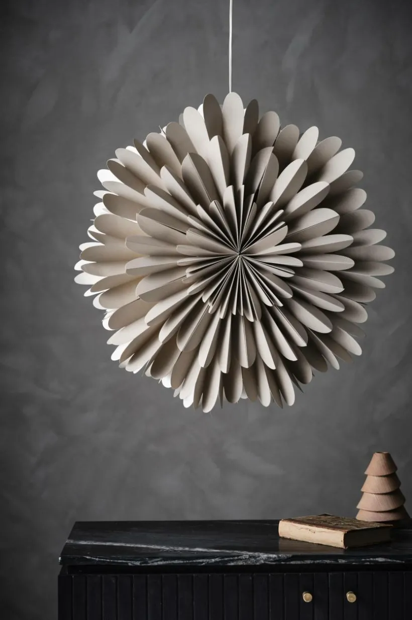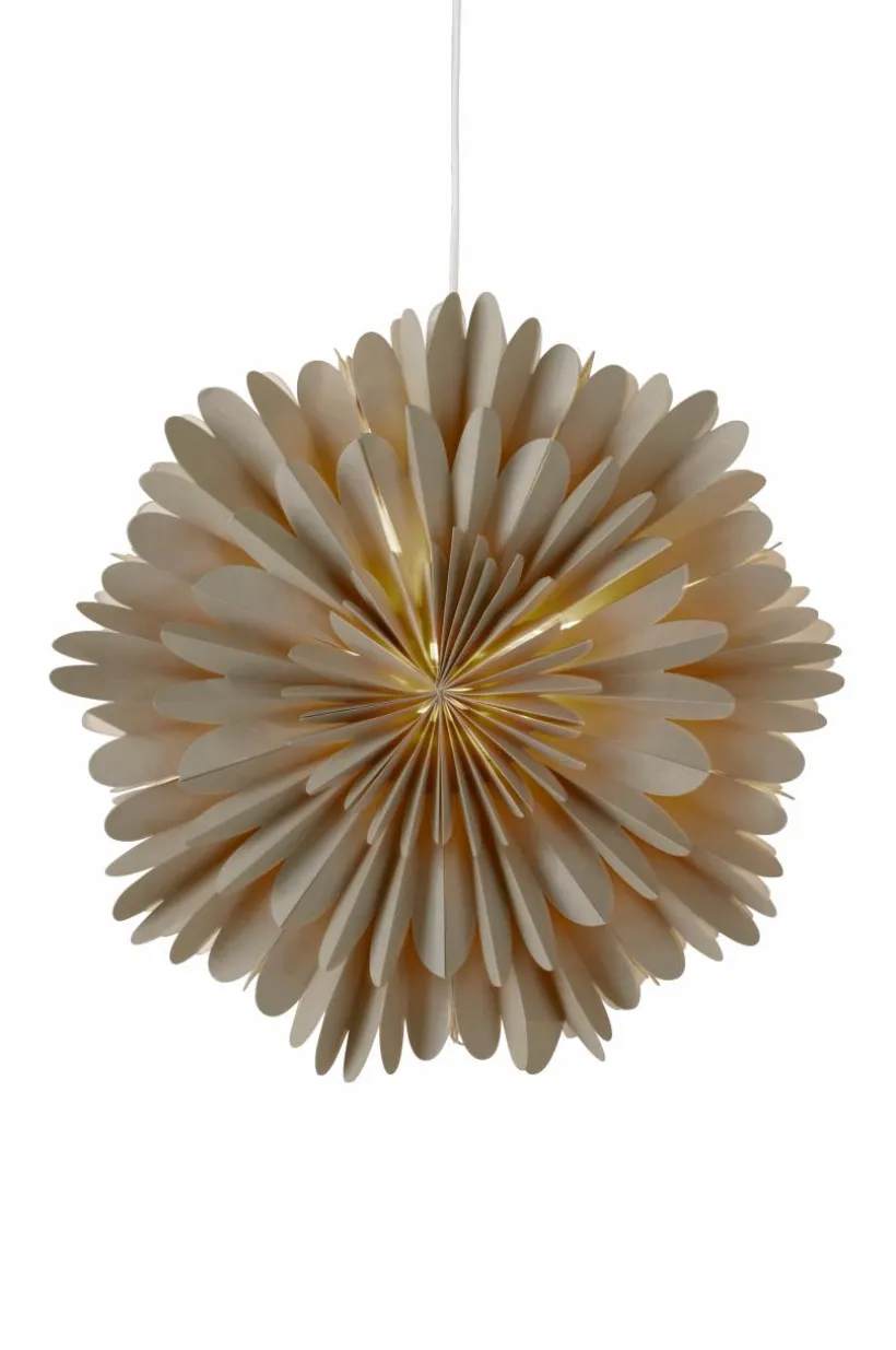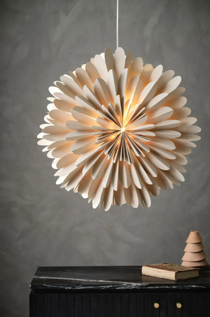 EIRA julstjärna förvandlar ditt vardagsrum med en touch av vintermagi. Denna utsökta stjärna är formad som en snöflinga/blomma och ger ett förtrollande sken. Förpackad i en robust vit låda levereras den komplett med lamphållare, glödlampsskydd och enkla monteringsanvisningar. Med en generös diameter på 68 cm skapar EIRA-stjärnan en festlig atmosfär som fängslar och förtrollar. Den är perfekt som säsongsbelysning och ger inredningen en modern och trendig touch.