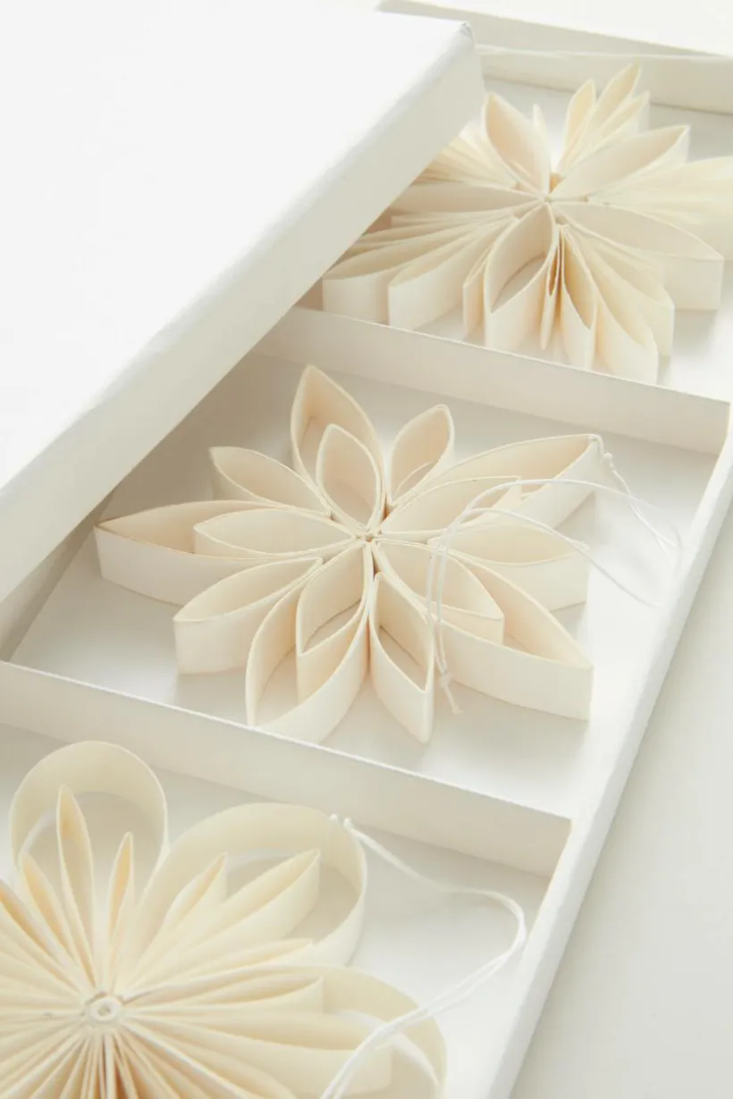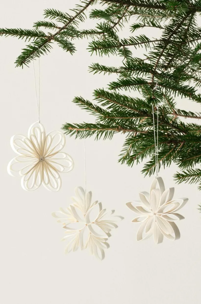 3-pack med handgjorda stjärnor av papper. Stjärnorna är olika och alla har en ögla så du kan hänga dem i ett fönster, i julgranen eller där du vill dekorera lite extra. Hantverket gör varje dekoration unik. Stjärnorna kommer i en pappersask.
