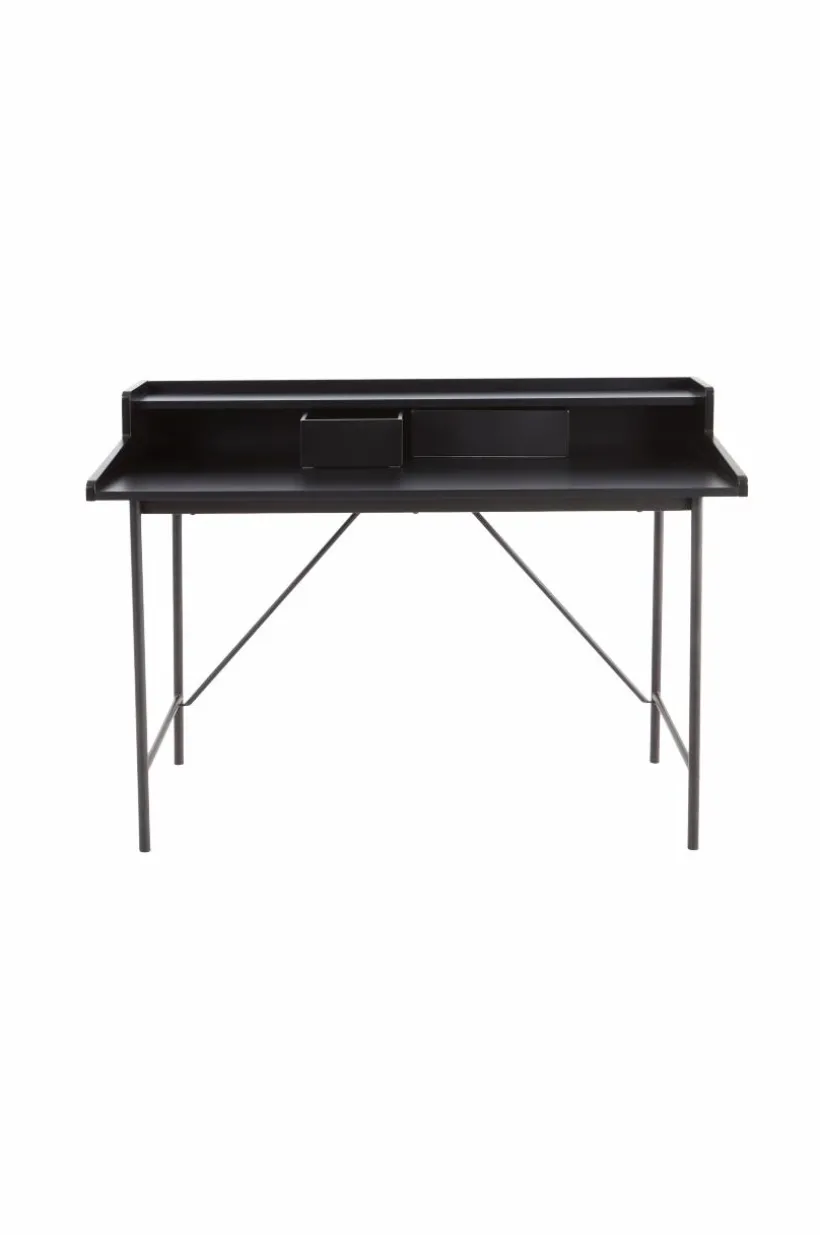 Skrivbord med arbetsskiva av mattlackerad MDF och ben av stål. Avlastningshylla i bakkant av skrivbordet och två små lådor för förvaring. Formsågad sarg med mjukt rundade hörn håller kontorstillbehören på plats. Skrivbordet är lätt att placera hemma. Praktiskt för dig som arbetar hemifrån emellanåt. Skruvar medföljer. Viss montering krävs. Monteringsanvisning medföljer.