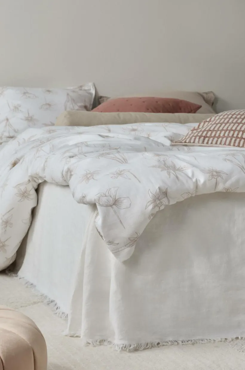 Sängkappa av tvättad lin med rå franskant nertill och platta (ovansida) av bomull. Lin är ett fint naturmaterial med speciella egenskaper och härlig känsla. FRINNY är lika snyggt som mjukt och skönt, det enfärgade linneprogrammet är helt tidlöst. När linet tvättas får det ännu mjukare struktur. I serien FRINNY har alla delar råa kanter med liten frans.