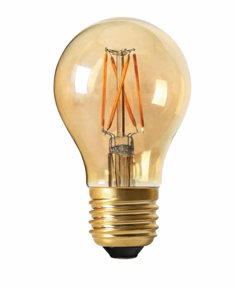 Amberfärgad lampa med synliga ljuskällor och varmt sken. Ljuskällans ljus kommer från flera långa filamentstavar som efterliknar den traditionella lyktlampan. Lampan har E27-sockel. Färgtemperaturen är 2100 kelvin. Ljusflödet är 130 lumen. Effekt: 2,5 w. Medellivslängd: 25000 timmar. A++. Dimmerkompatibla.