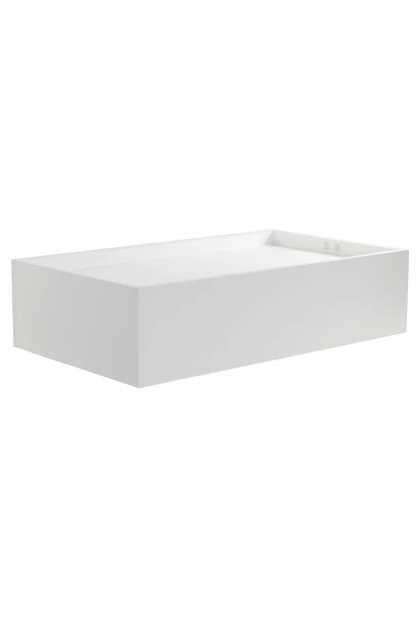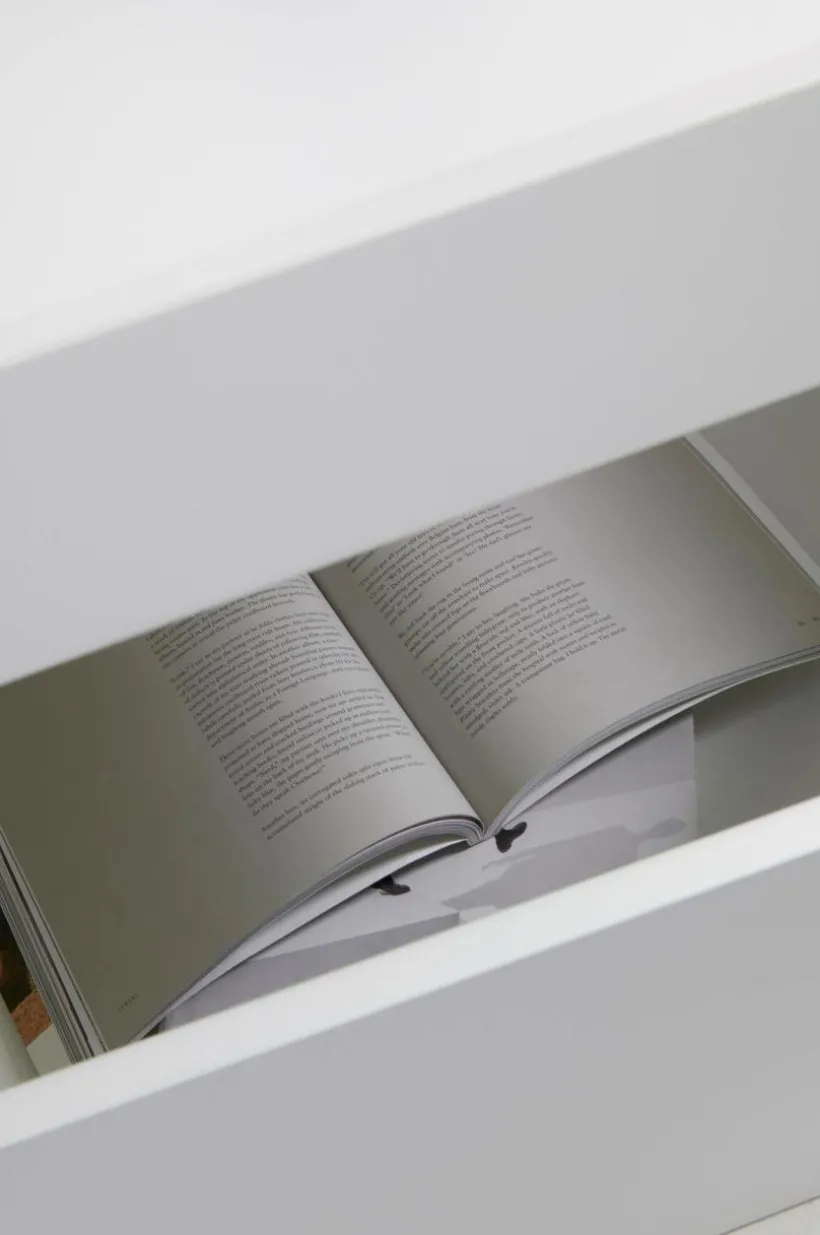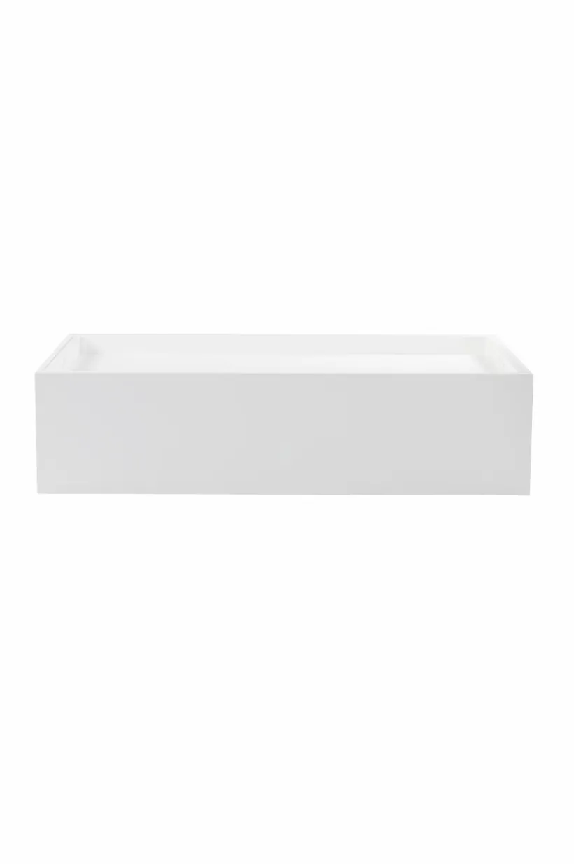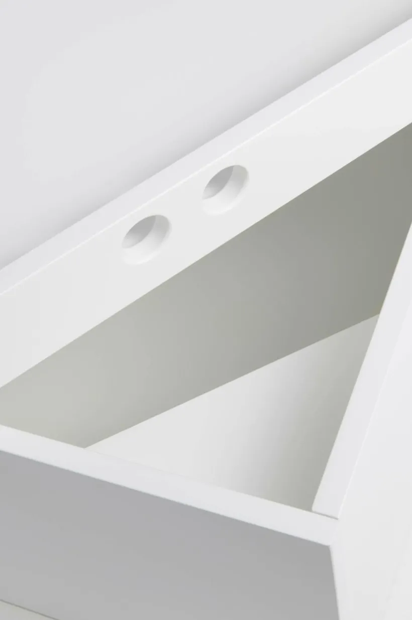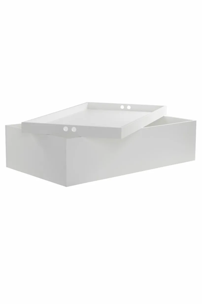Rektangulärt soffbord i MDF. Soffbordets bordsskiva är utformad som en stor bricka som sänks ned i soffbordet och undertill får du praktisk förvaring. Bordsskivan har två runda, dekorativa hål som har handtag på två sidor. Det låga bordet ger en mysig stämning till din soffhörna samtidigt som du utnyttjar utrymmet till förvaring.