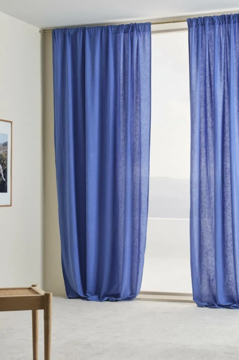 Två gardinlängder i behaglig, tvättad kvalité som faller fint. Hampa och lyocell har kombinerats till ett tyg med matt yta och skön linnekänsla. Längderna har påsytt multifunktionsband och kan hängas upp med fingerkrokar, kanal samt dold hälla.