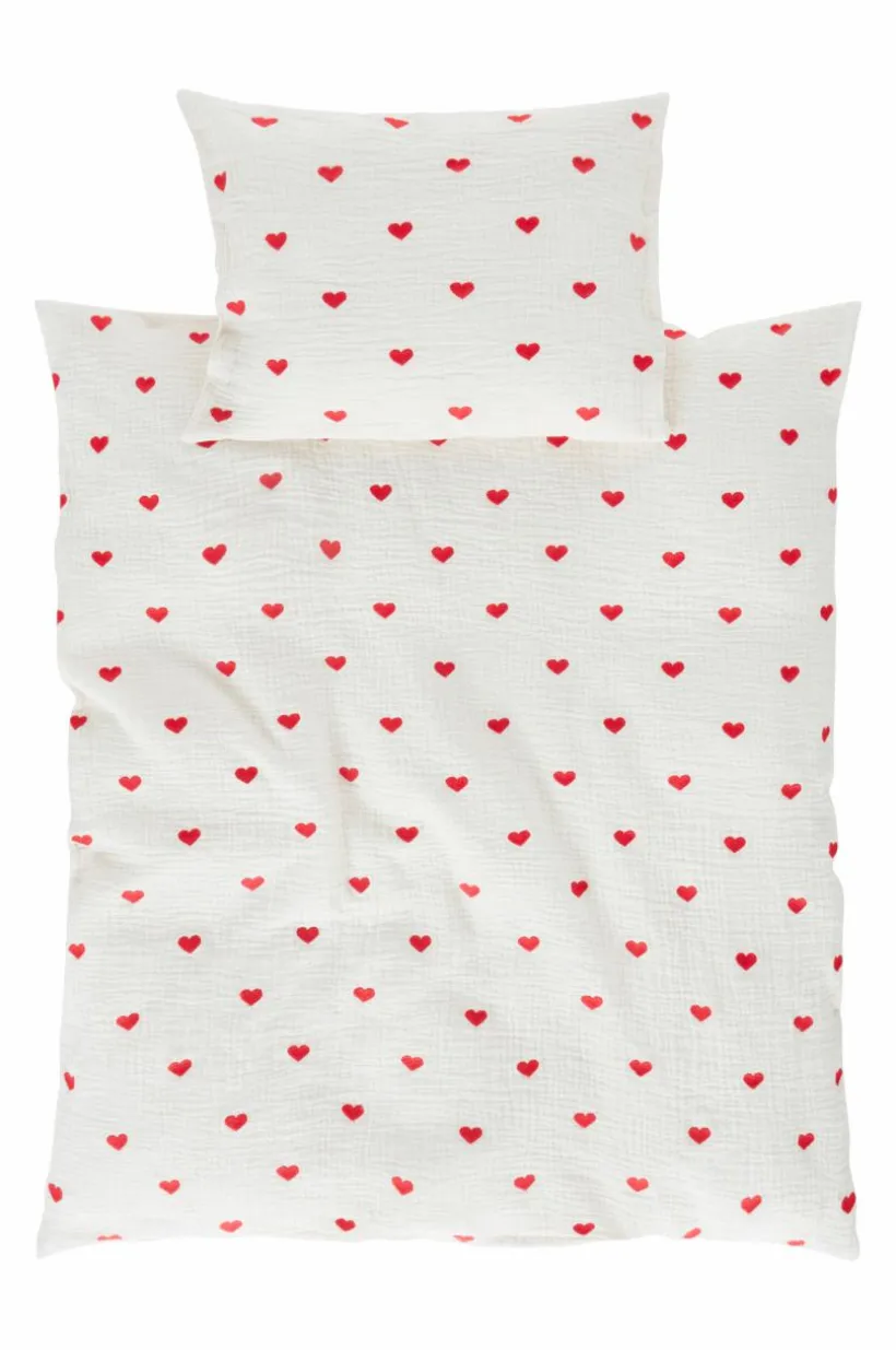 Påslakanset i två delar, ett påslakan och ett örngott, i härlig, ekologisk bomullsmuslin med broderade hjärtan. Setet passar till vagga och barnvagn. Muslin är ett mjukt, tunt tyg i två lager, vävt med lite bubblig effekt, vilket gör tyget mjukt och extra lättskött. Du behöver inte stryka eller mangla. Det behagliga muslintyget är skönt att sova i. Örngottets baksida är enfärgad. Trådtäthet på 178 tc. (Trådtätheten talar om antalet trådar, thread counts, per kvadrattum i ett tyg. Ju högre trådtäthet desto högre kvalité.)