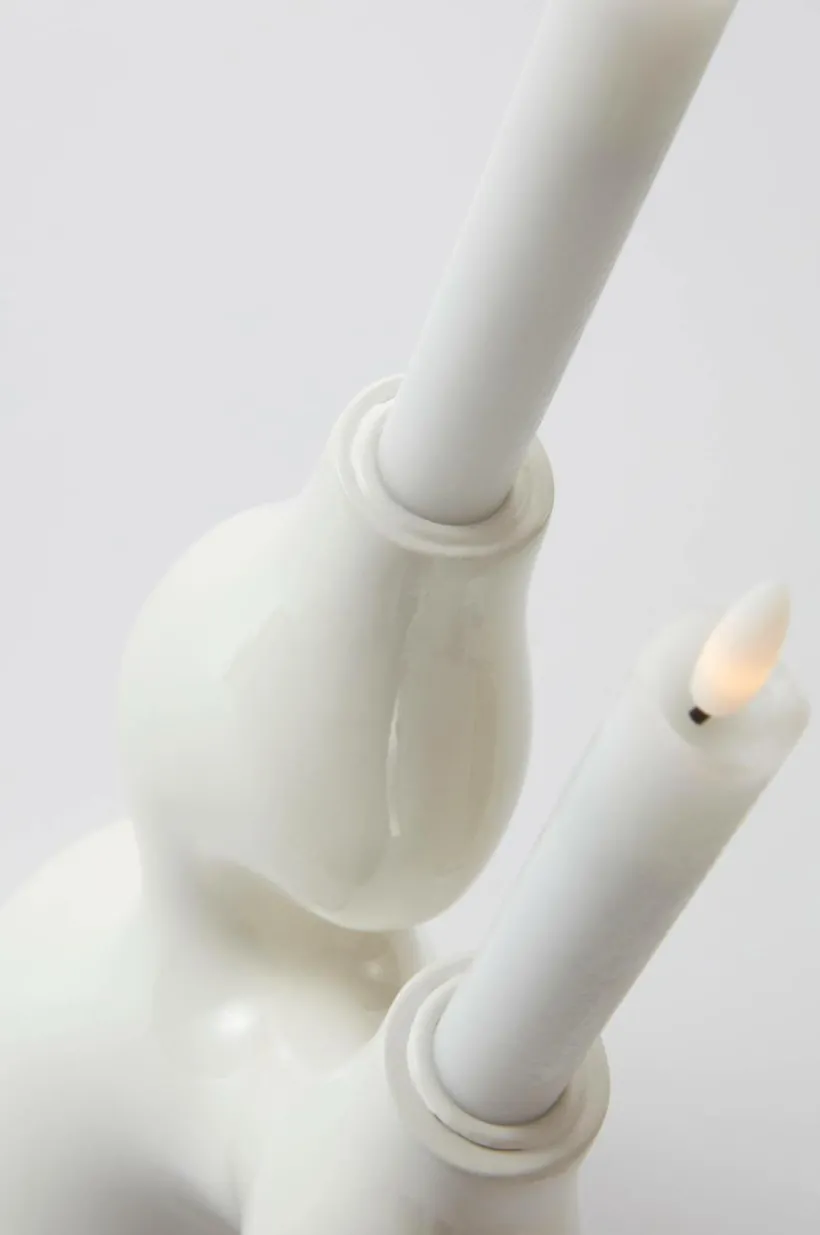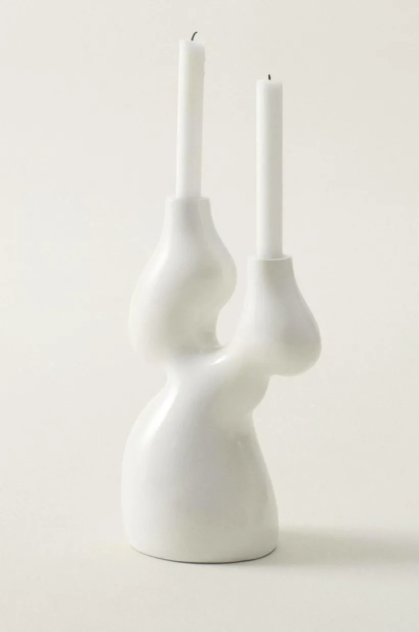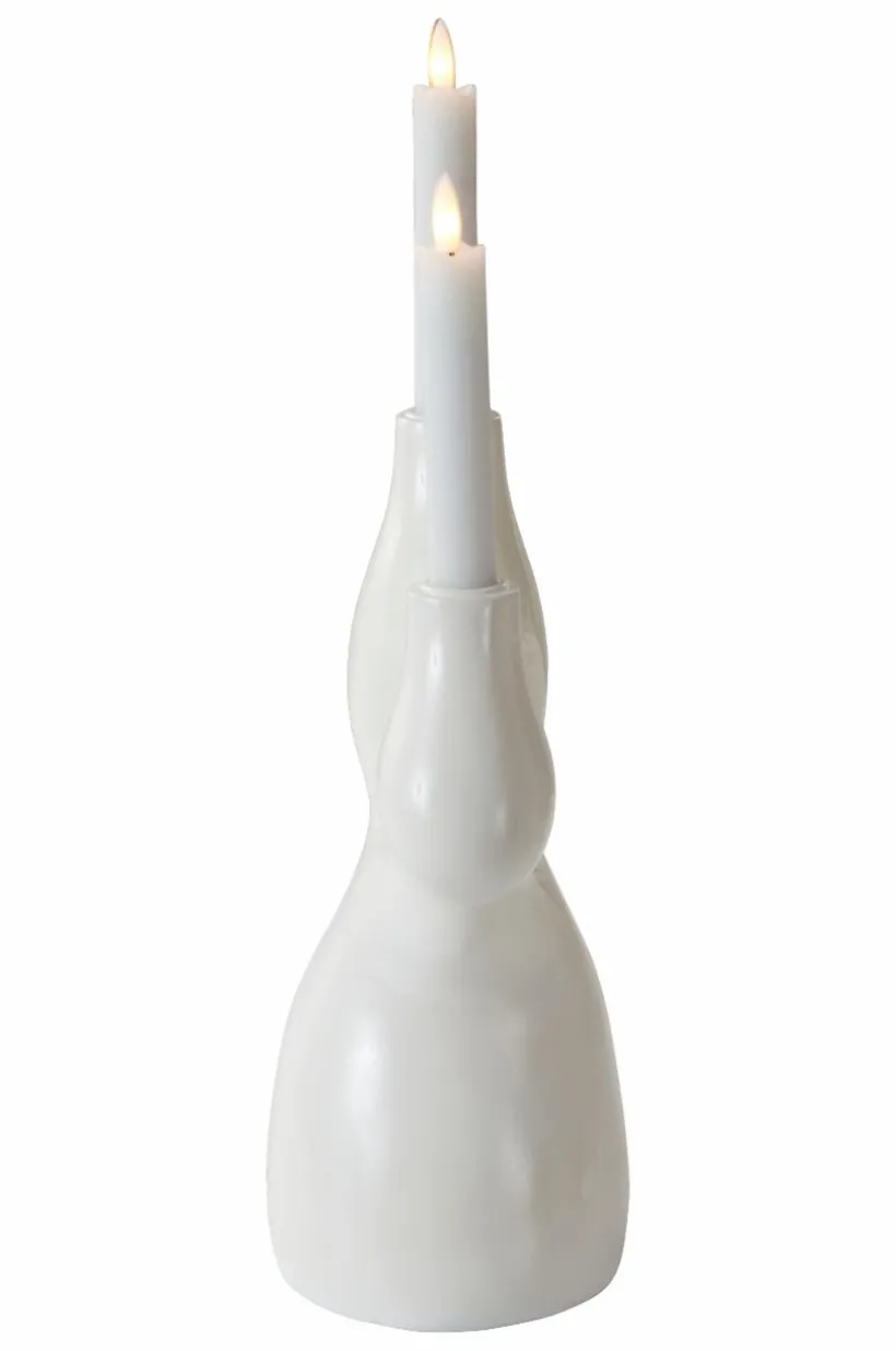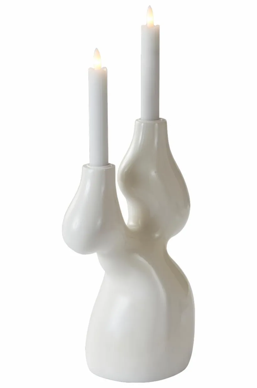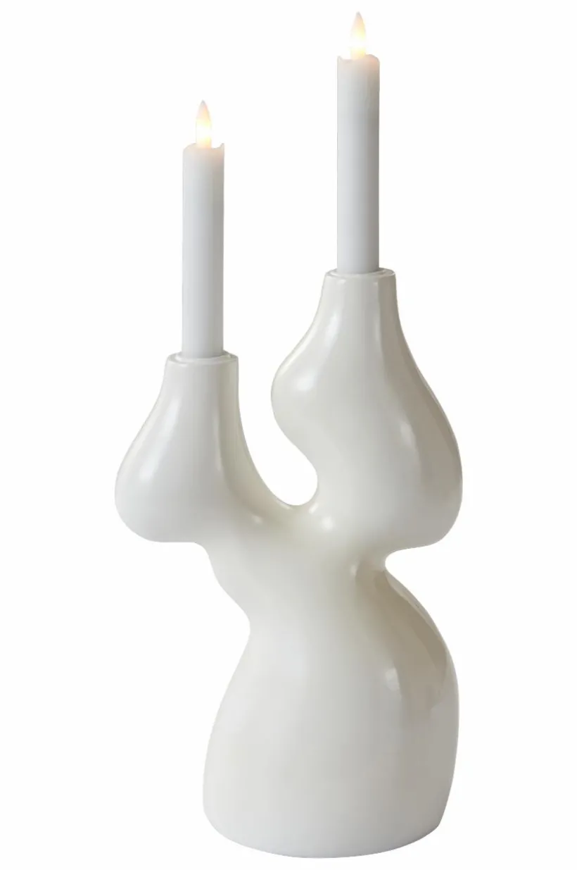 Handgjord ljusstake av polyresin. Ljusstaken är mjuk och böljande i formen och har två ljushållare. Det fina hantverket gör varje ljusstake unik. Ljus medföljer ej.
