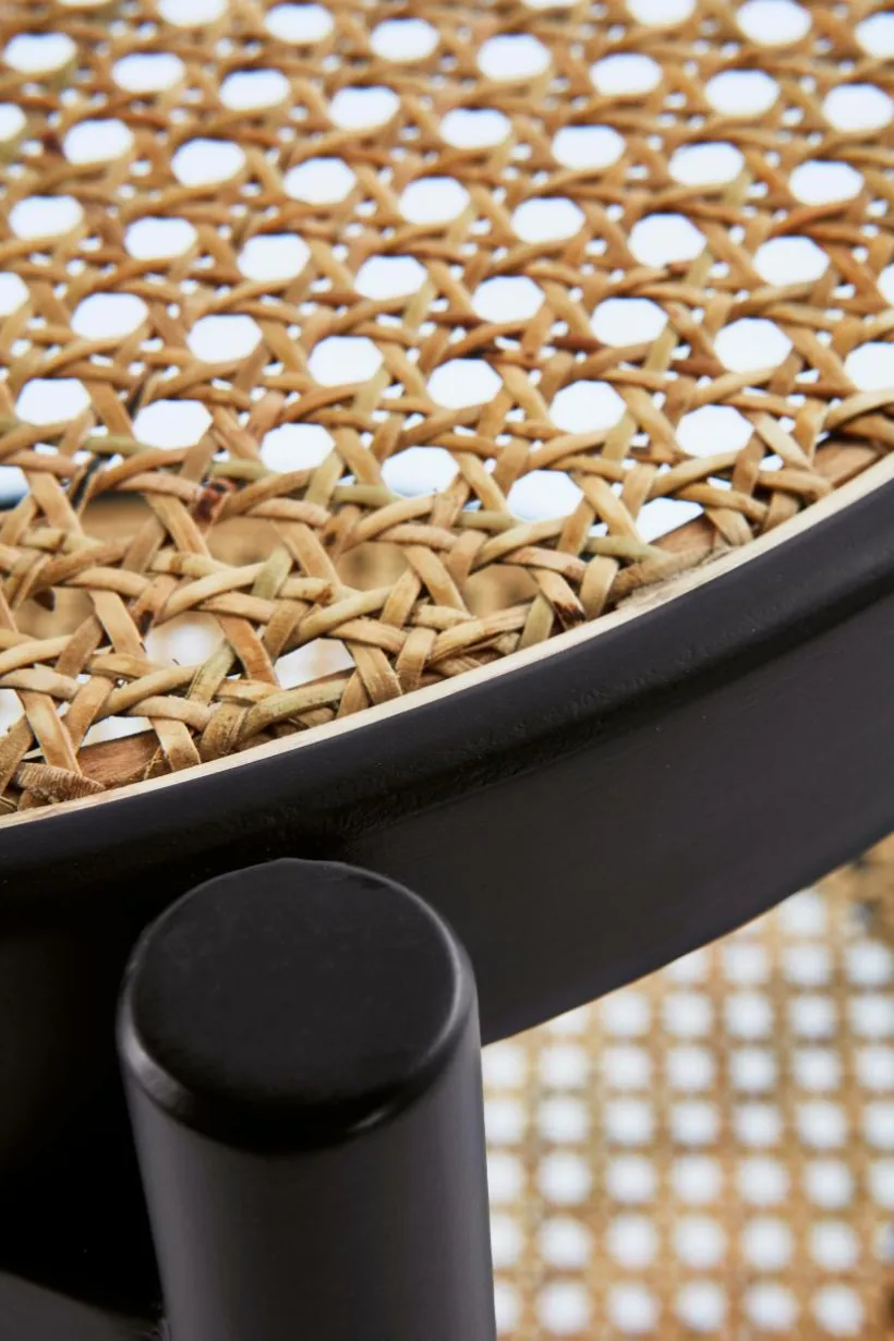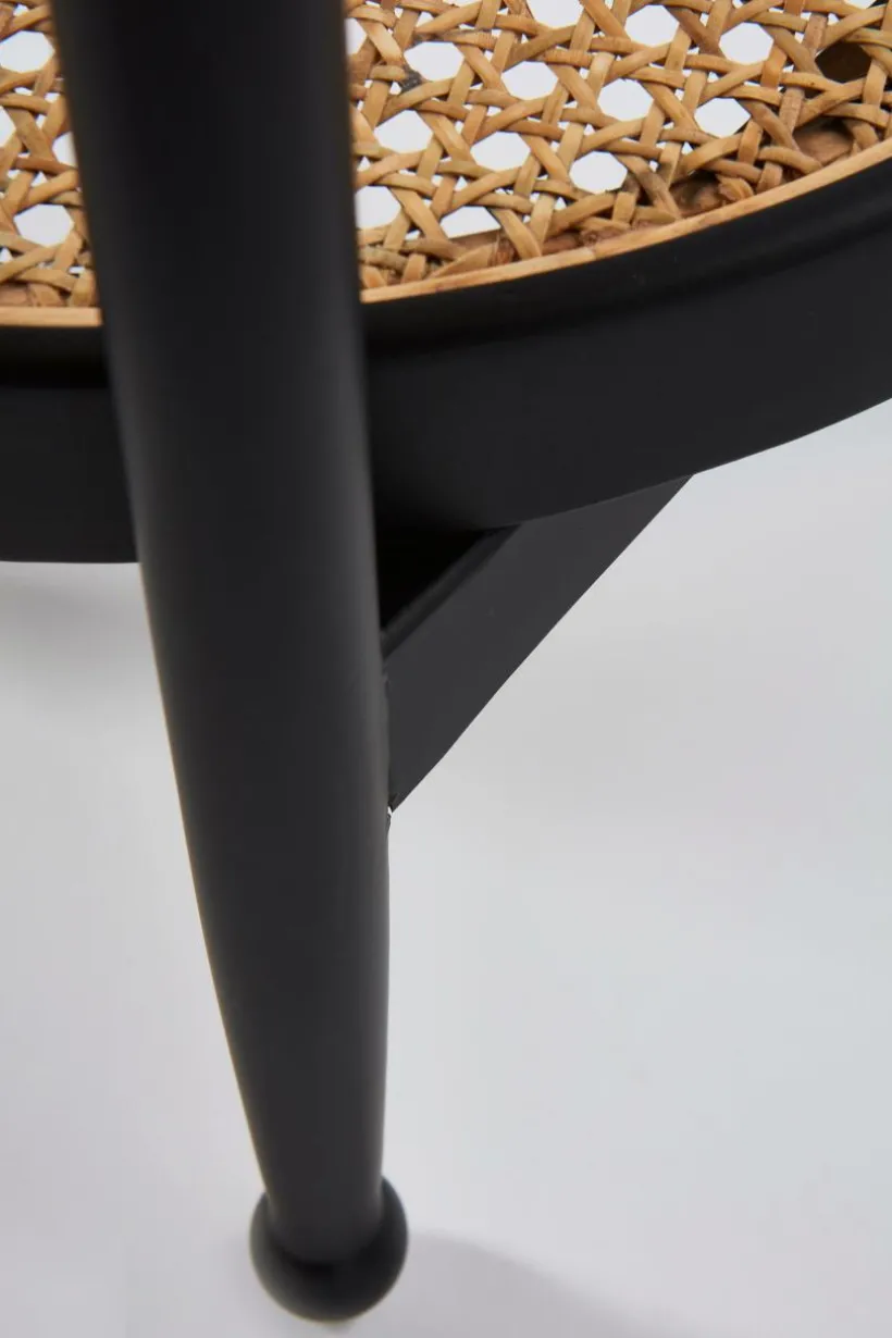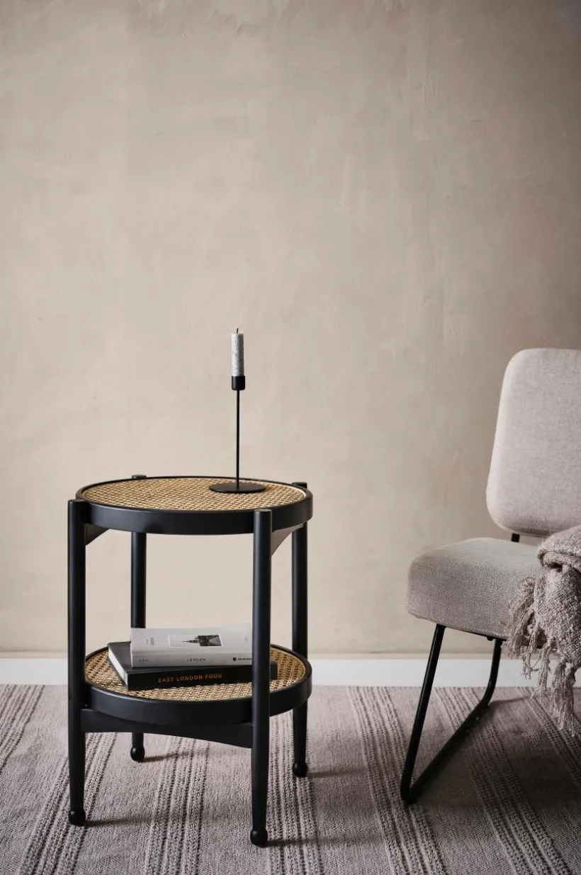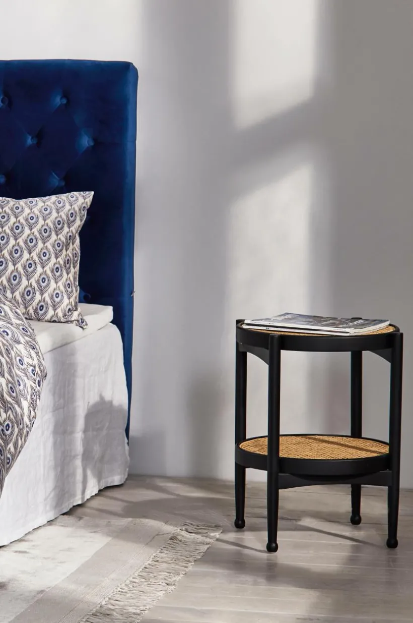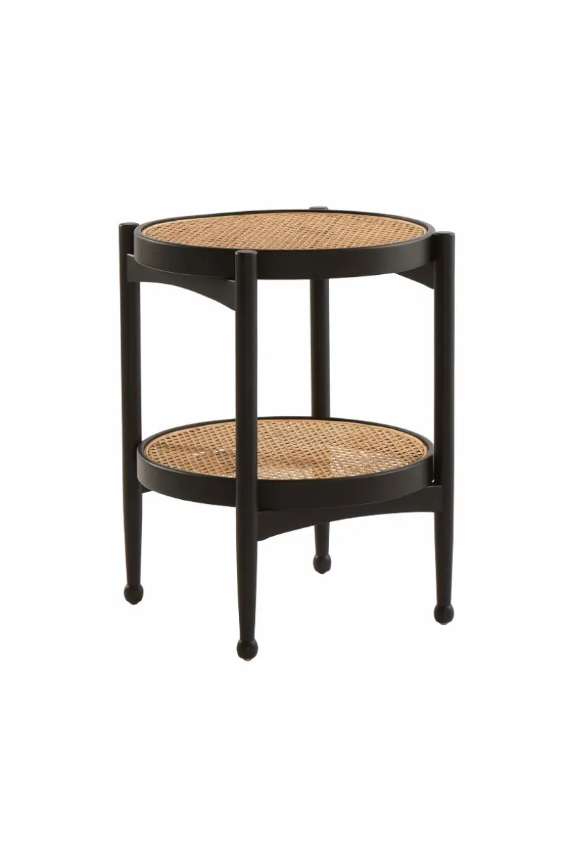 Litet, runt sidobord med bordsskiva av rotting. Ramen runt bordsskivan och benen är av ljust almträ eller svartmålad björk.