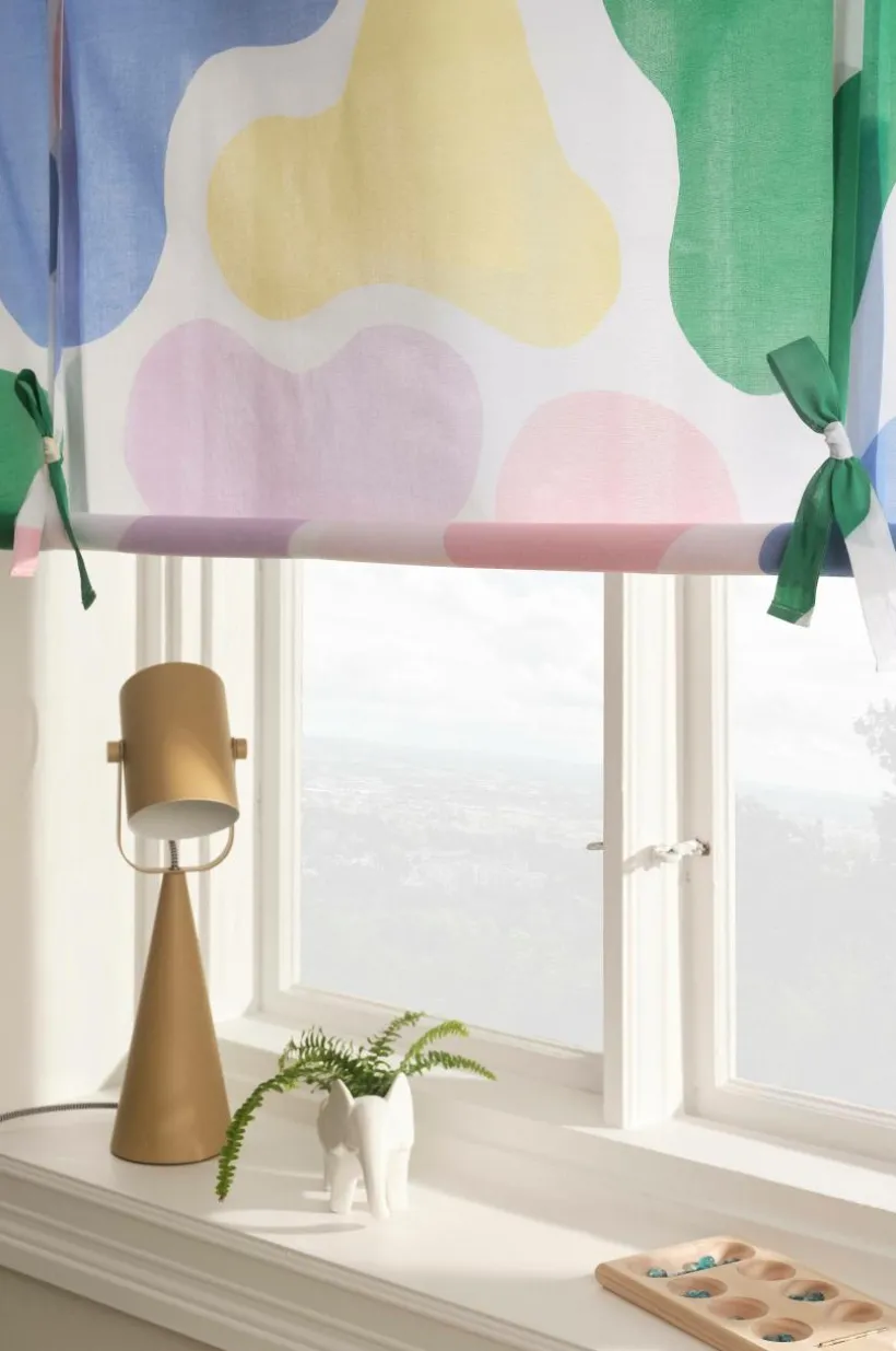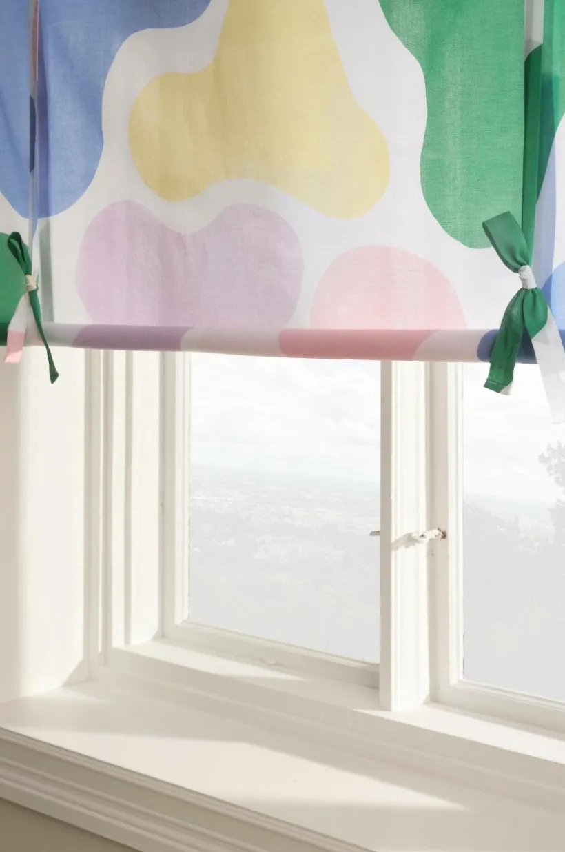 Roll up-gardin av bomull gulligt djurmönster tryckt i pigga pasteller på vit botten. Roll up-gardinen hängs på vanlig gardinstång. Höjden regleras med knytband.