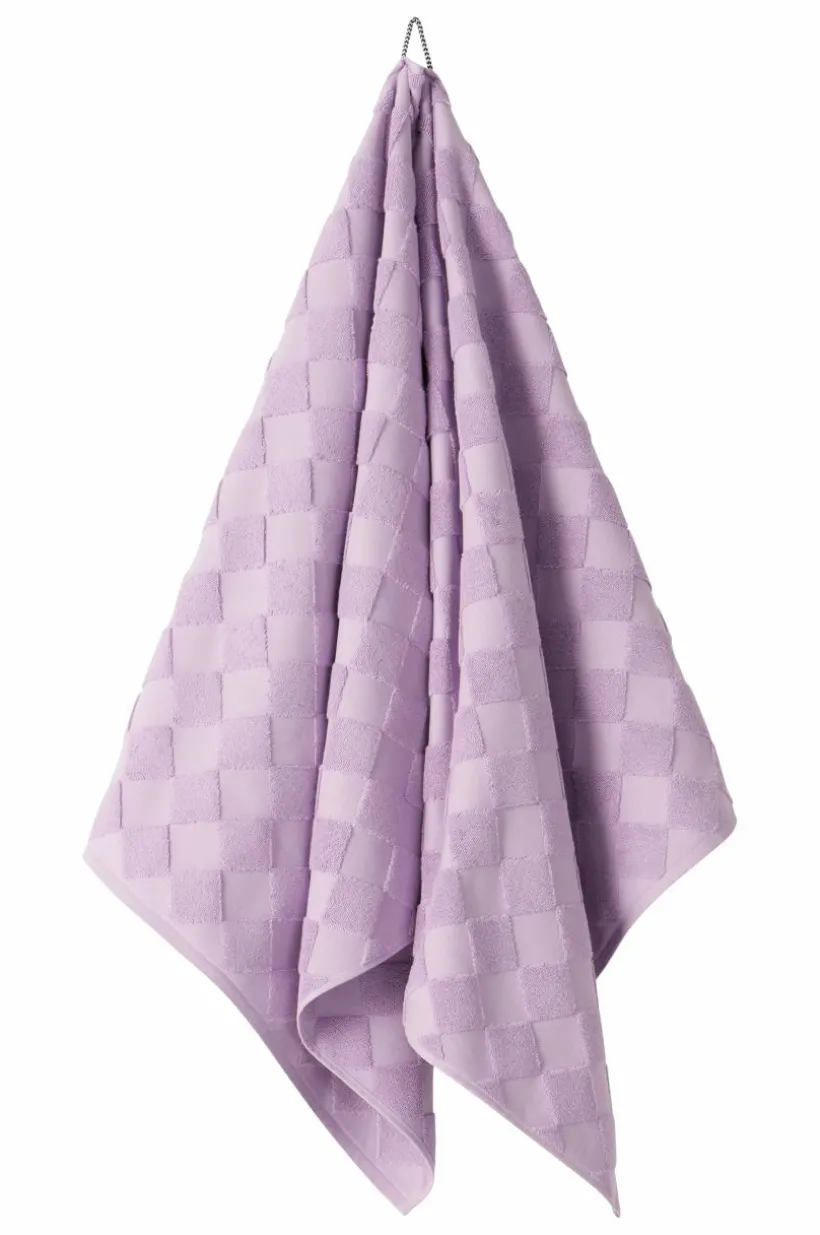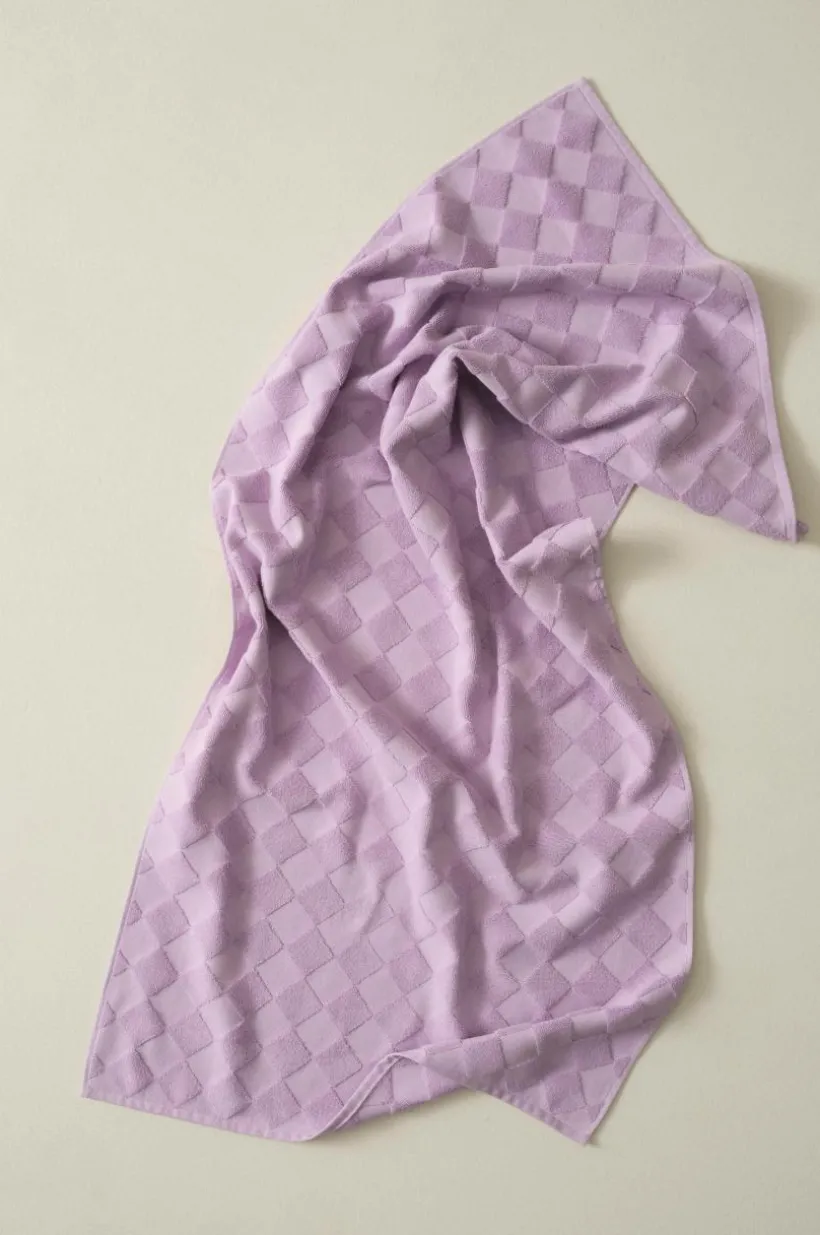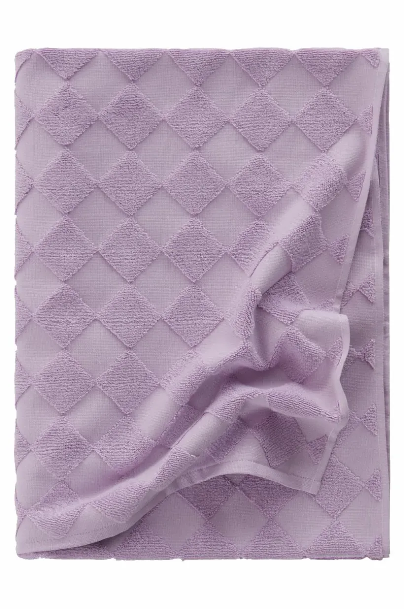 1-pack badhandduk i lyxig och snygg, enfärgad bomullsfrotté som är jacquardvävd. Det vävda rutmönstret är diagonalställt med slätvävda rutor och rutor vävda med öglor. Mönstret är motsatt på andra sidan. Den är dessutom vävd med dubbelgarn vilket ger exklusiv, kraftig känsla. Den lyxiga känslan förstärks av den snygga hängaren av svartvitt bomullsrep på långsidan. Frottén har bra uppsugningsförmåga och blir härligare ju mer den tvättas. Tillverkad i Portugal. Gramvikt 500 g/m².