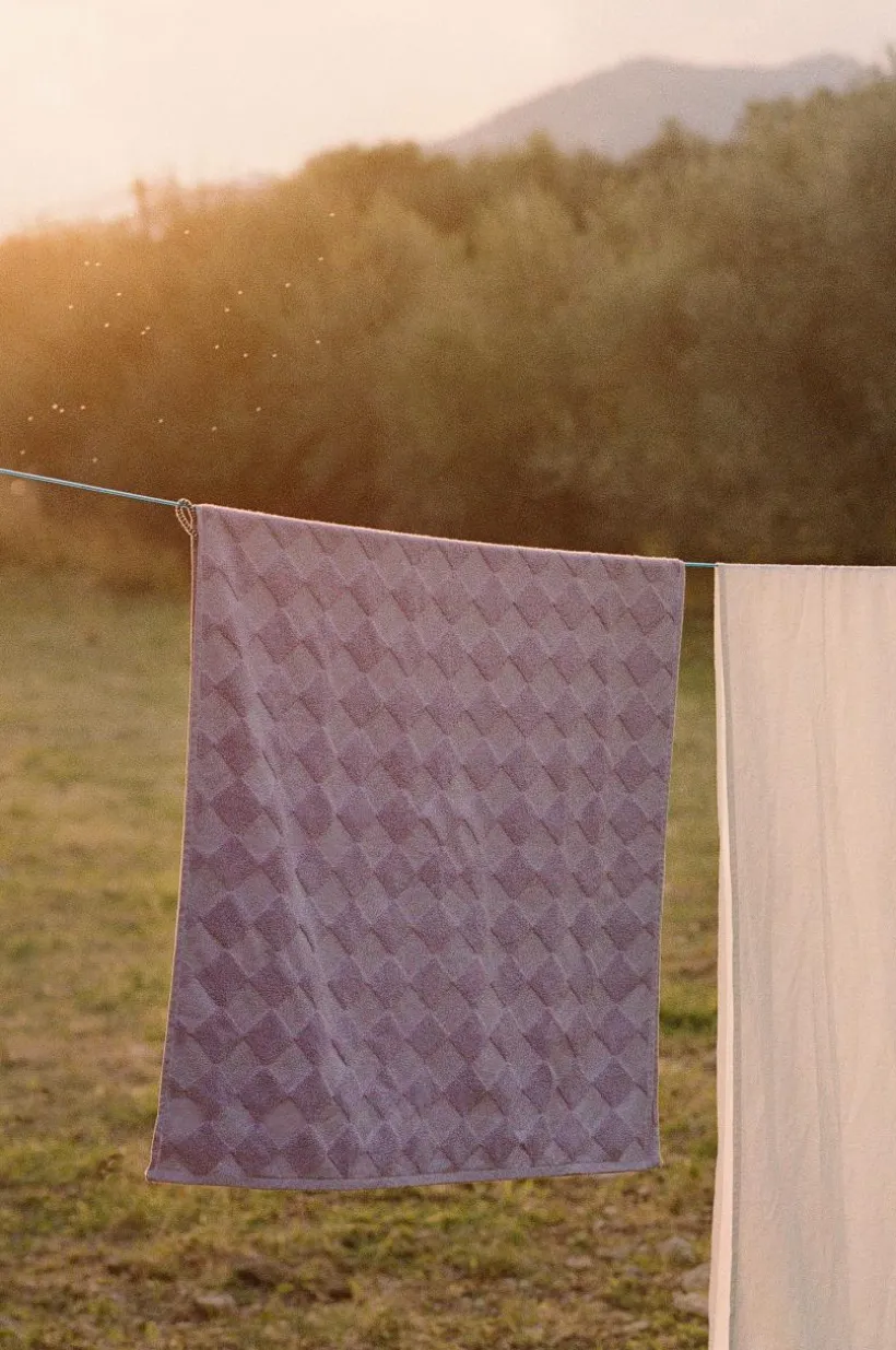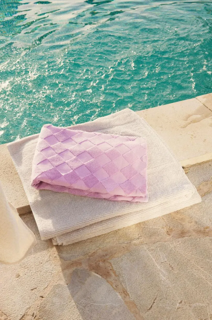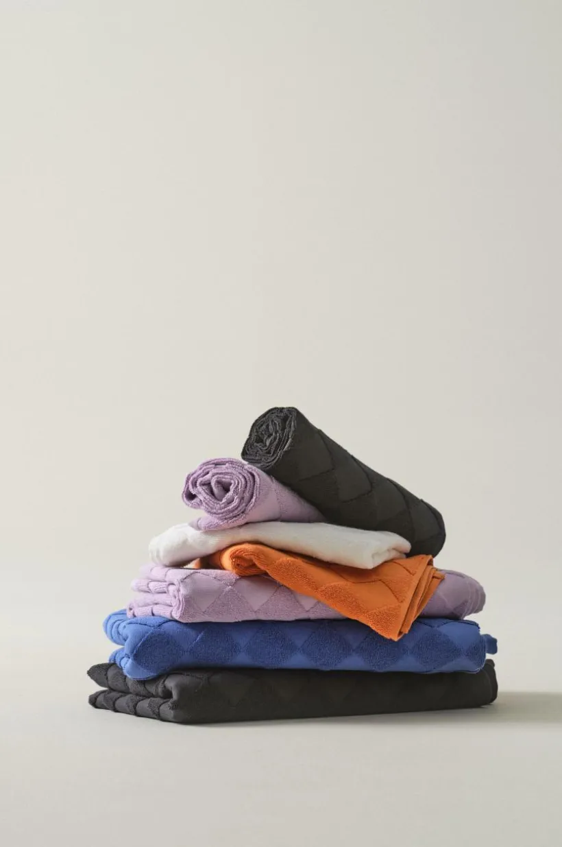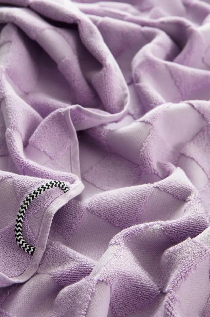 1-pack badhandduk i lyxig och snygg, enfärgad bomullsfrotté som är jacquardvävd. Det vävda rutmönstret är diagonalställt med slätvävda rutor och rutor vävda med öglor. Mönstret är motsatt på andra sidan. Den är dessutom vävd med dubbelgarn vilket ger exklusiv, kraftig känsla. Den lyxiga känslan förstärks av den snygga hängaren av svartvitt bomullsrep på långsidan. Frottén har bra uppsugningsförmåga och blir härligare ju mer den tvättas. Tillverkad i Portugal. Gramvikt 500 g/m².