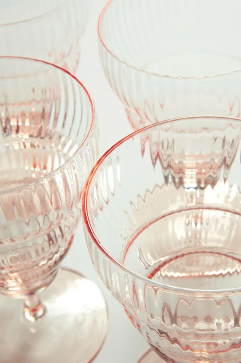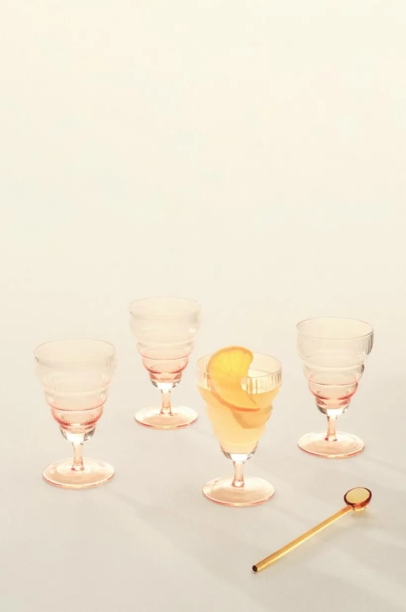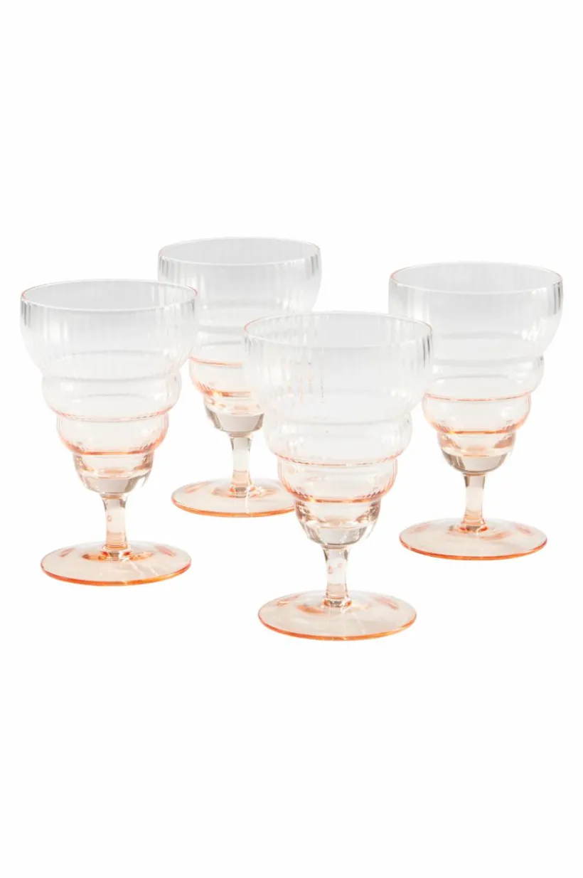 4-pack vinglas på fot. JOVI är bubbligt i formen med randig struktur och glaset är tonat i färgen från aprikosfärgad fot till klarglas upptill. Vinglaset JOVI passar fint till både vitt, rött, bubbel och rosé. Glaset är både festligt och avslappnat och till sommarens party är det en fullträff.