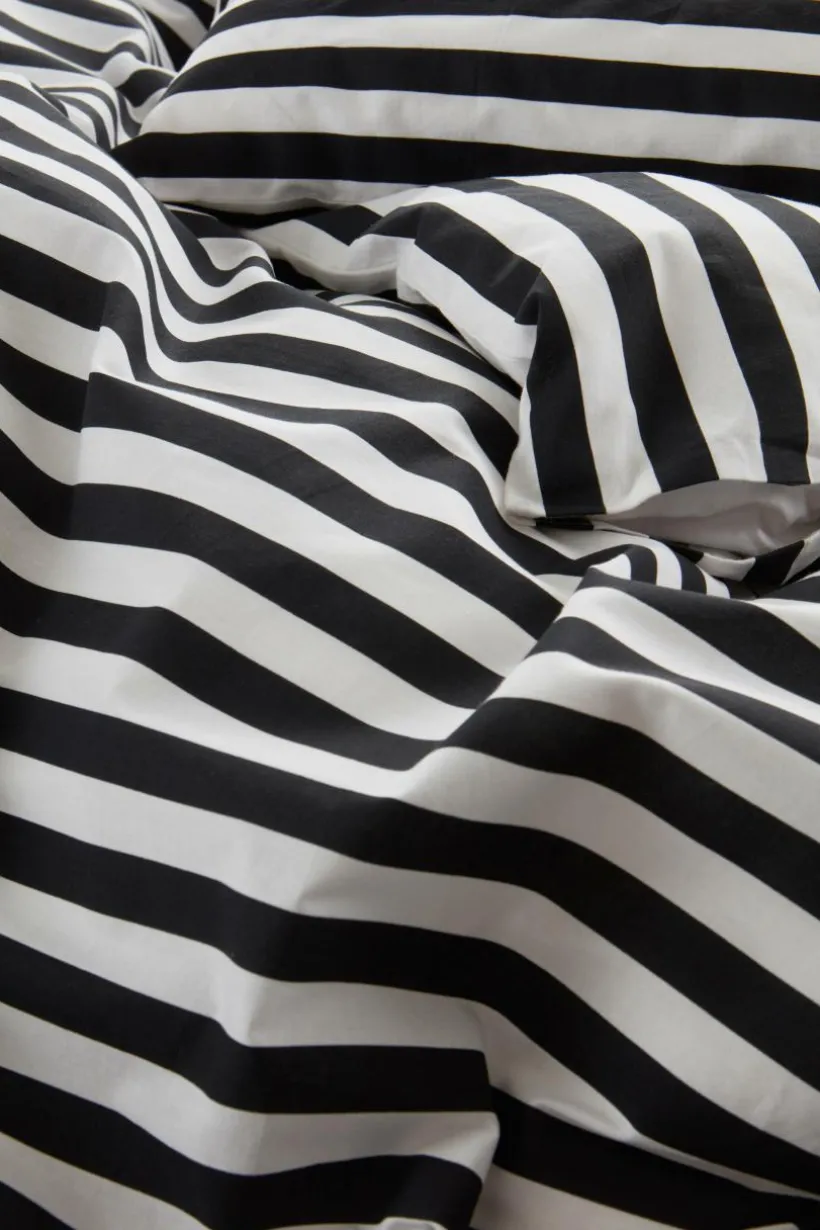 Randigt påslakanset i två delar, ett påslakan och ett örngott av bomull. Den tvärgående randningen är tryckt i fräscha, somriga färger och på båda sidor av örngott och påslakan. Bomull är en mjuk och behaglig kvalité som känns sval mot huden. Öppning i övre hörnen på påslakanet, som underlättar att trä påslakanet över täcket. Trådtäthet på 144 tc. (Trådtätheten talar om antalet trådar, thread counts, per kvadrattum i ett tyg. Ju högre trådtäthet desto högre kvalité. Med undantag för linne som ofta vävs glesare för att få den rätta känslan.)